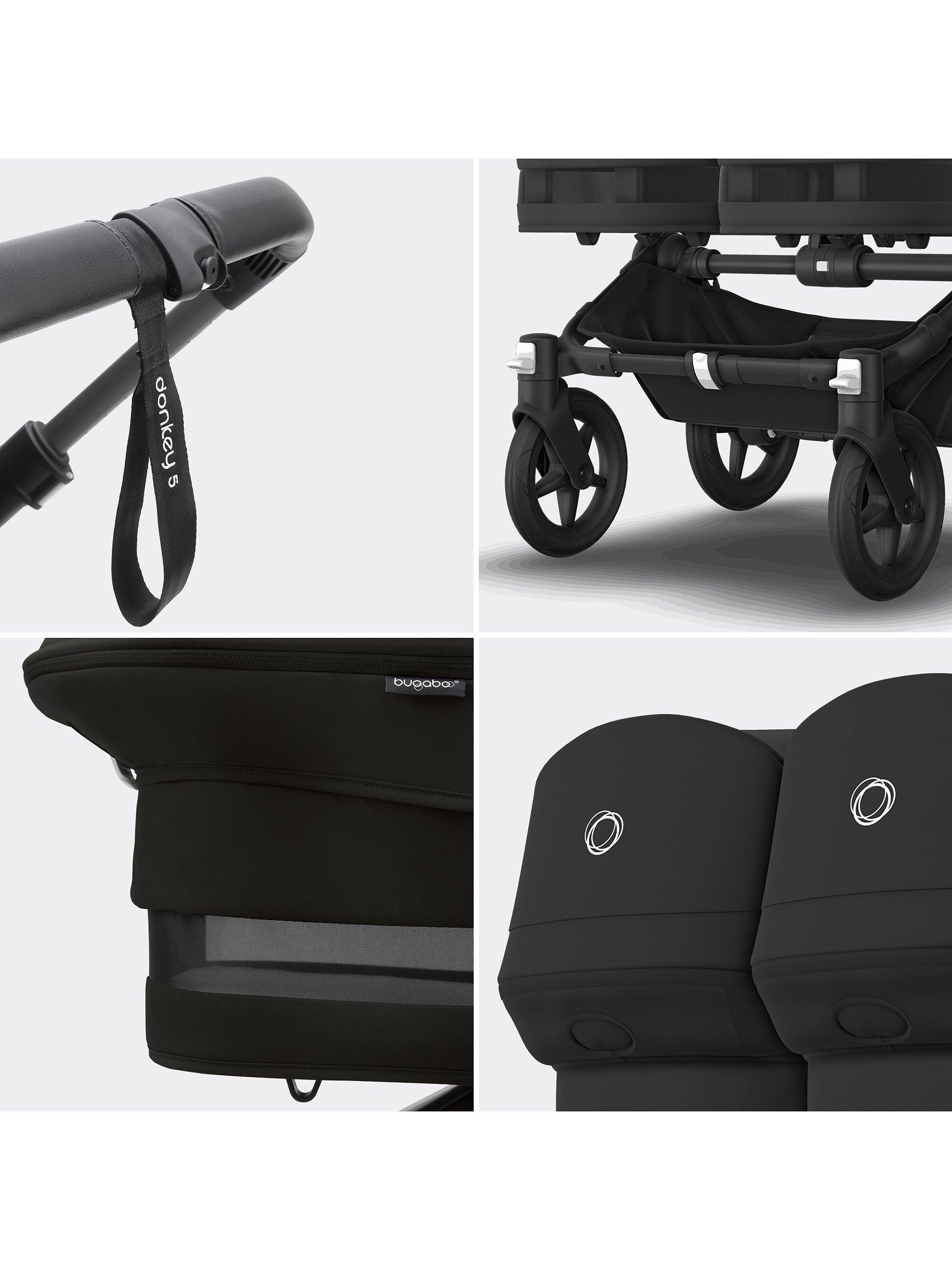 - This item contains the complete Bugaboo Donkey 5 Mono including a chassis with handlebar and carry handle, wheels, seat frame, canopy wires, canopy clamps, rain cover, seat fabric with comfort harness, bassinet stiffeners, bassinet bottom, bassinet fabric with mattress, apron, sun canopy fabric, side luggage basket and underseat basket