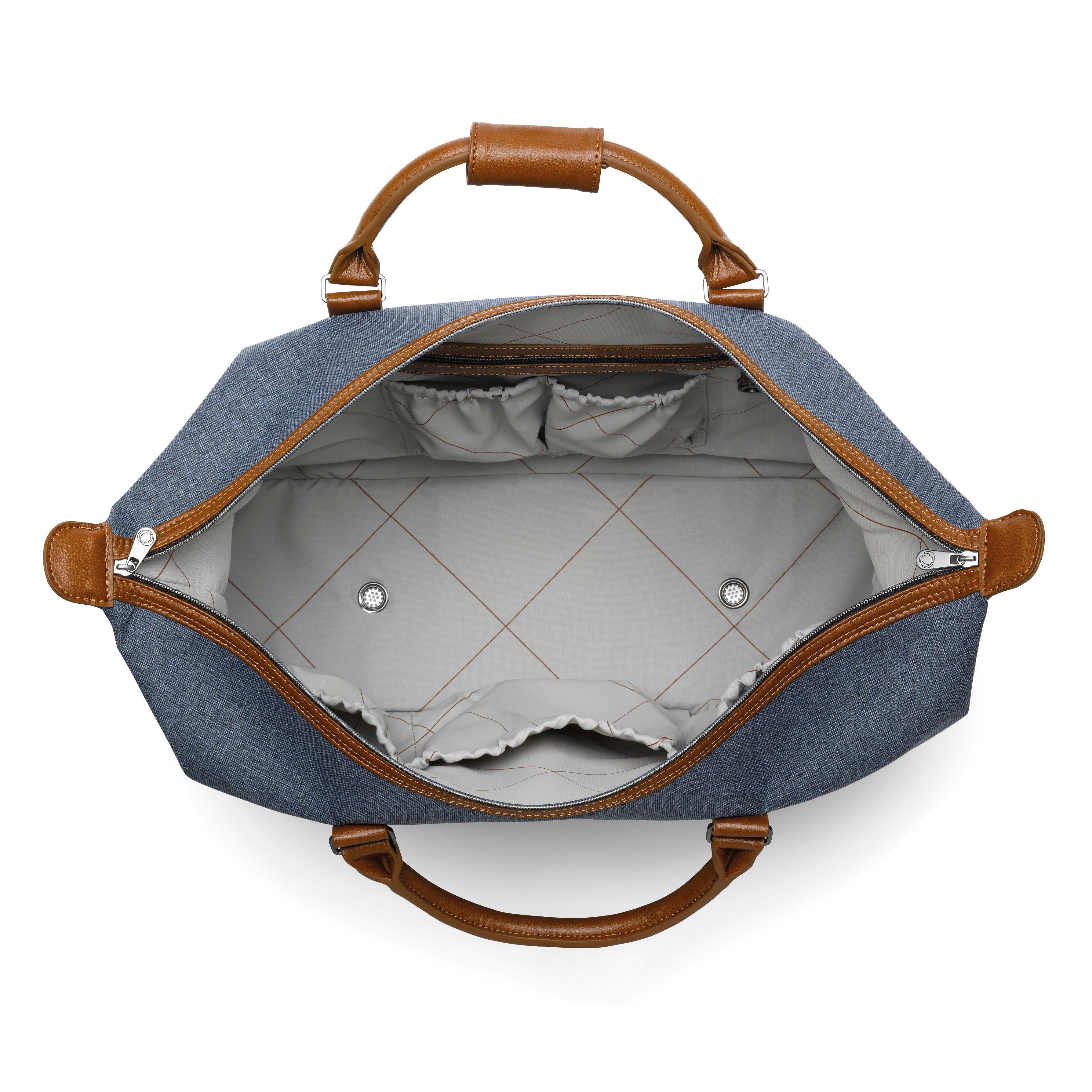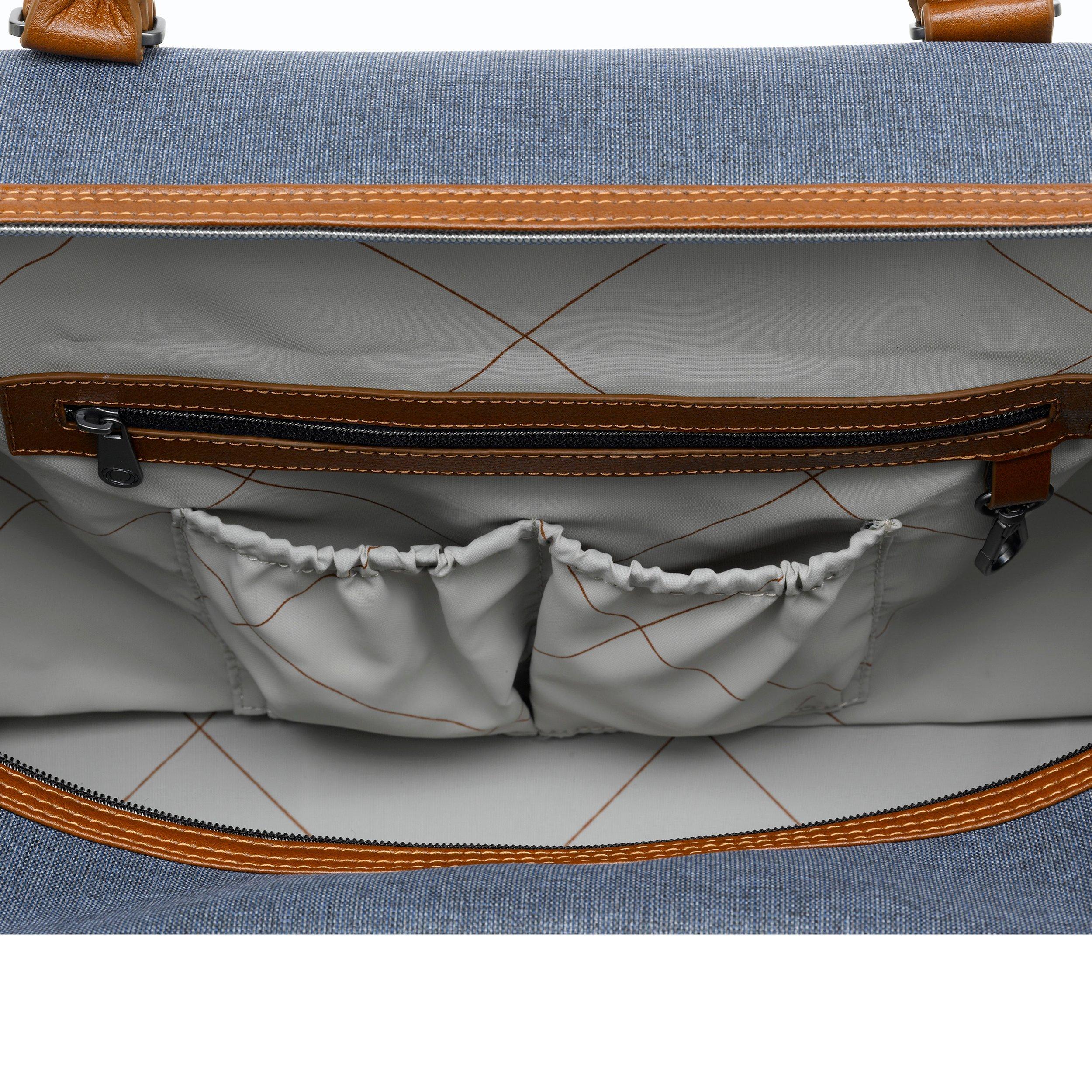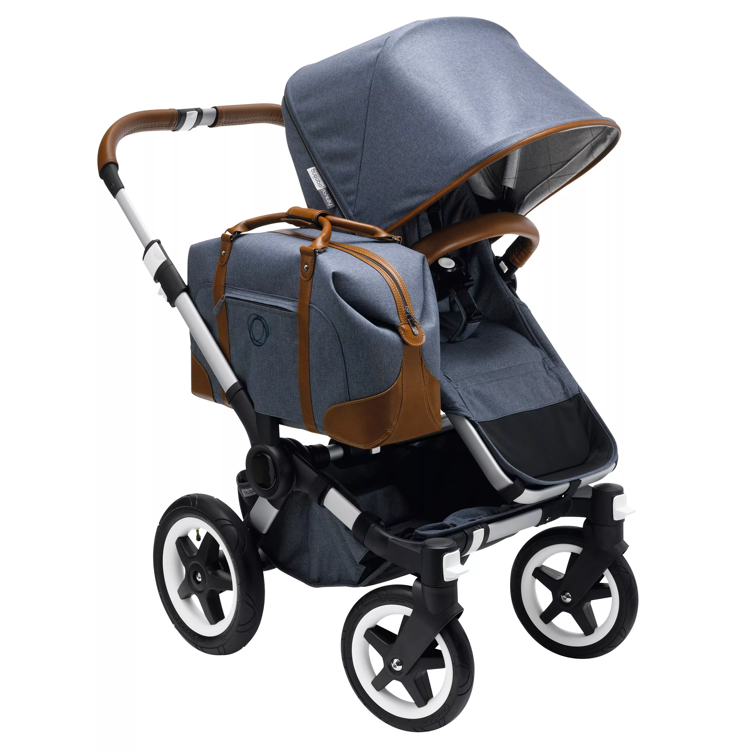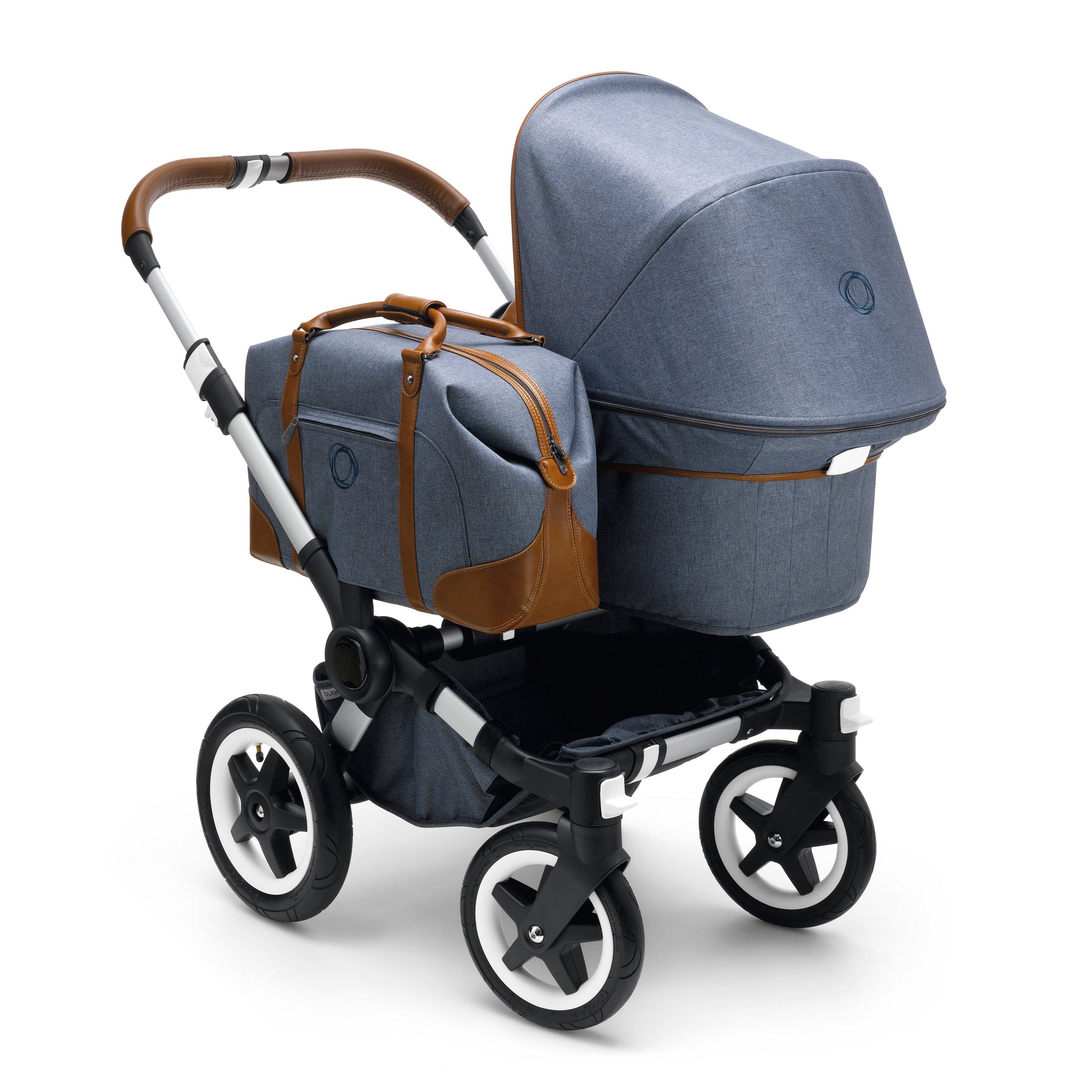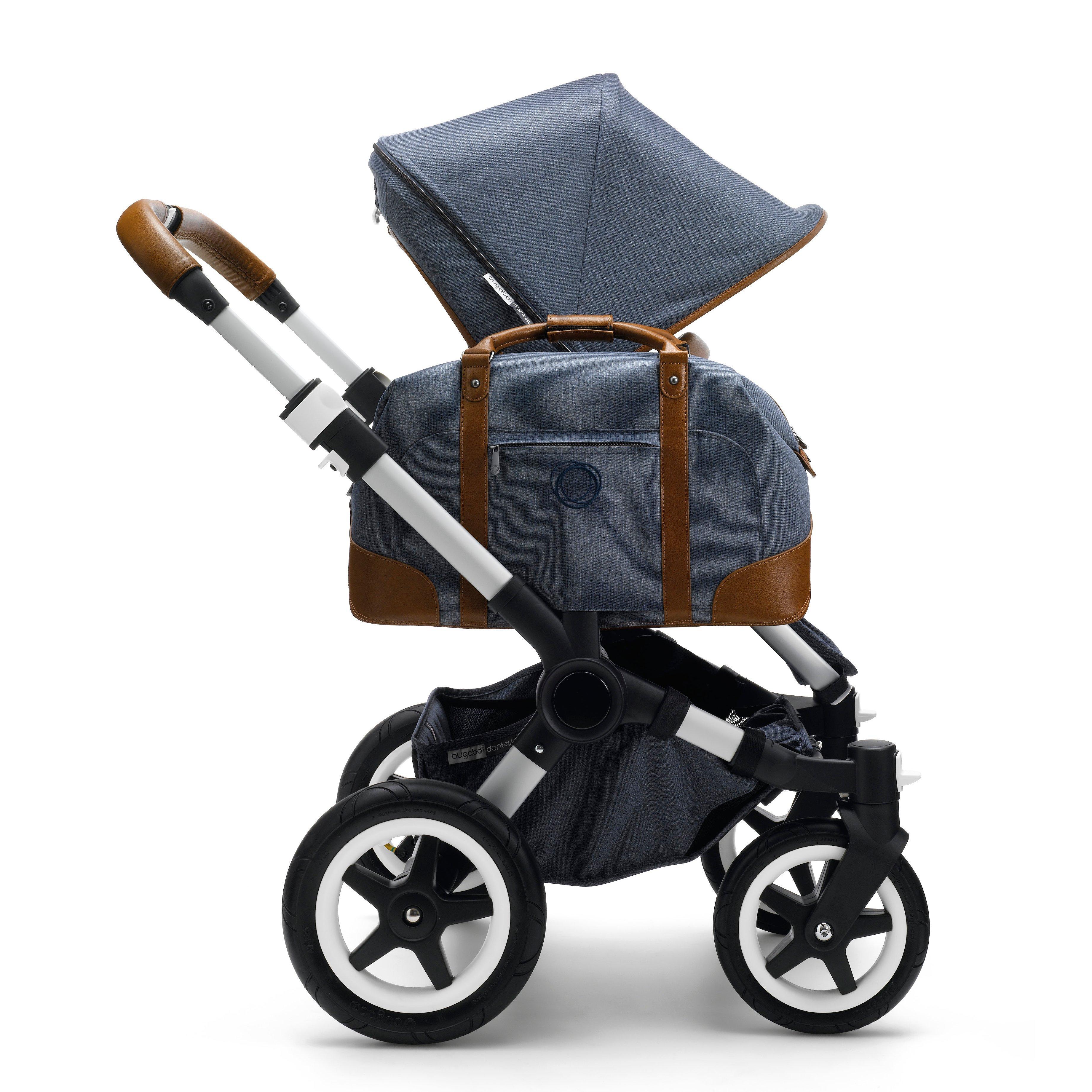 Comfortable, functional and elegant, the bugaboo donkey weekender comes with a blue-grey outer fabric, casual grey jersey lining, cognac hand-stitched leather-look handlebar and carry handle, and leather details on the sun canopy