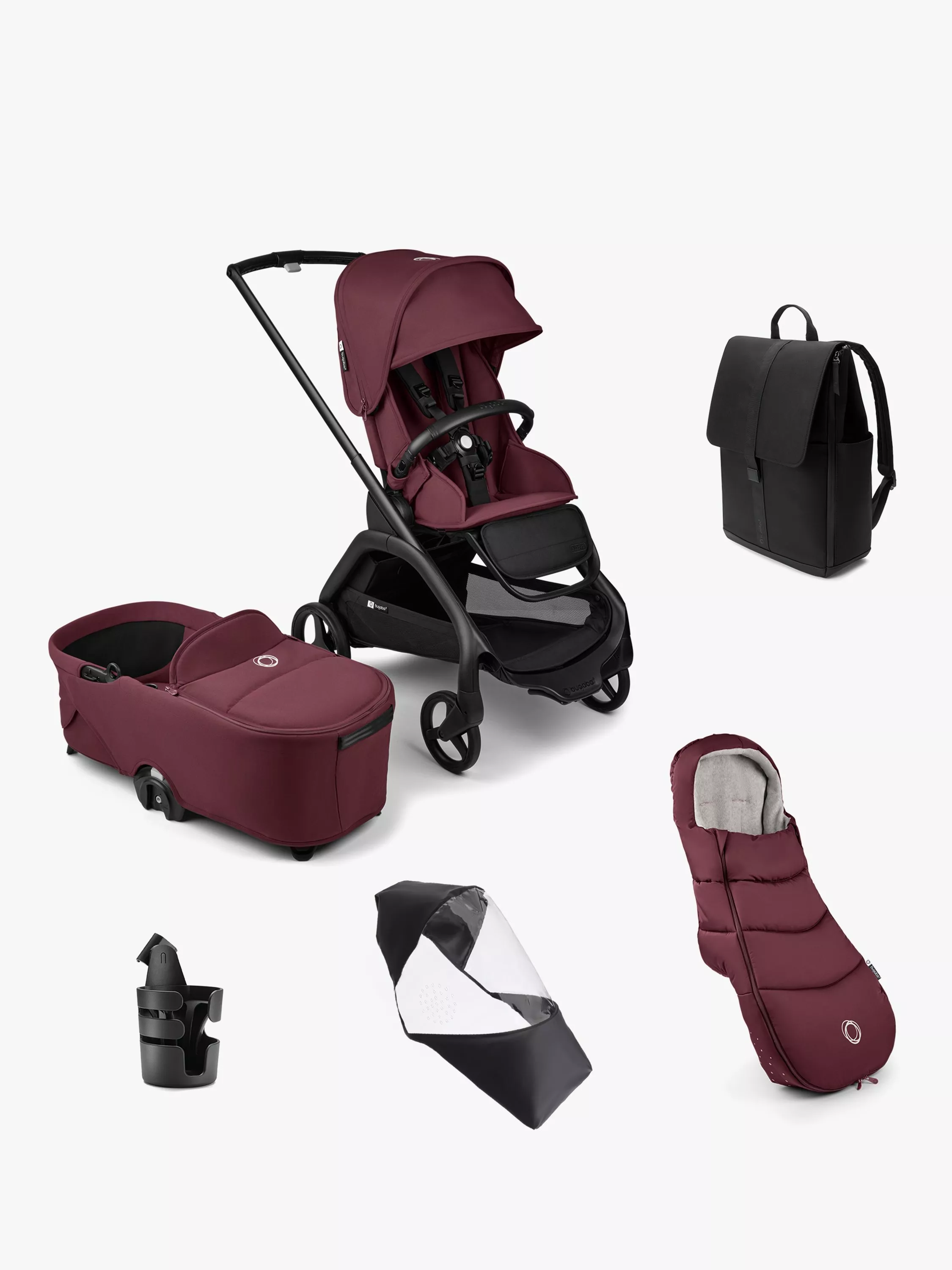 The essentials sorted. This bundle from Bugaboo gives you the complete Bugaboo Dragonfly pushchair with the matching carrycot, footmuff, and changing bag as well as a compatible cup holder and rain cover.