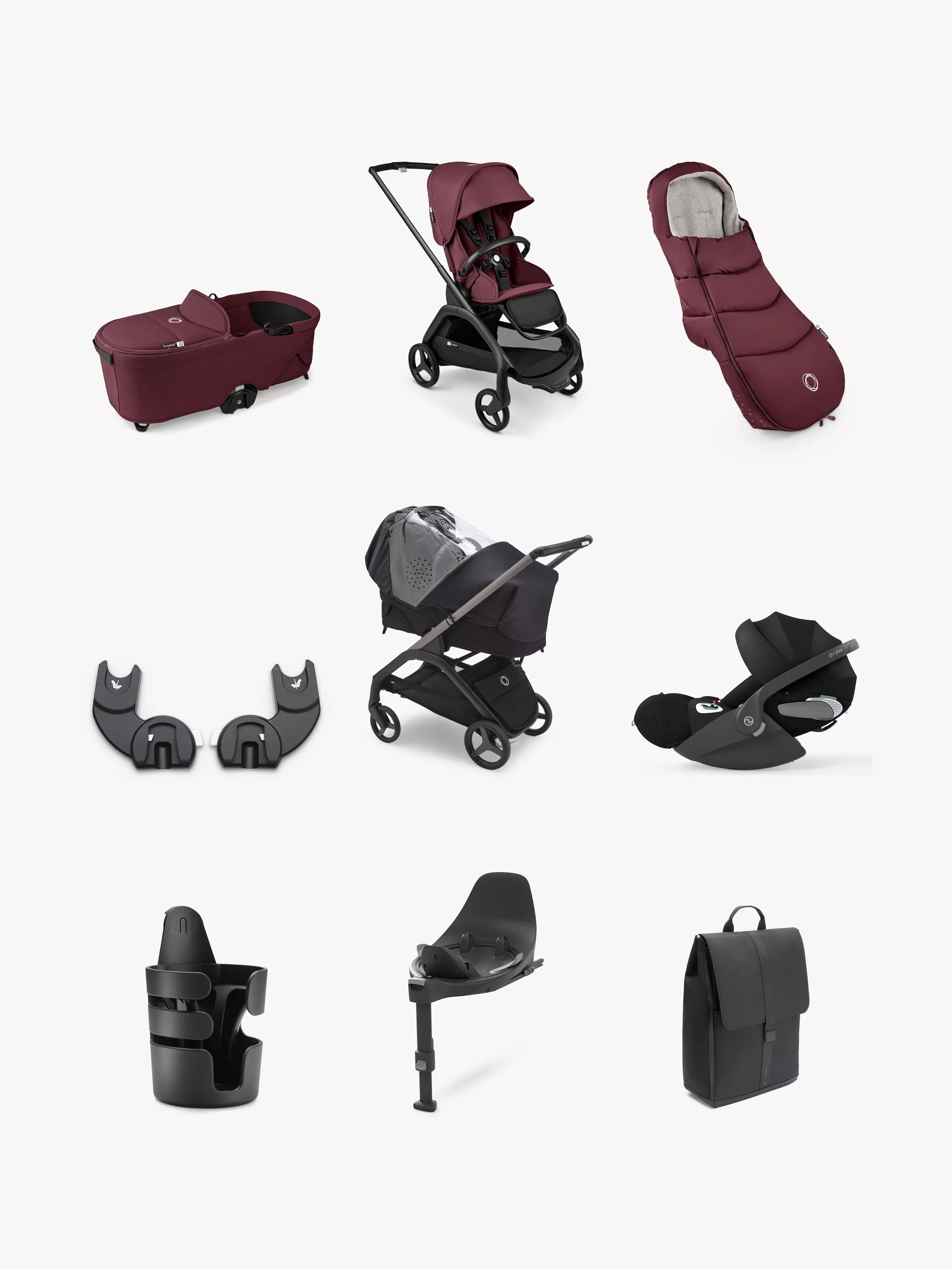 BugabooDragonfly Pushchair, Carrycot & Accessories with Cybex Cloud T i-Size Rotating Car Seat & Base Bundle, Dark Cherry