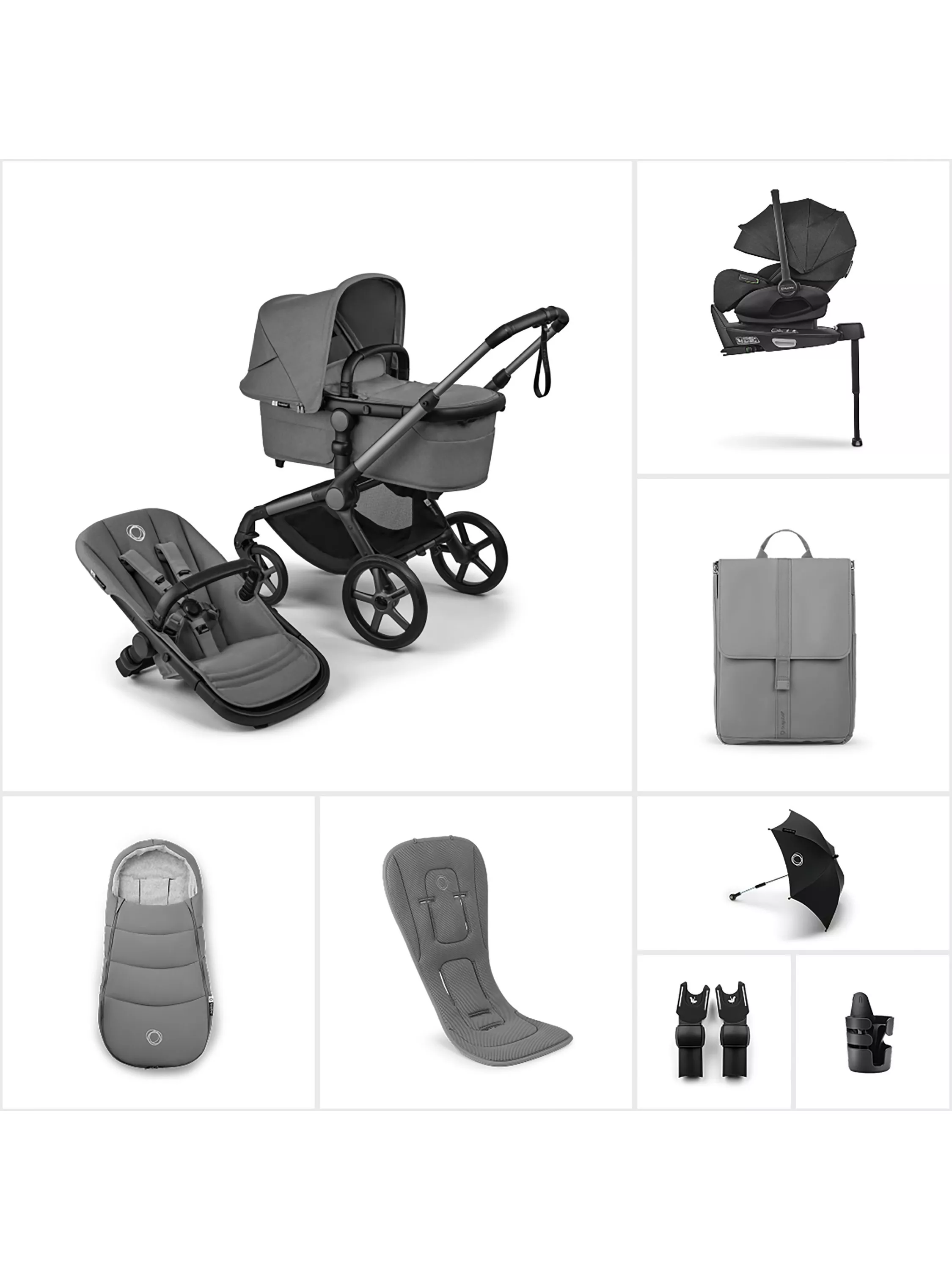 Curated around the all-terrain Fox 5 Renew pushchair, this ultimate bundle includes essential accessories, a car seat and a base for a complete travel system.