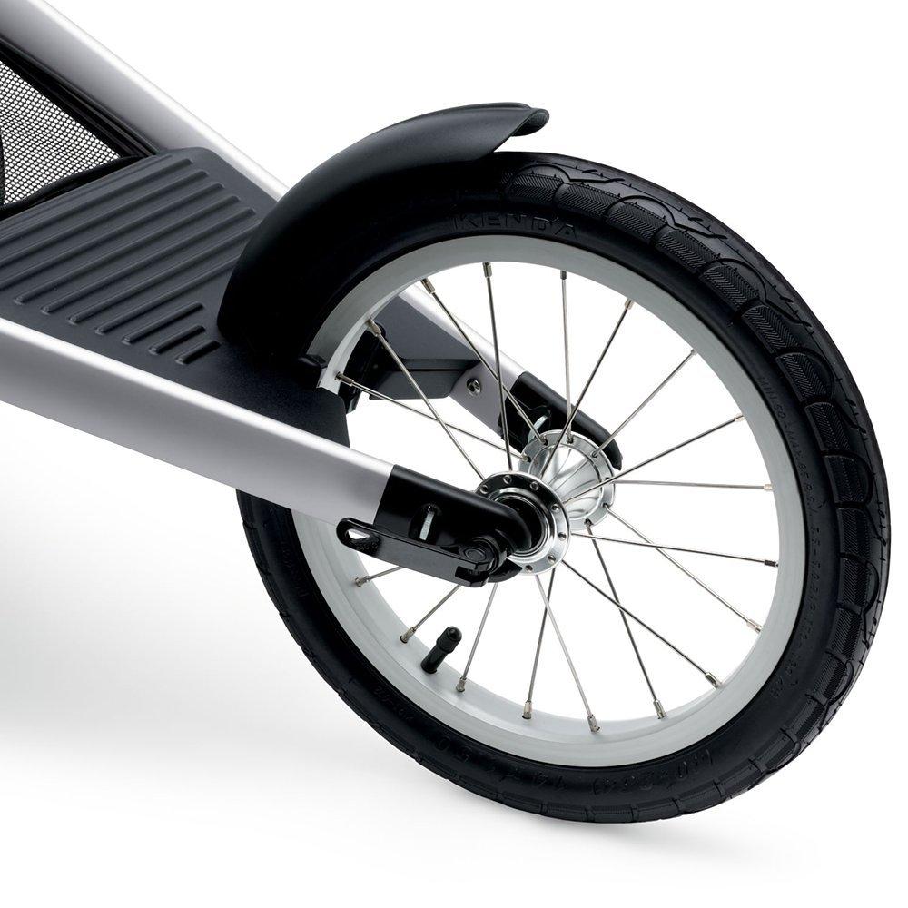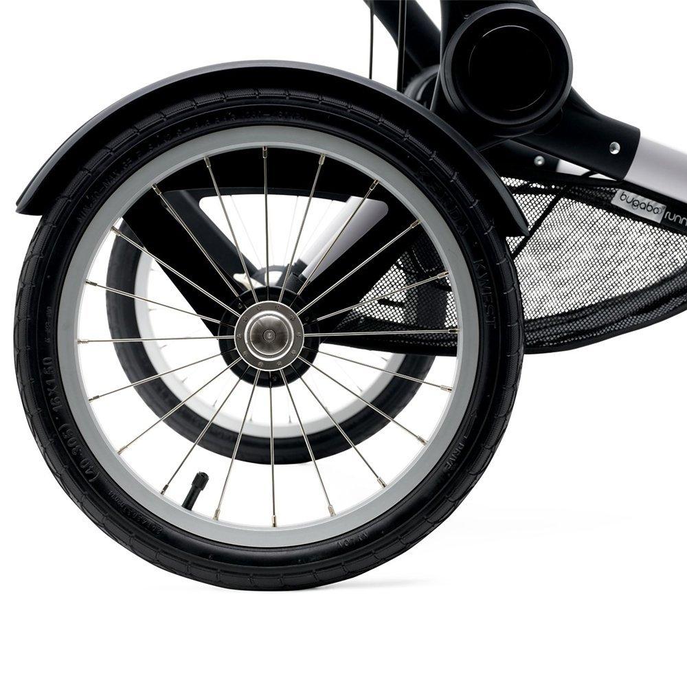 A smooth run is important, which is why the Bugaboo Runner has large wheels with air-filled tyres and a unique suspension system that absorbs any bumps along the way. The three-wheel base allows for a stable ride and the front wheel is fixed to make sure you can run in a straight line. The adjustable handlebar ensures you have an ergonomic running position.