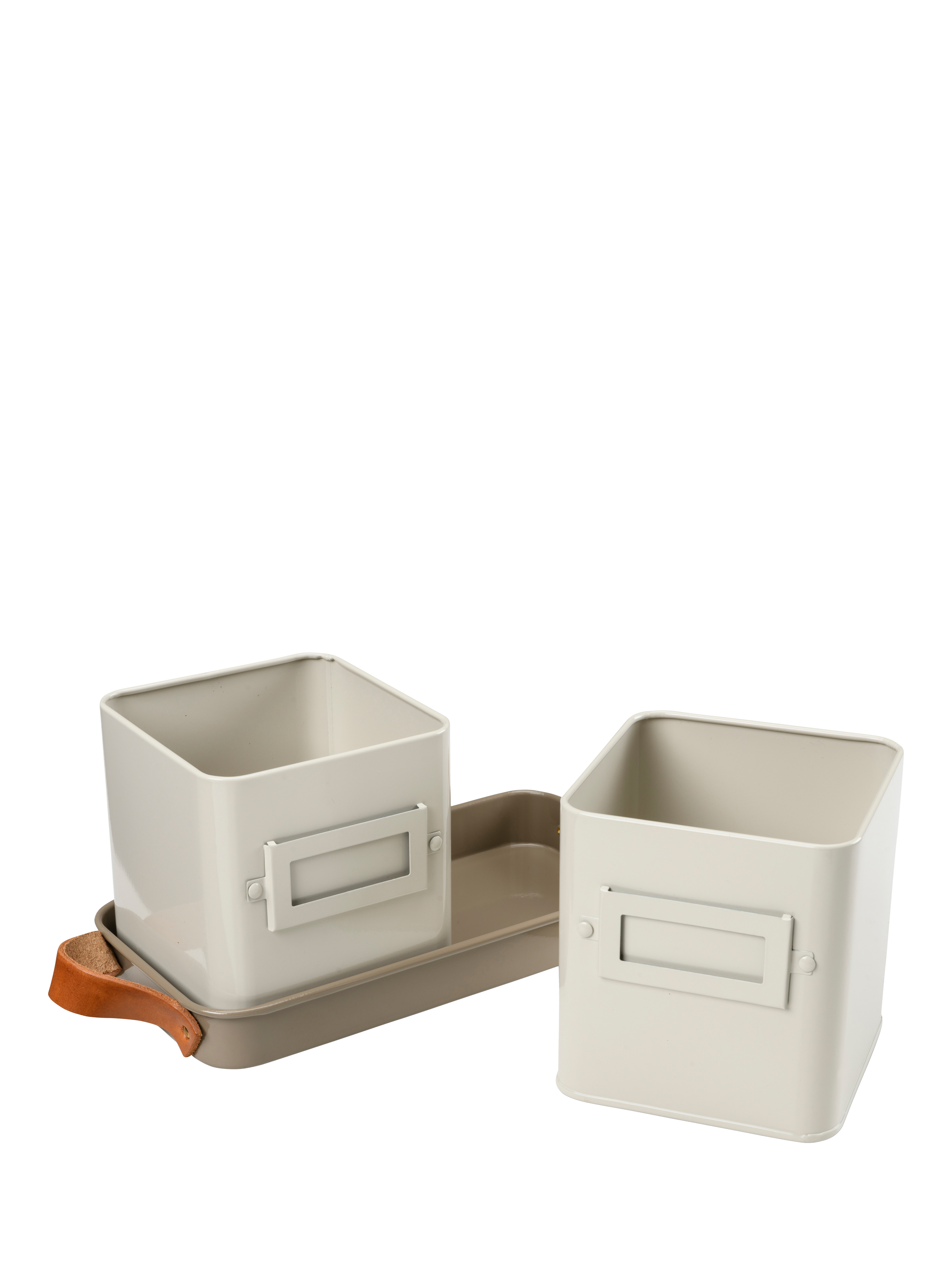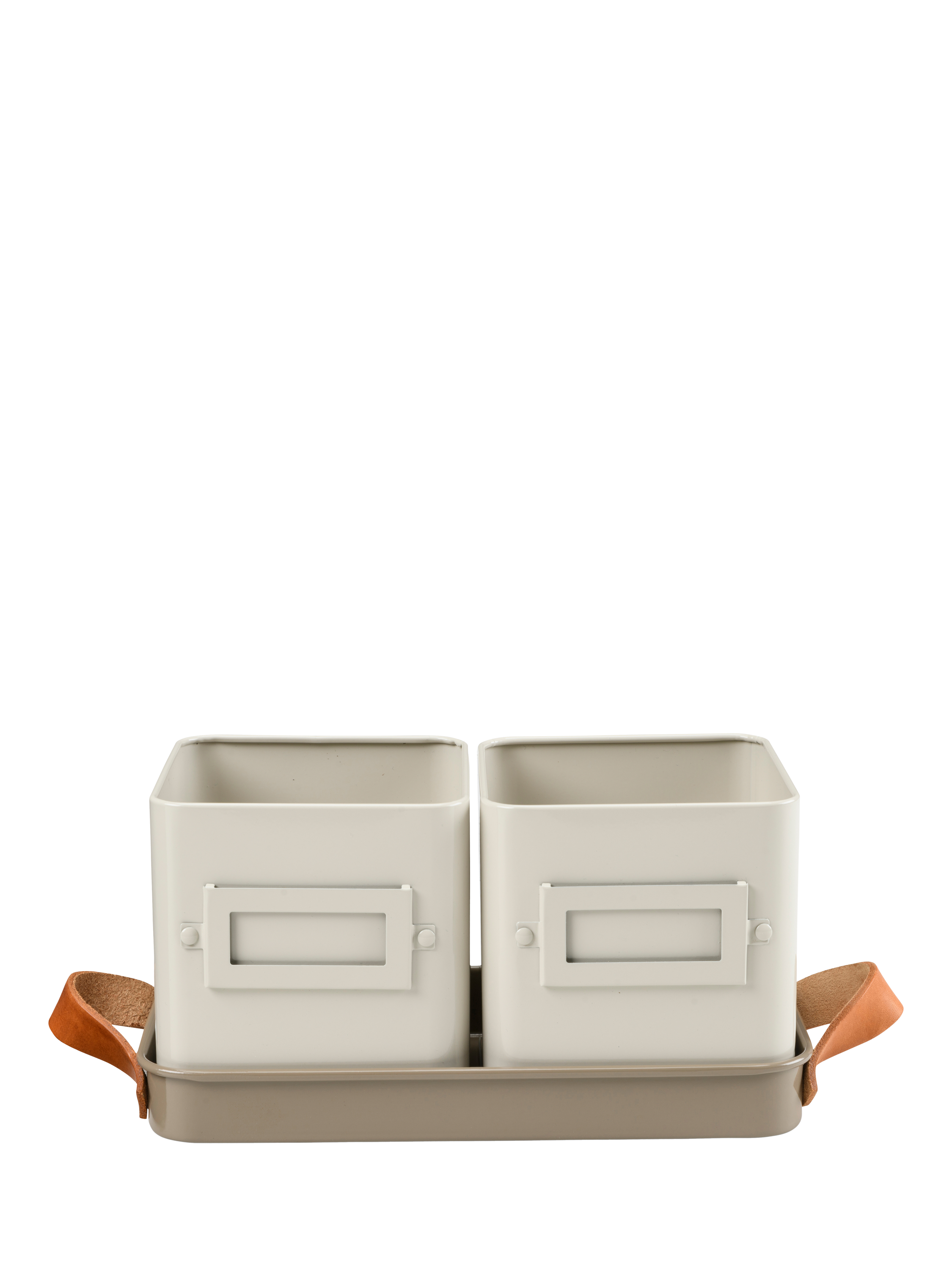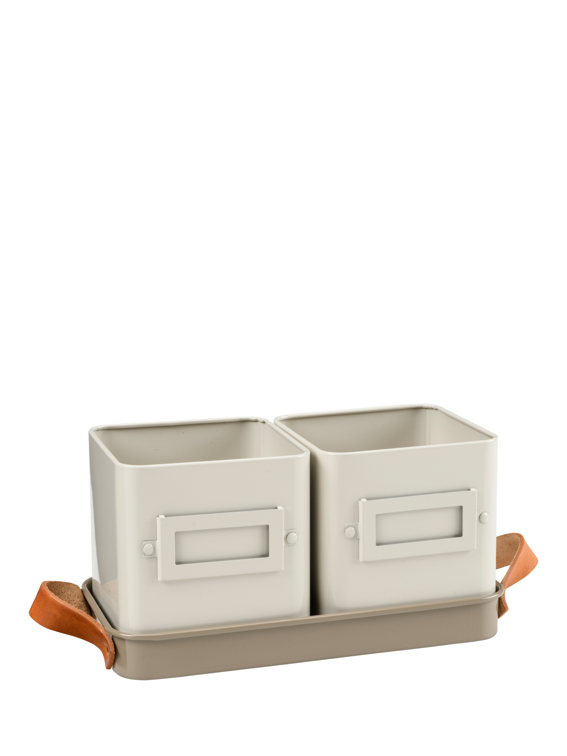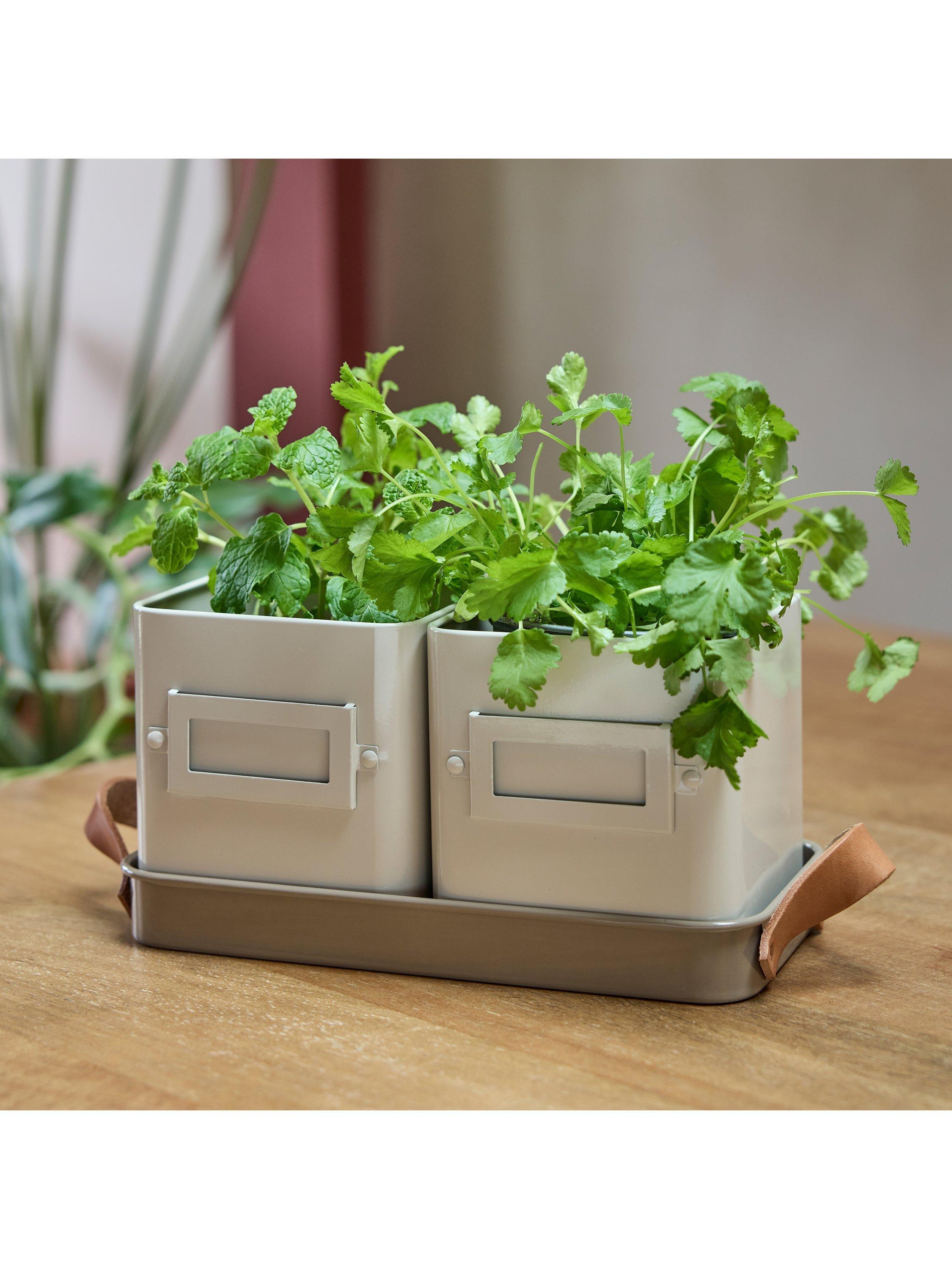 Create a windowsill herb garden with this set of two herb pots. Your favourite herbs can always be at hand to give your dishes the flair of fresh flavours. Sized to hold supermarket potted herbs or grow your own from seed. Designed with leather handles for easy carrying, a tray to catch water and nameplates on the two herb pots.
