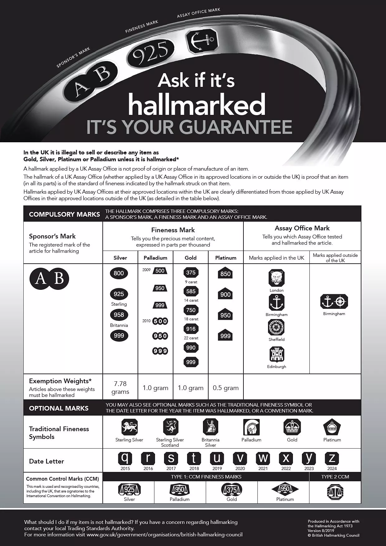 A jewellery hallmark comprises three compulsory marks: a sponsor's mark, a fineness mark and an Assay Office mark. This Hallmarking Dealer's Notice explains the approved hallmarks.