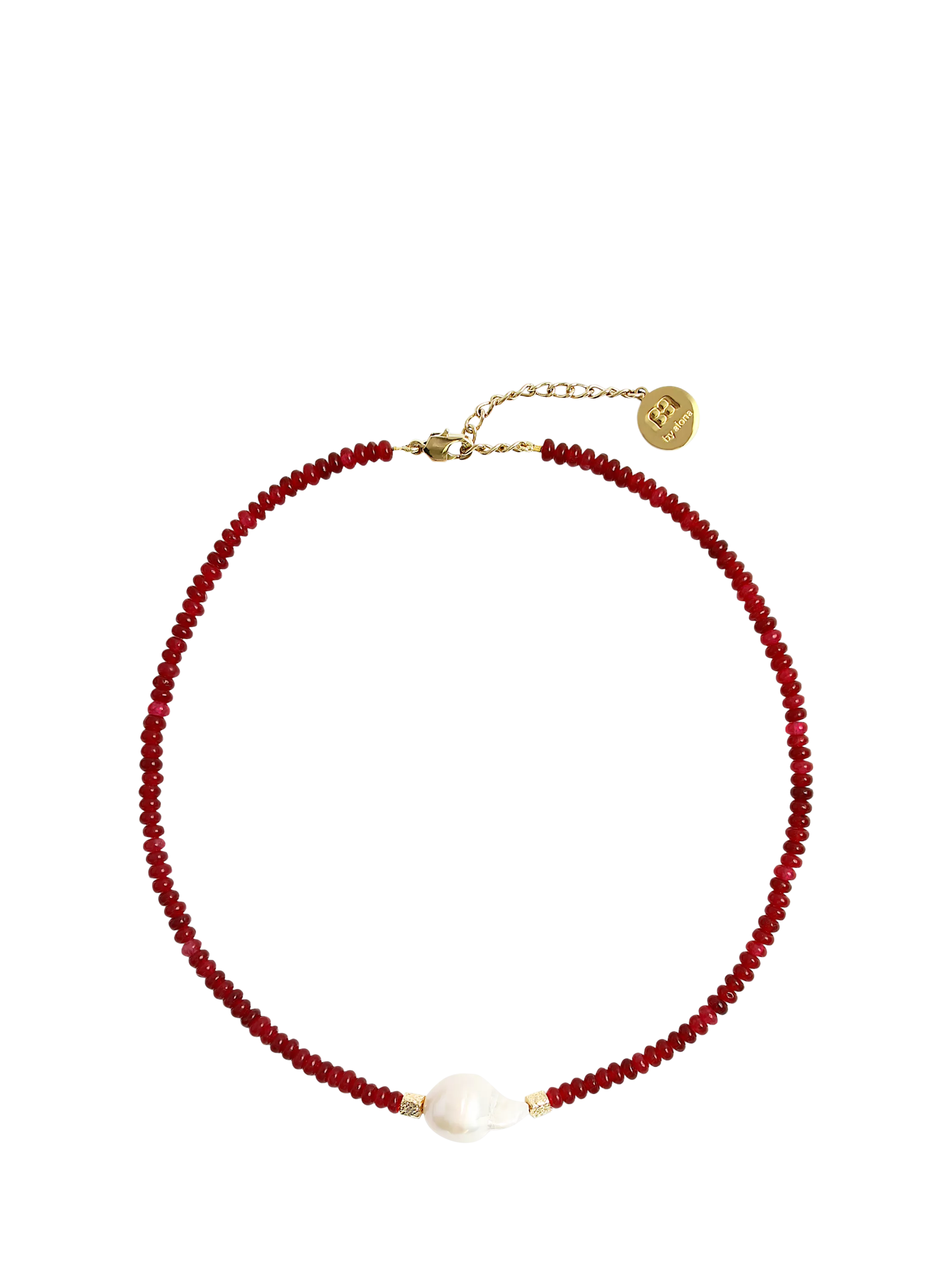 The stunning Verity necklace is made from hand strung red jade button beads, finished with a large baroque pearl and 18k gold plated cube beads.