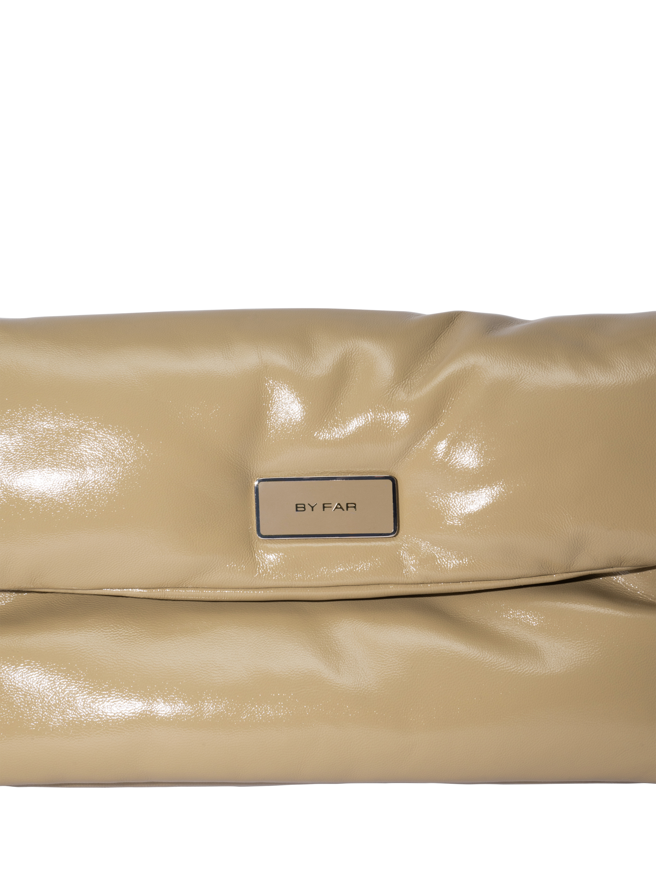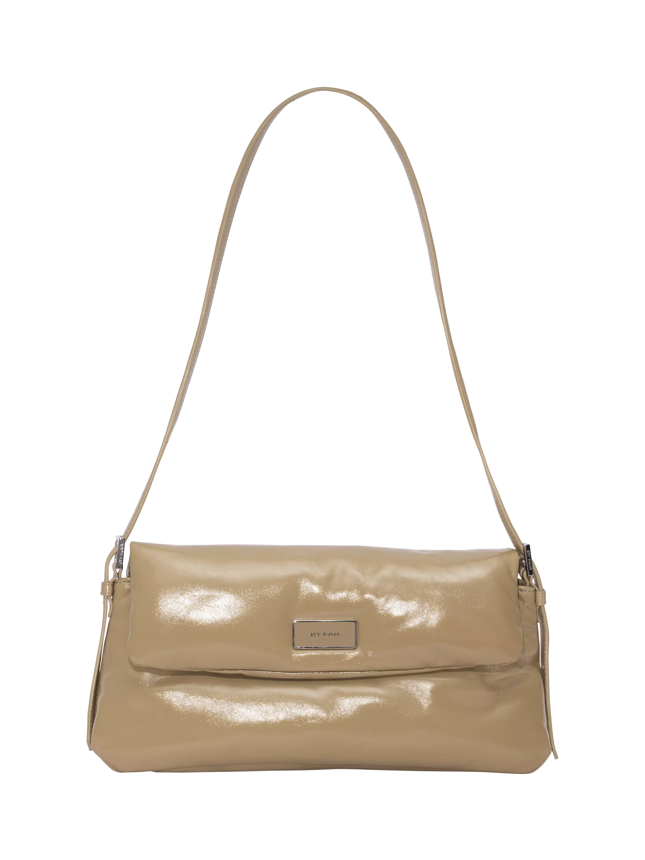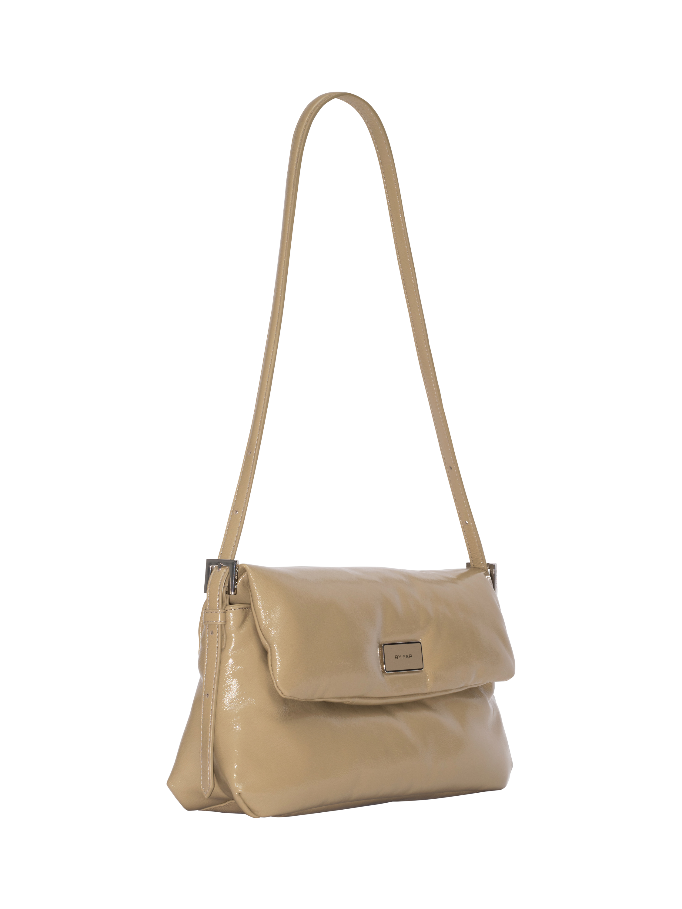 A padded leather shoulder bag from BY FAR, with an adjustable strap and a magnetic flap closure. Features a metal logo plate, branded buckles, a large inside pocket, and a raised logo. Finished with black synthetic lining.