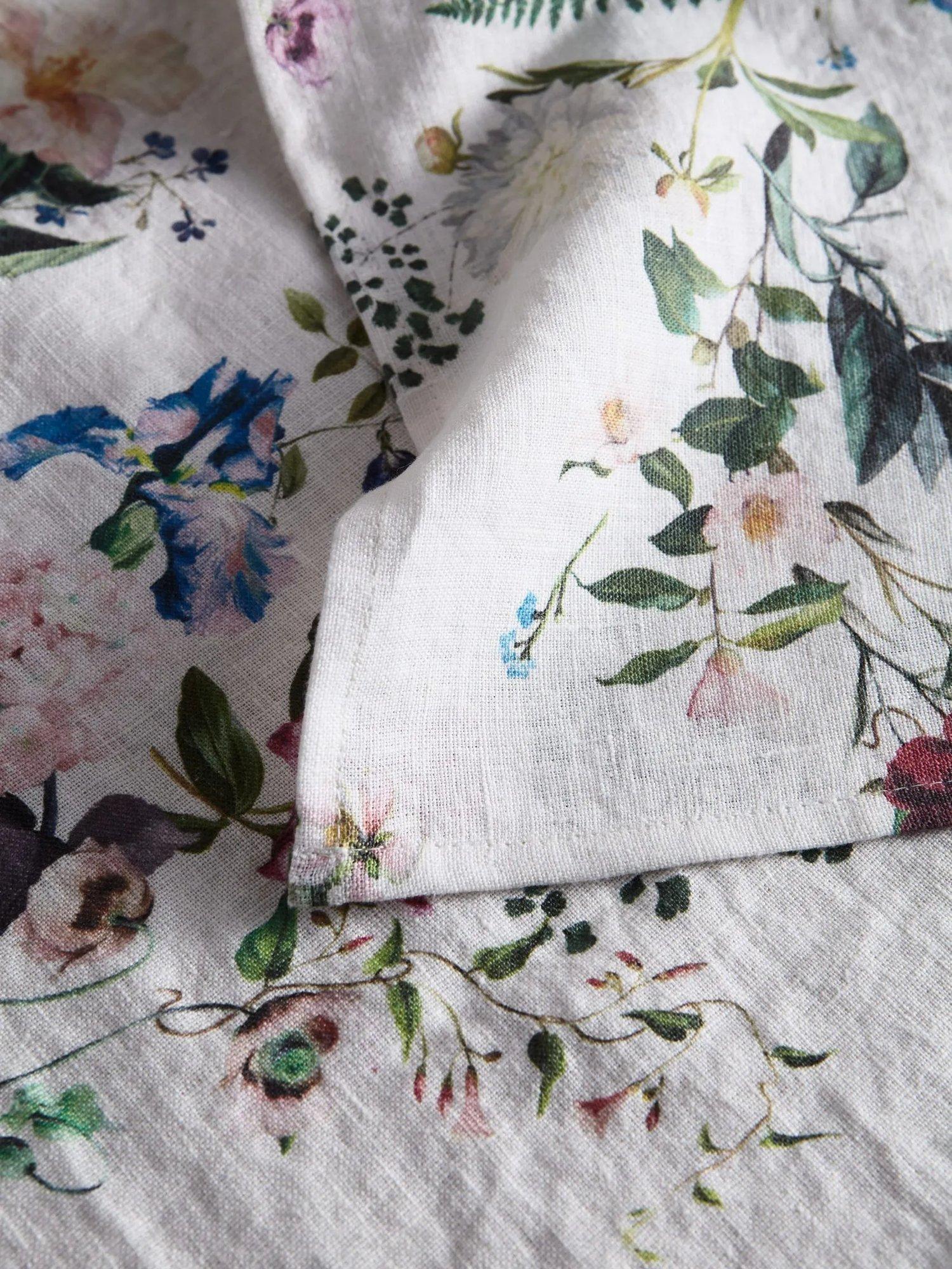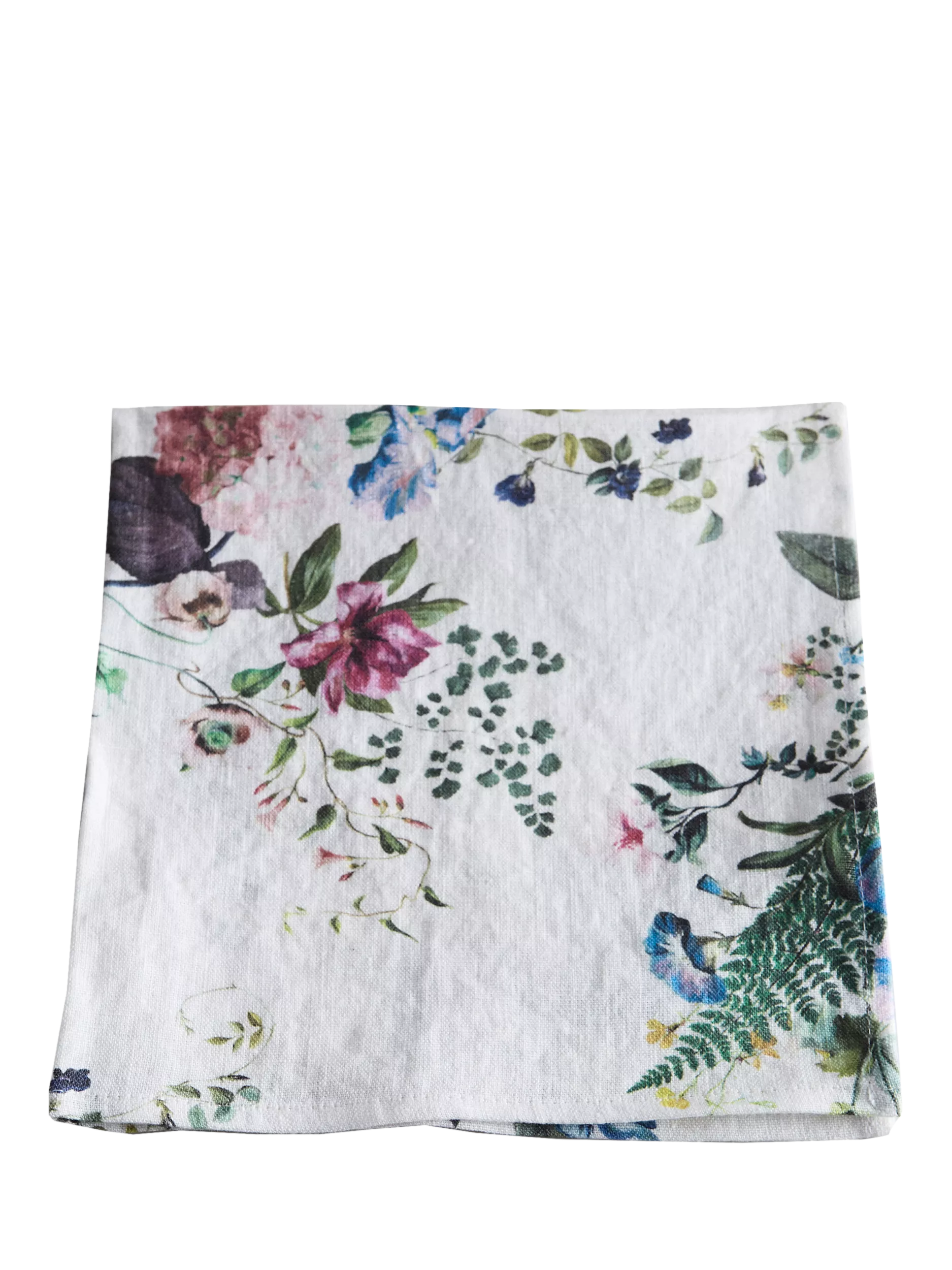 Bouquets of hydrangeas, anemones and foxgloves adorn this Flora napkin, printed onto 100% European washed linen. Team it with the matching table runner for a coordinated look.