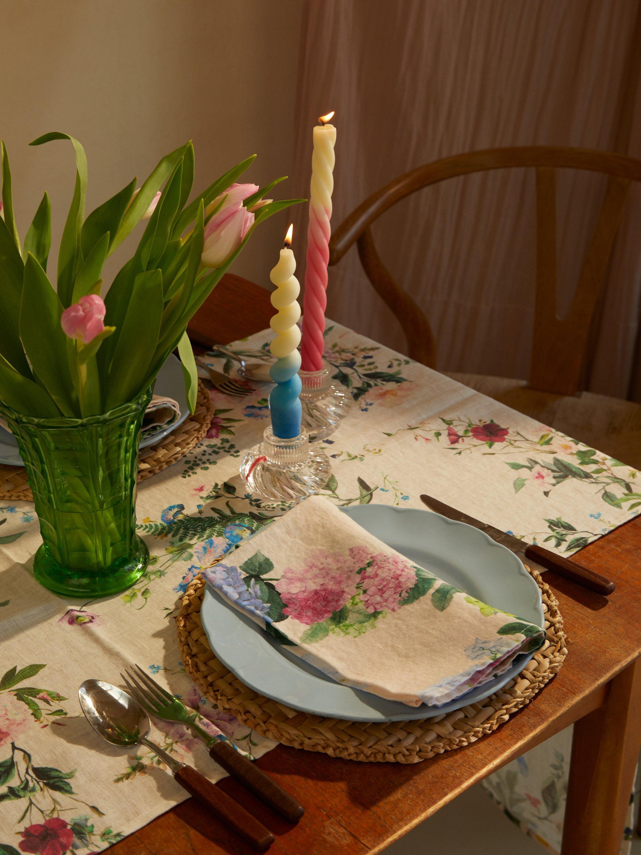 Bouquets of hydrangeas, anemones and foxgloves adorn this Flora table runner, printed onto 100% European washed linen. Team it with the matching napkins for a coordinated look.