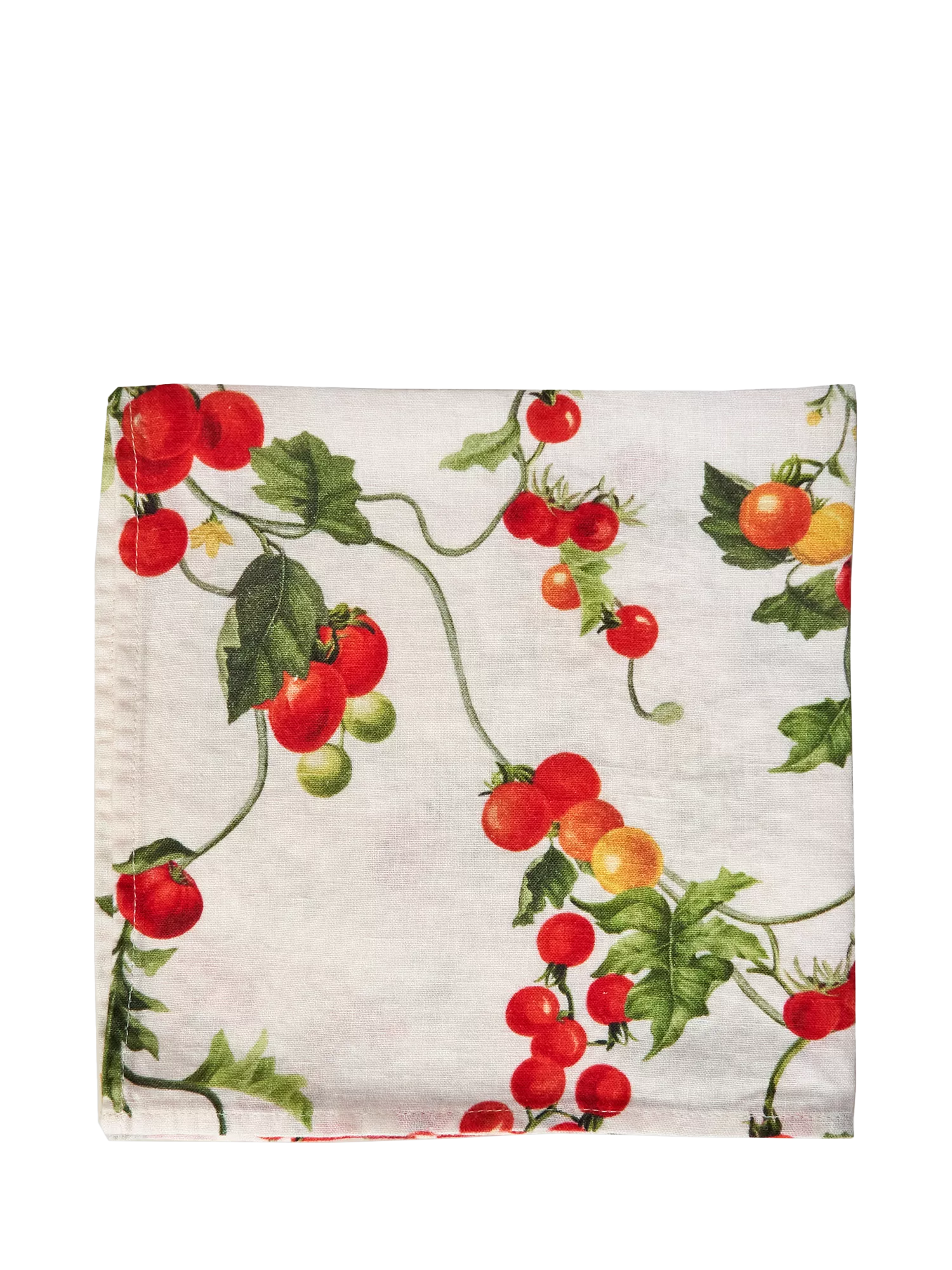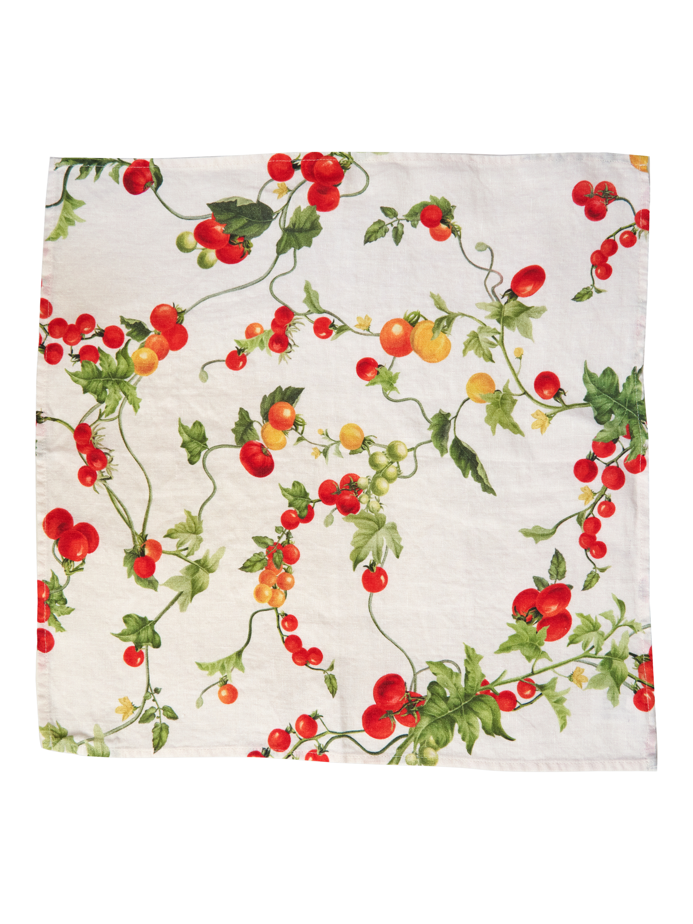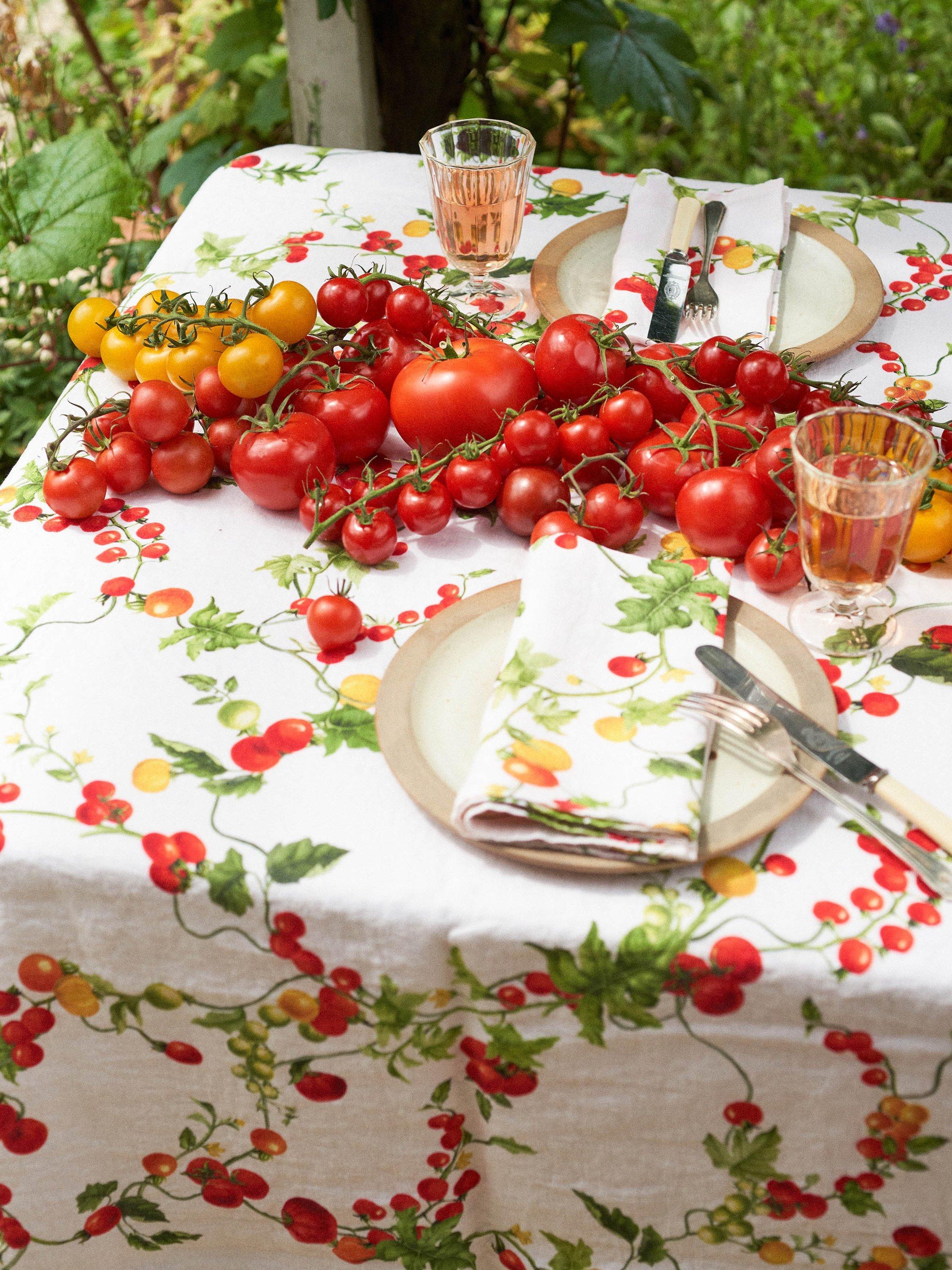 Ciao! from By Hope's Pomodoro collection. Tomato vines, full and fruitful, adorn this linen napkin. Bring it to the table as we welcome summer, and for those happy, sun-soaked days when the light lasts, and long, leisurely lunches move outdoors.