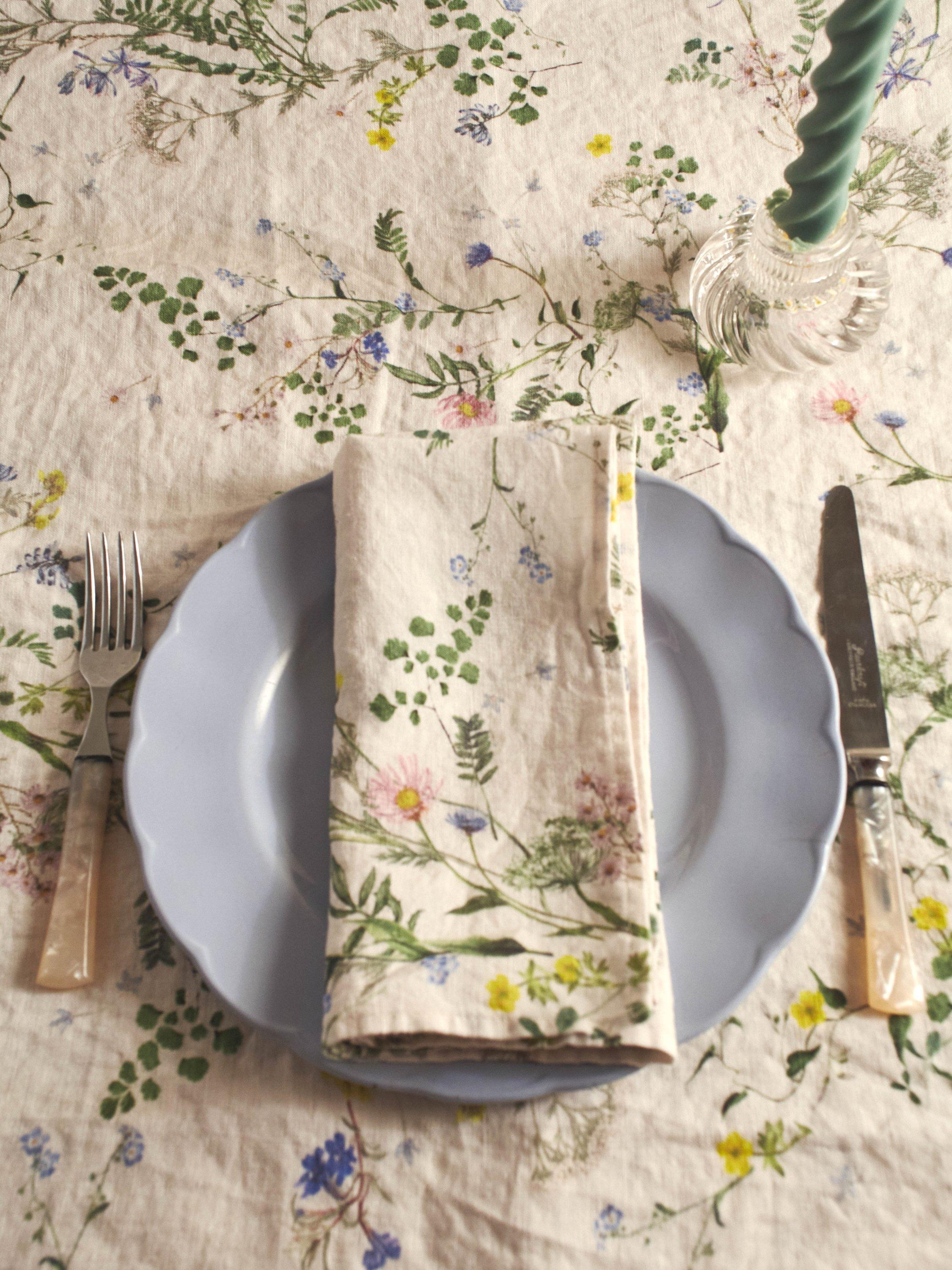 The Posy napkin is inspired by countryside hedgerows and meadows and spring colours of blues, yellows, greens and pops of pink to refresh your table all year round. Printed onto 100% European washed linen. Team it with the matching tablecloth for a coordinated look.
