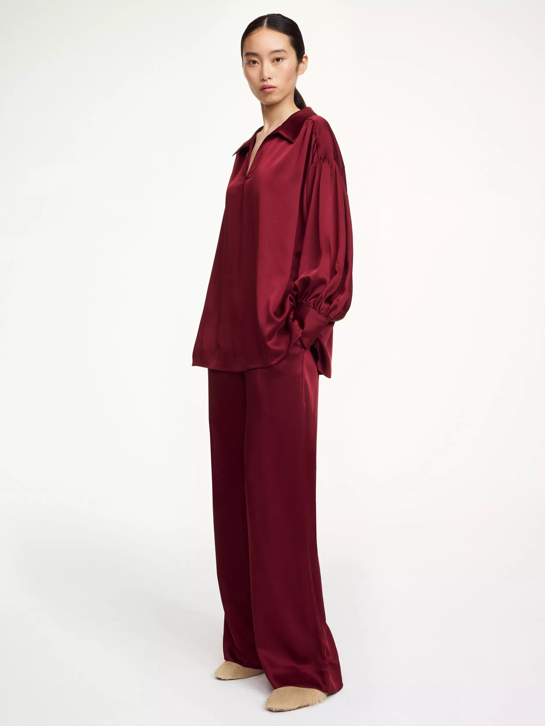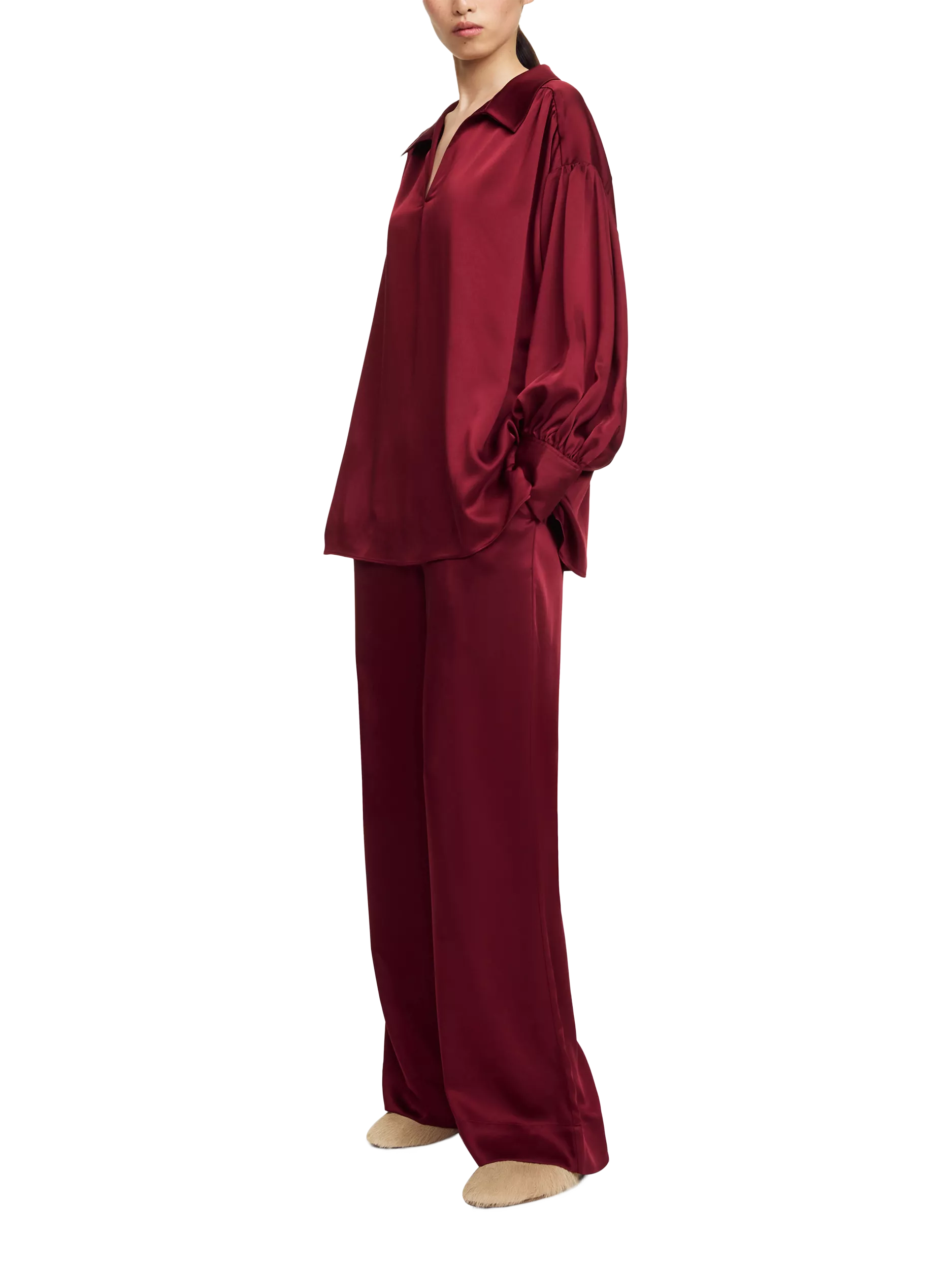 Designed in a minimalist silhouette that will transcend seasons, the Leonora blouse will slot right into your existing wardrobe – and work for numerous occasions. Made in a lush satin, the tunic-style design has a sharp collar, V-neck and buttoned cuffs. Notice the small, embroidered monogram.