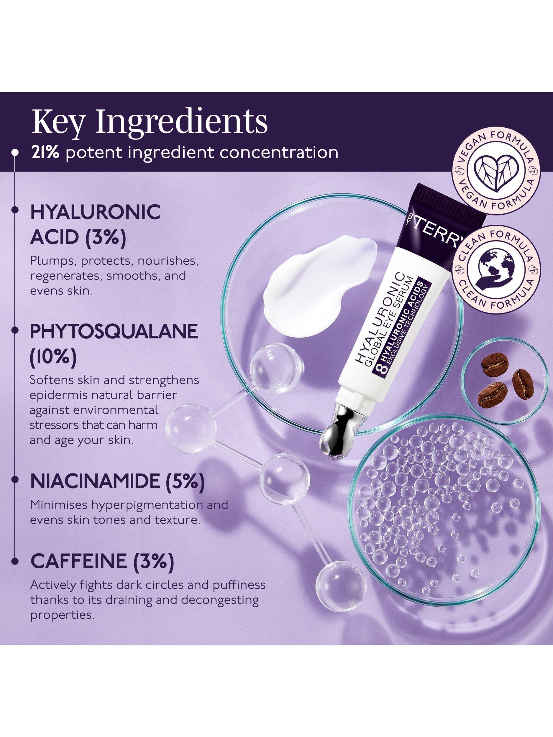 This high-performance youth-booster floods multiple layers of the skin with a 3% concentration of 8 types of Hyaluronic Acid. Renowned for attracting and locking-in moisture, this powerhouse ingredient occurs naturally in the body, but depletes with age. Hyaluronic Global Eye Serum houses 8 types of Hyaluronic Acids in 3 molecular weights: low, medium and high, enabling global absorption from the surface of the skin right down to the epidermis and deeper.