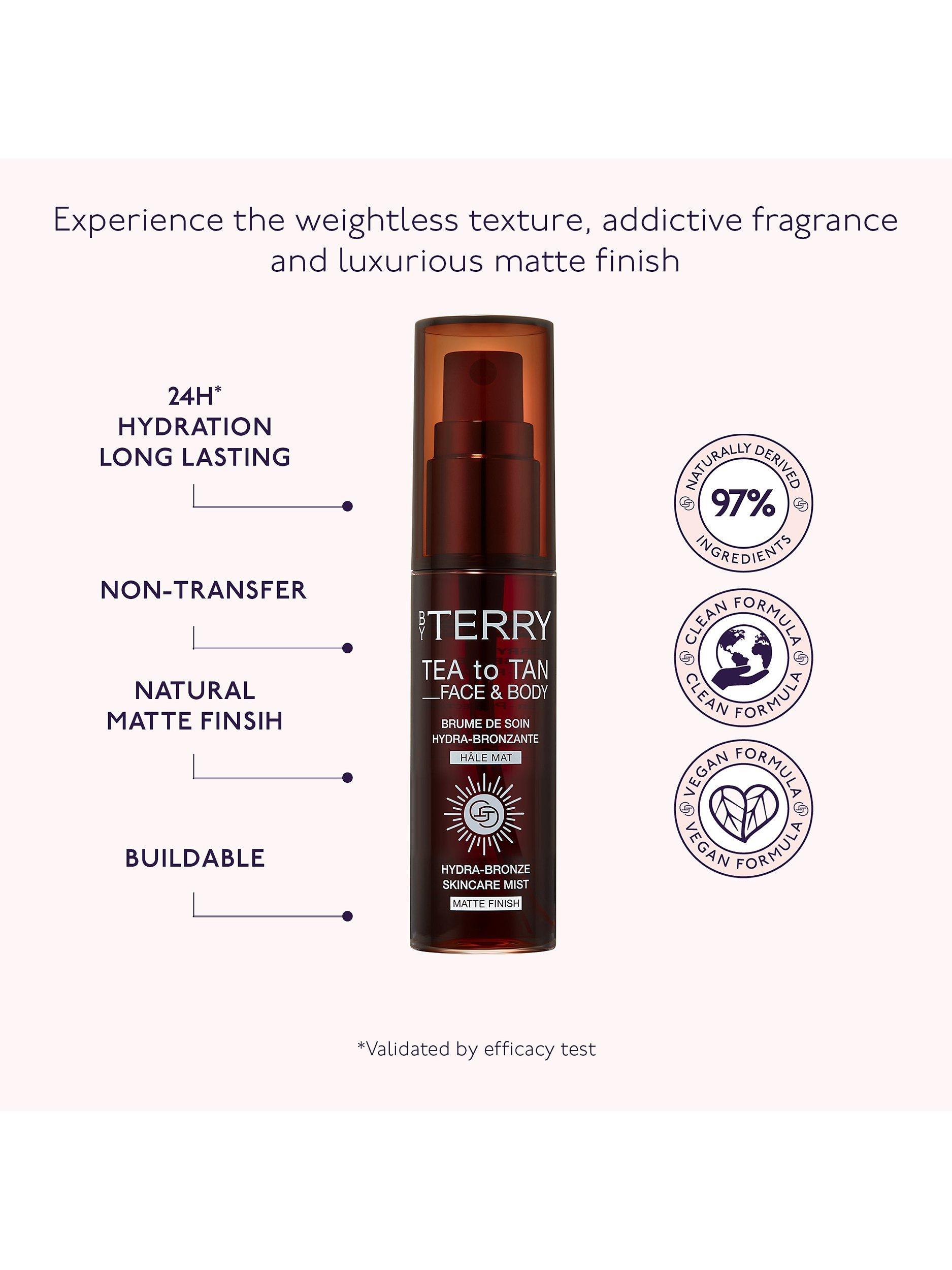 10 years after its creation, BY TERRY reinvents its iconic Tea to Tan Face & Body spray. Revamped with a brand-new formula & packaging, this hydra-bronze skincare mist is a unique fusion of skincare and bronzing perfection to hydrate and protect the skin with a natural sun-kissed glow. Like a tea infusion, its water-based formula gives the skin a long-lasting tint, without coverage.