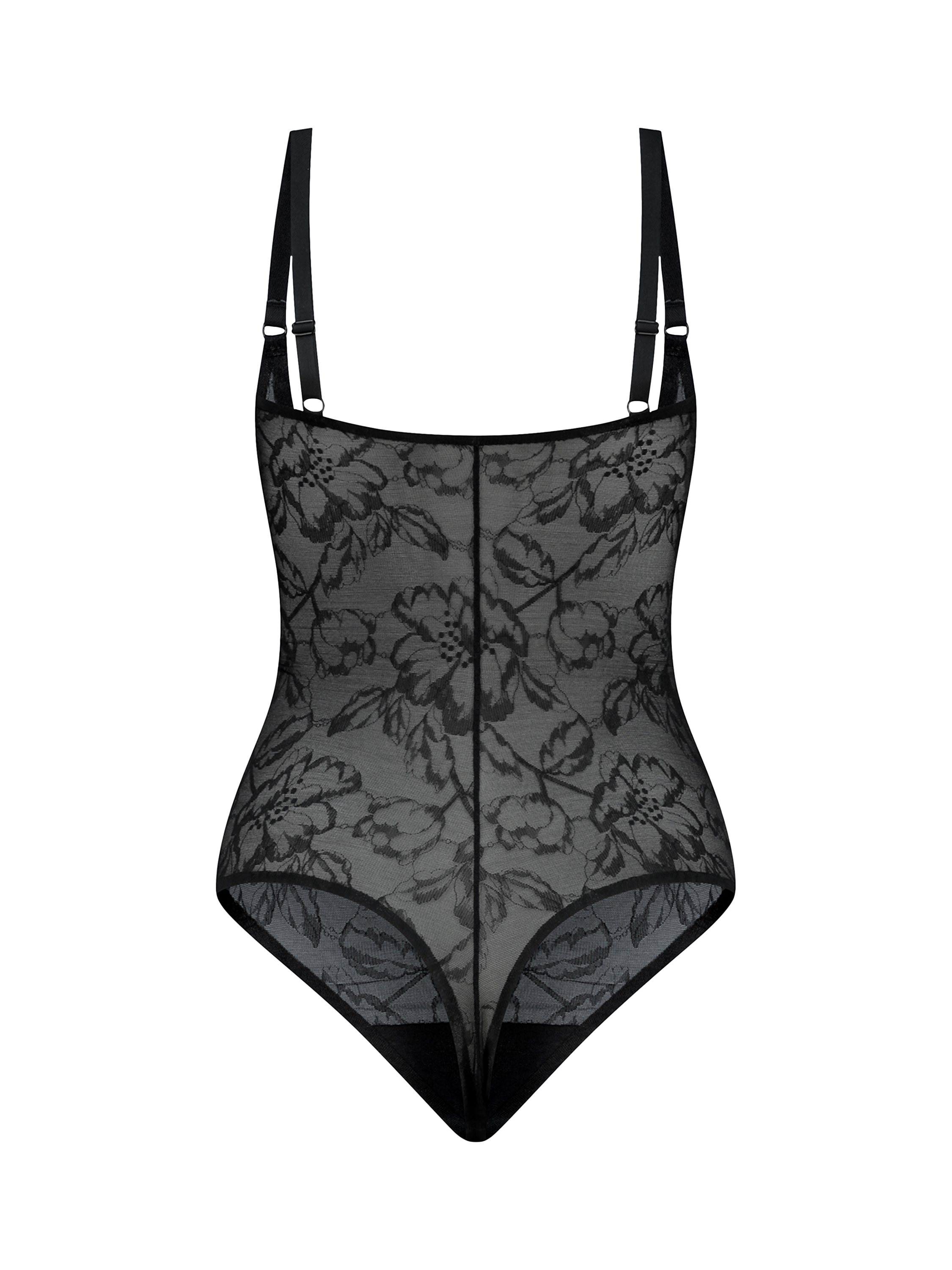 Your own sexy secret under your clothes, this bodysuit from Bye Bra is covered in feminine lace this bodysuit and has an open bust and thong back.