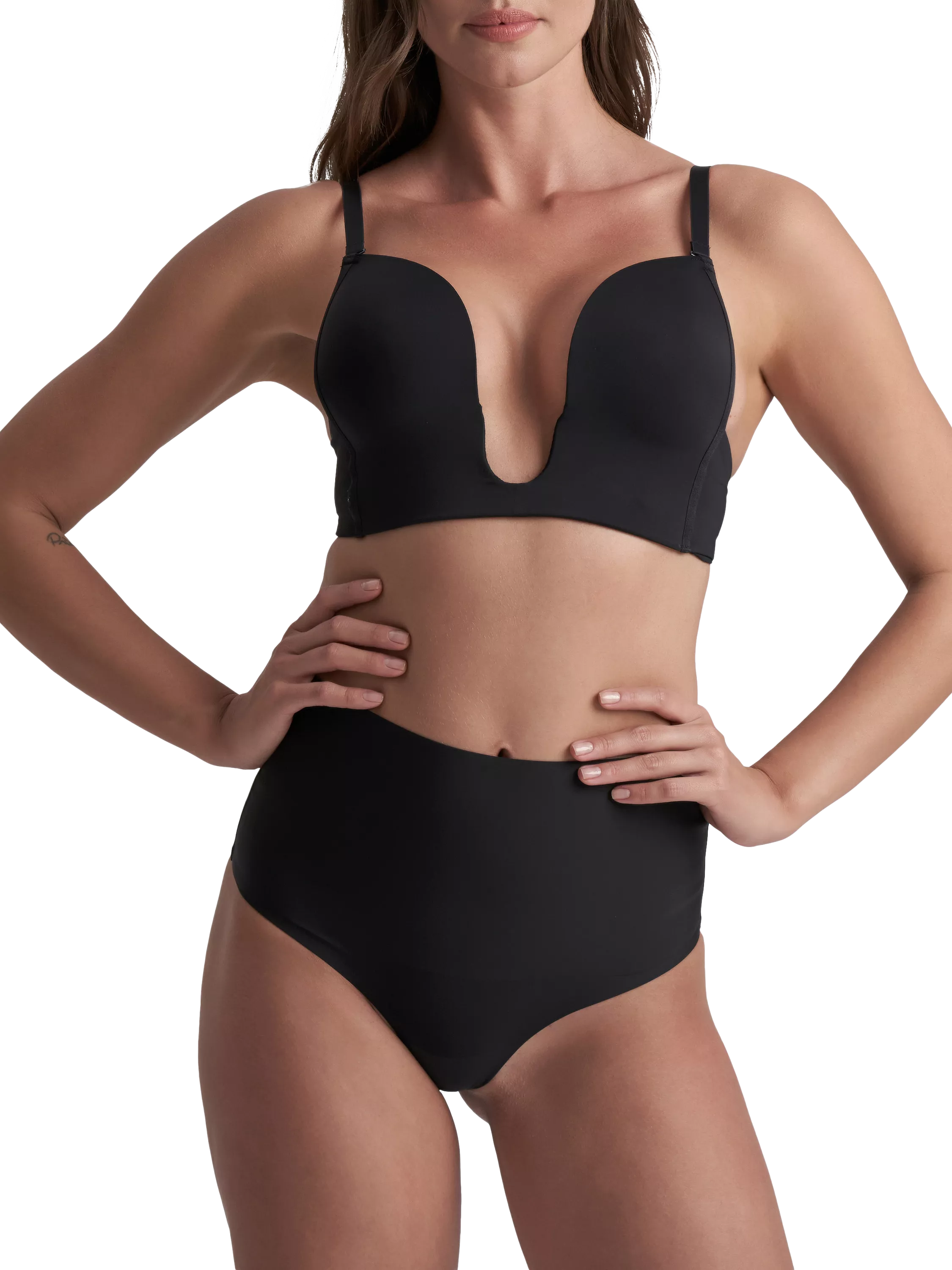 This deep plunge bra has a natural push-up and comes with multifunctional straps. It has clean finishings and a wide supportive underbust.