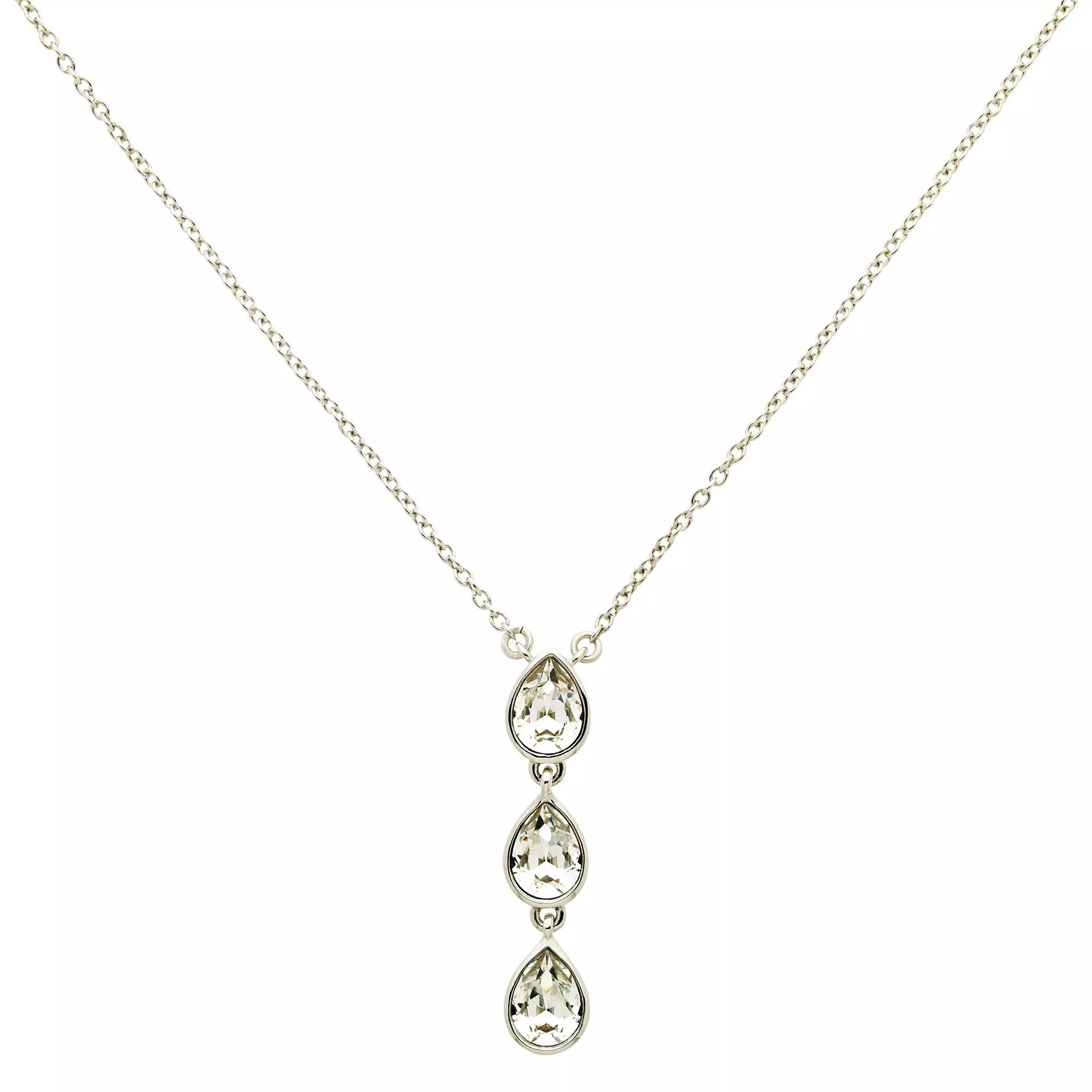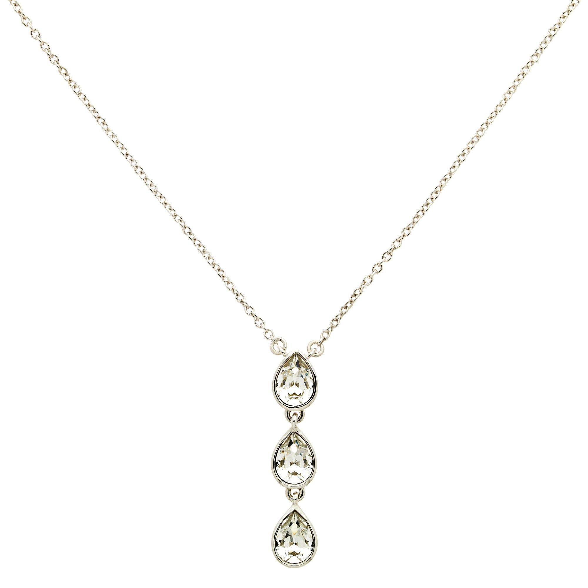 The model comes with a delicate silver-toned chain and a triple teardrop pendant that displays faceted clear Swarovski crystal elements. It fastens with an adjustable extension chain and a secure clasp.