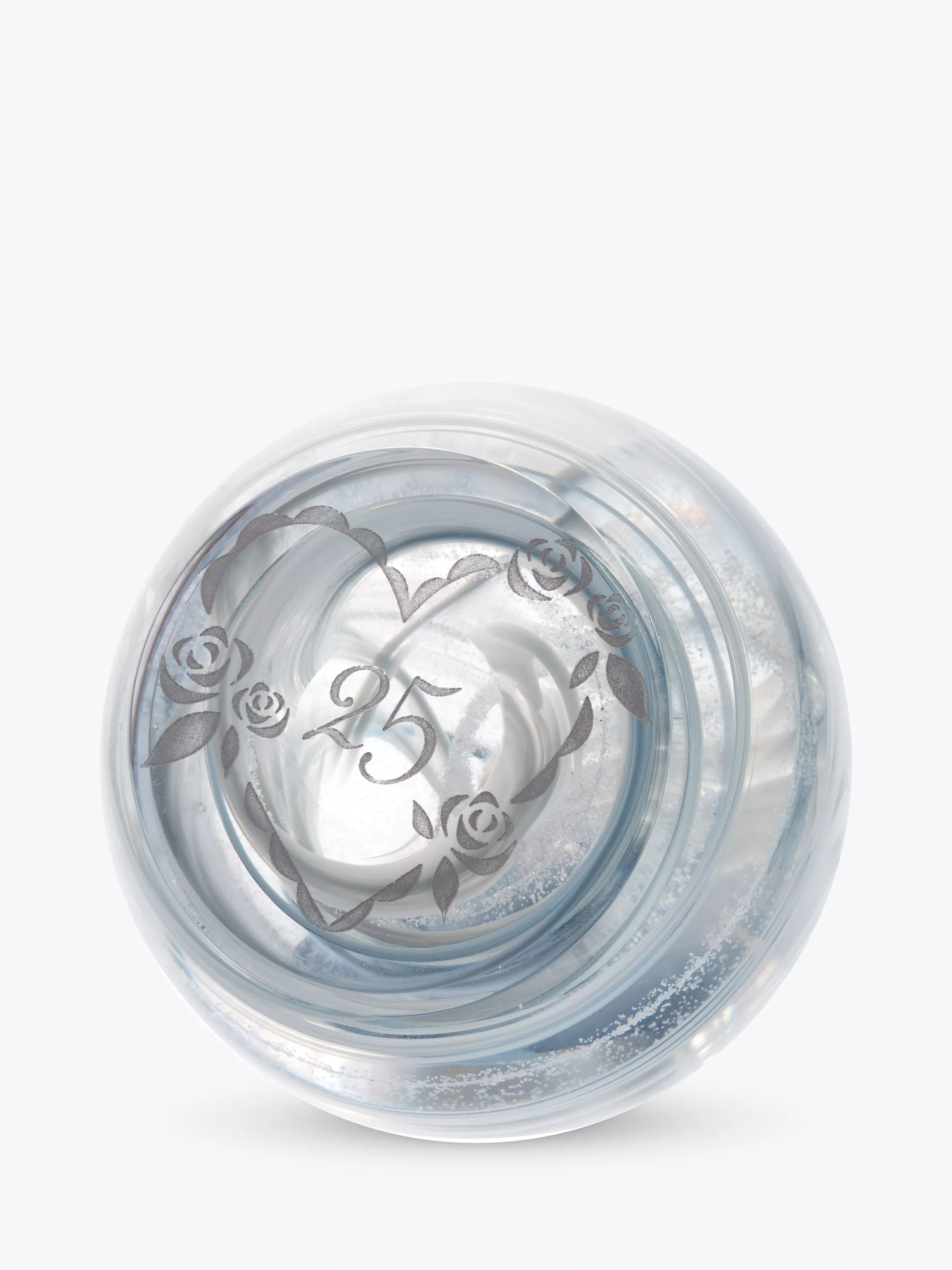 Handmade in Scotland by expert glassmakers, this paperweight is etched with a 25th celebration motif and has a silver colouring that makes it a wonderful keepsake or special anniversary gift to mark the momentous occasion.