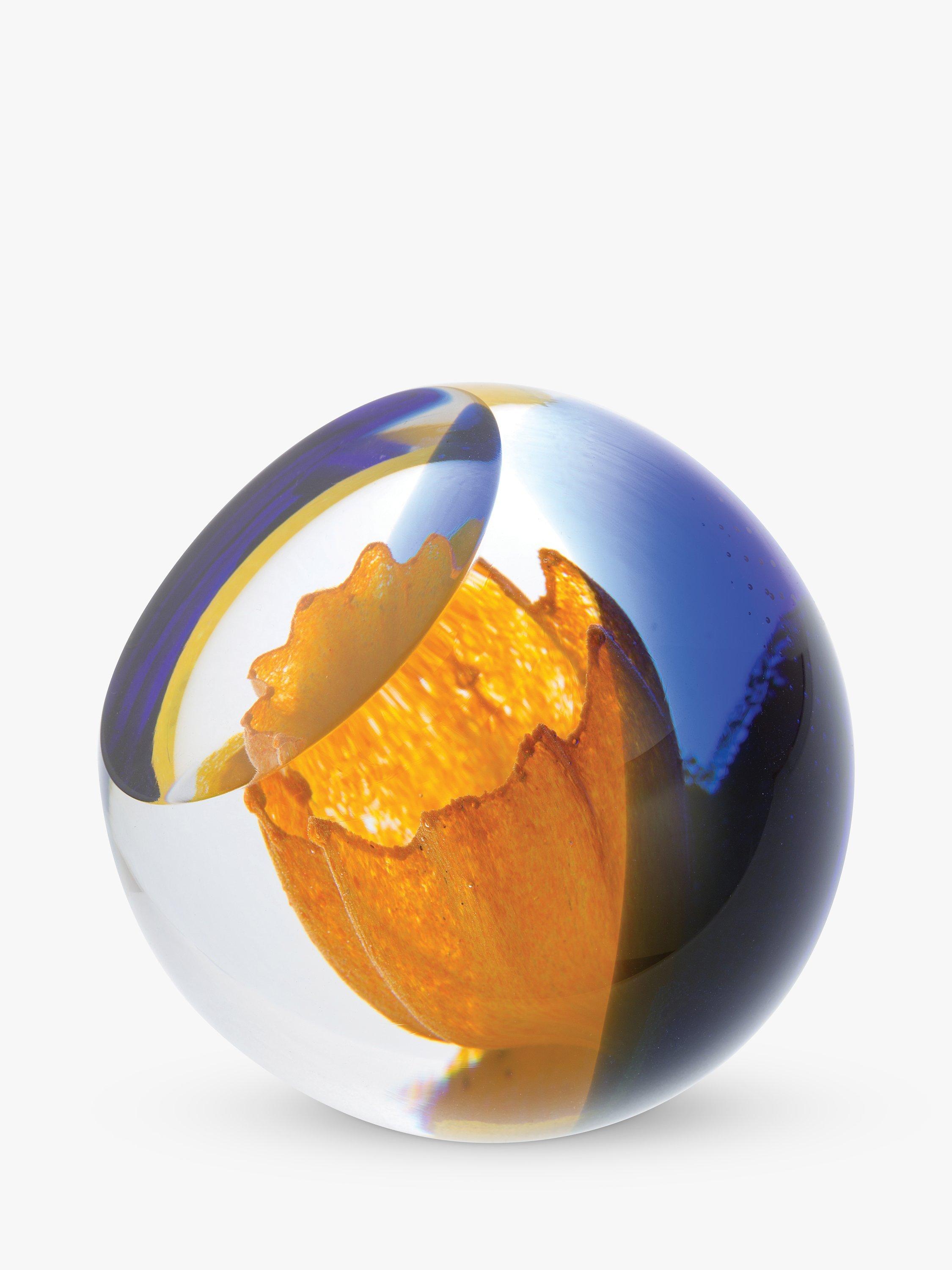 Handmade in Scotland by expert glassmakers, this paperweight features a daffodil head set against a vivid blue backdrop.