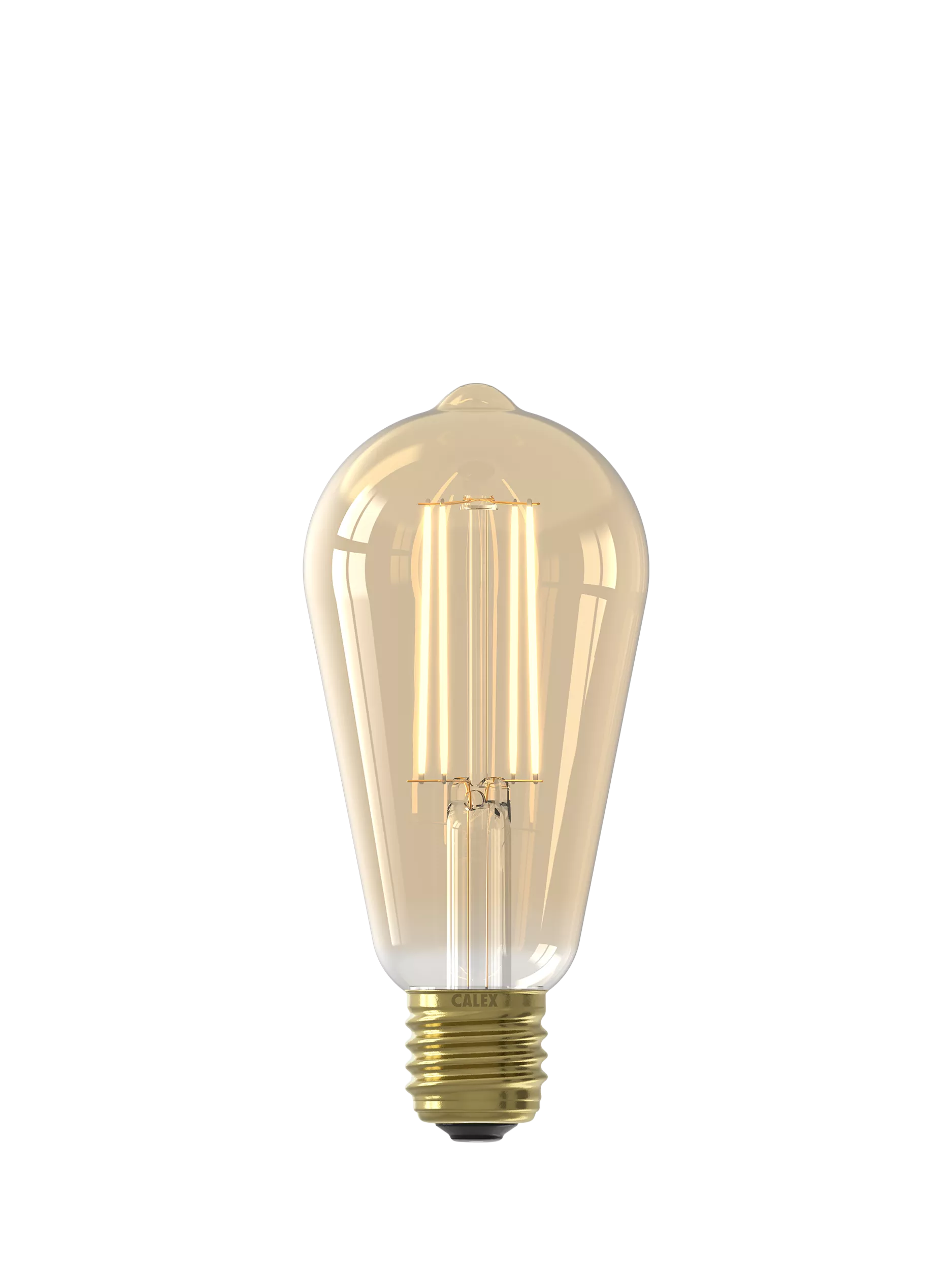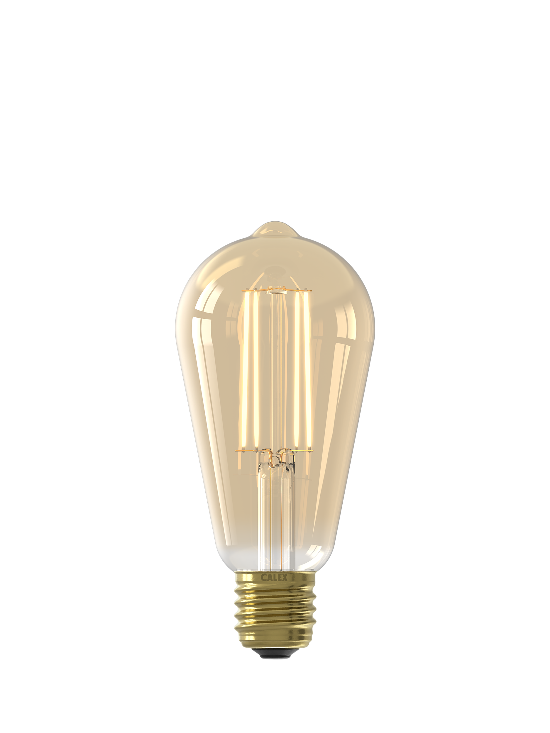 From the Goldline series of Calex light bulbs with exposed filaments. This dimmable rustic LED bulb with an Edison screw fitting gives a warm glow with a decorative design and gold finish that's meant to be seen.