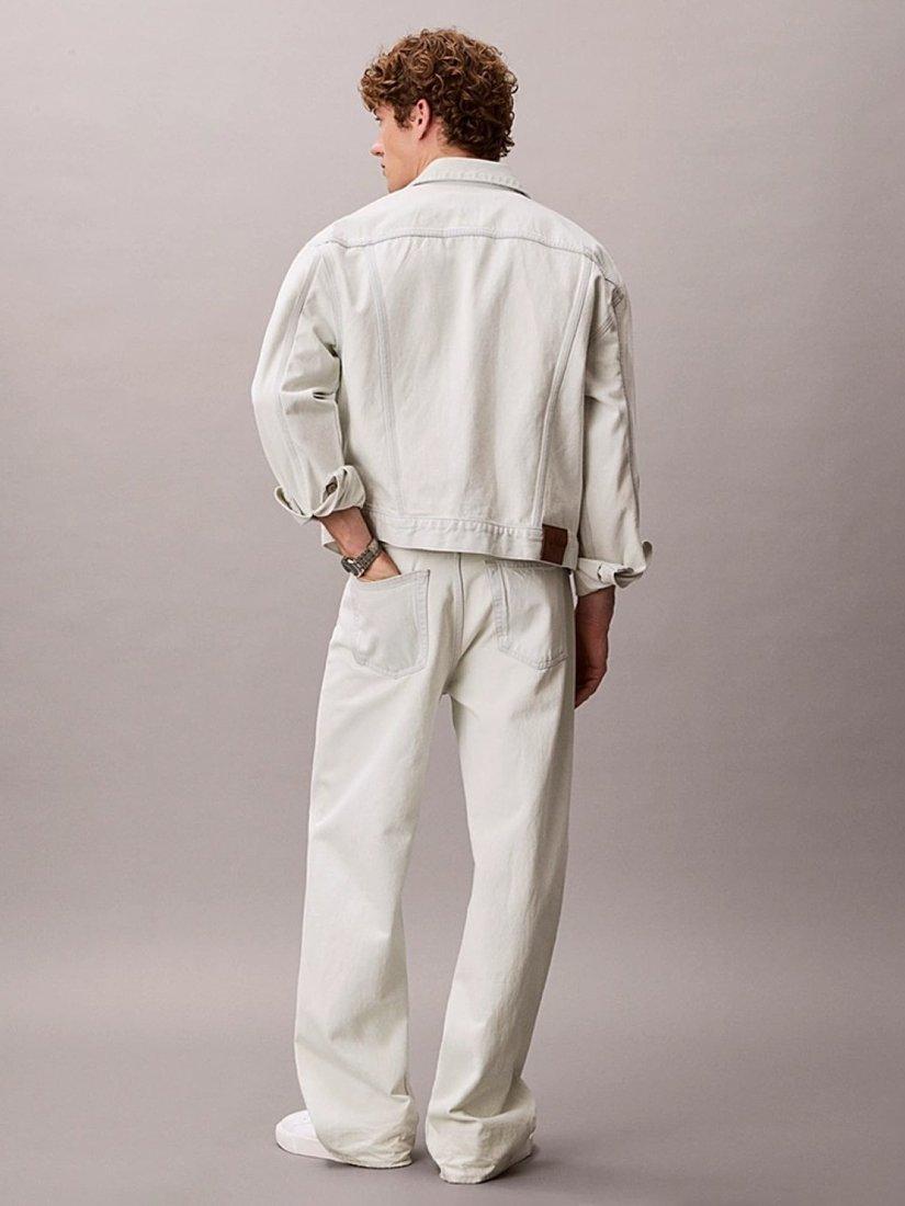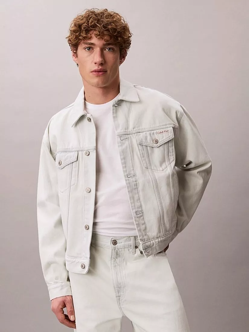 Authentic '90s fit rigid cotton denim jacket with subtle distressing at the seams. It features a pointed collar, branded metal buttons, slit pockets, flap chest pockets and a Calvin Klein leather logo badge.