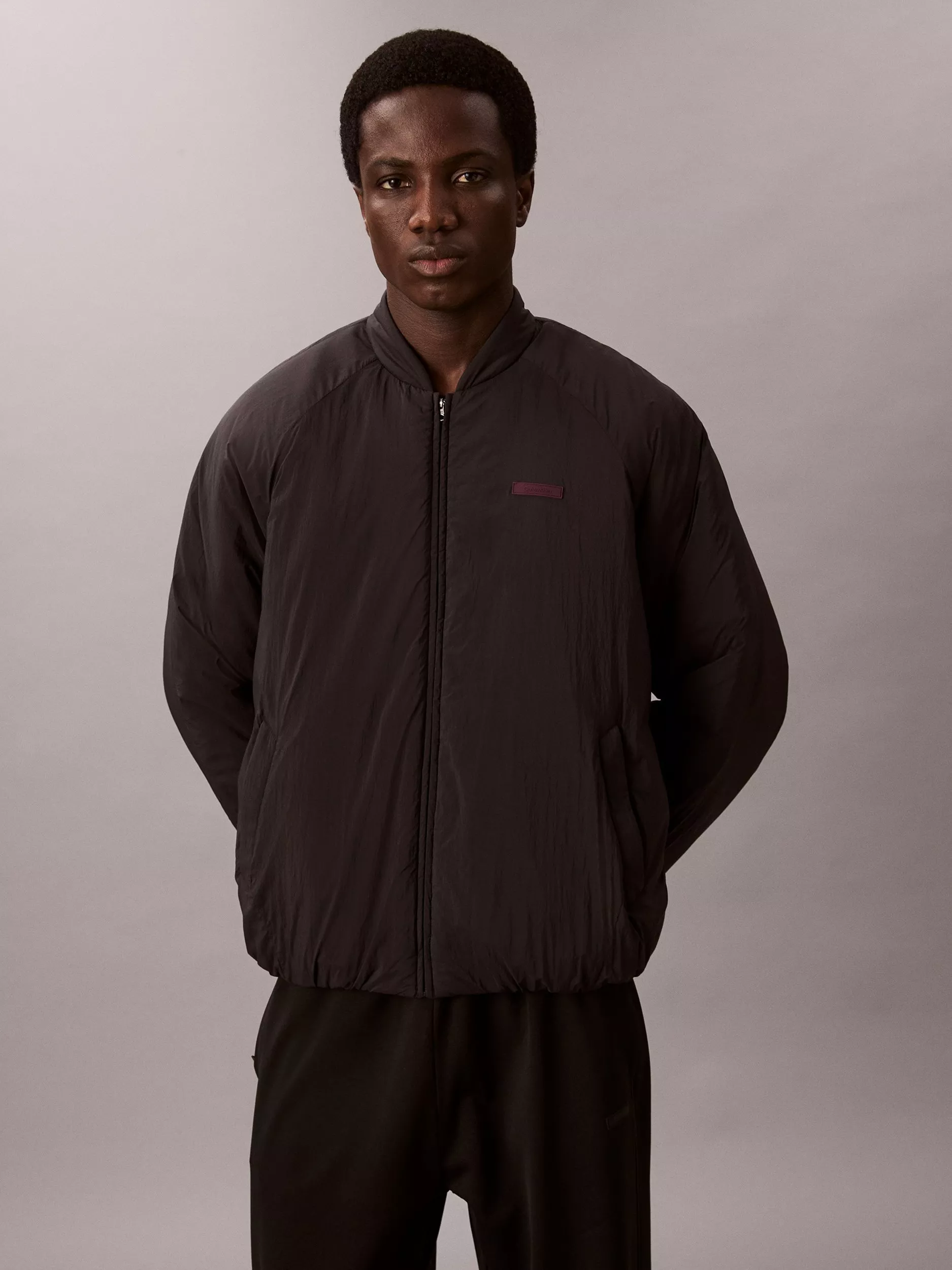 A Calvin Klein bomber jacket. Smart details and a regular fit make it easy to wear anywhere, while the practical zip fastening makes pulling on even easier.