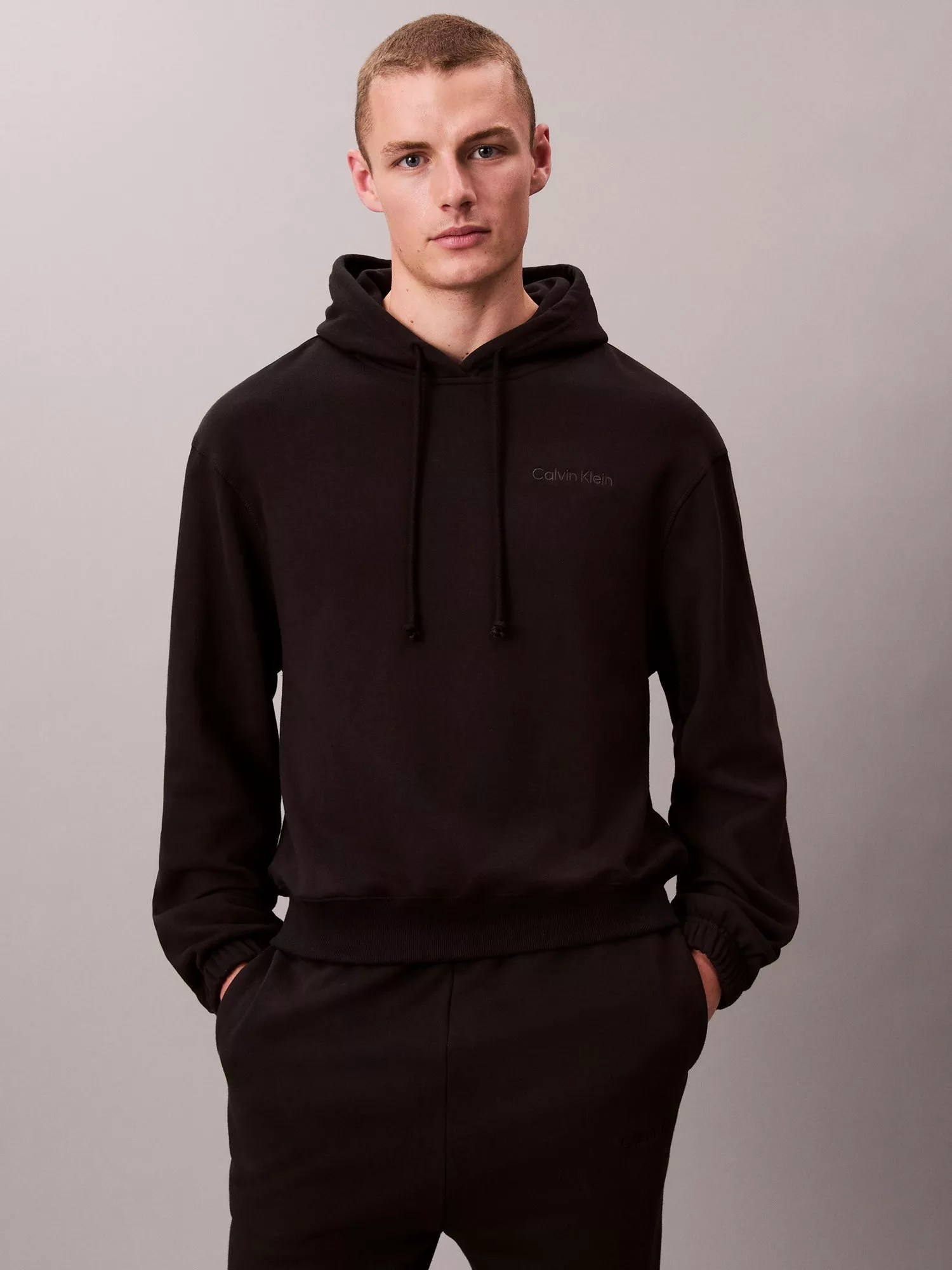 Created for maximum comfort, this Calvin Klein lounge hoodie features a relaxed fit and a minimalist silhouette. Made from a plush cotton-knit blend, it has a soft, cosy feel, with a drawstring hood, ribbed knit trim and drop shoulders. A subtle embroidered Calvin Klein logo on the chest completes the look.