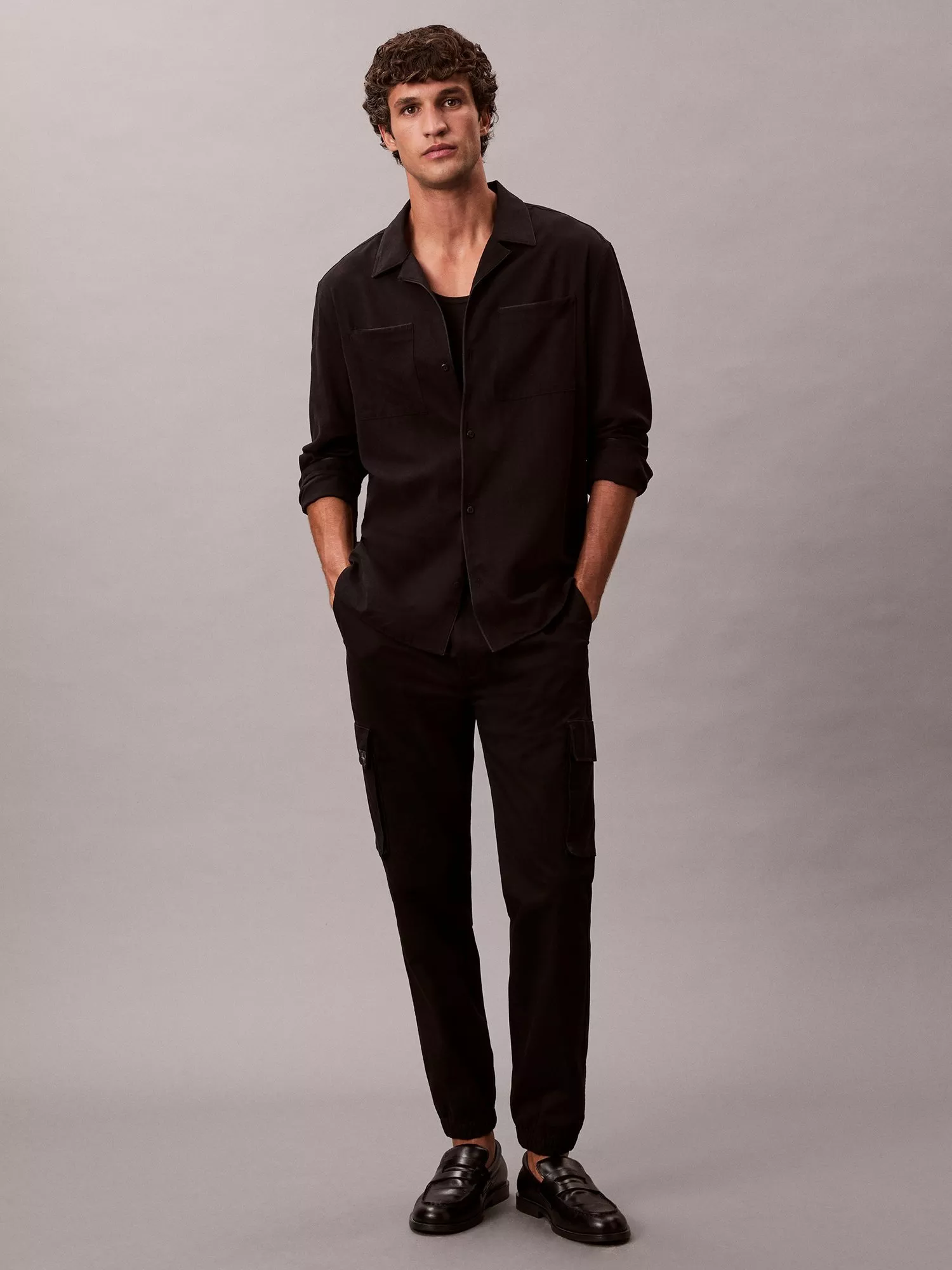 A pair of skinny cargo trousers from Calvin Klein made from a cotton blend fabric. Fastening with a zip and concealed button fastening and regular hems.