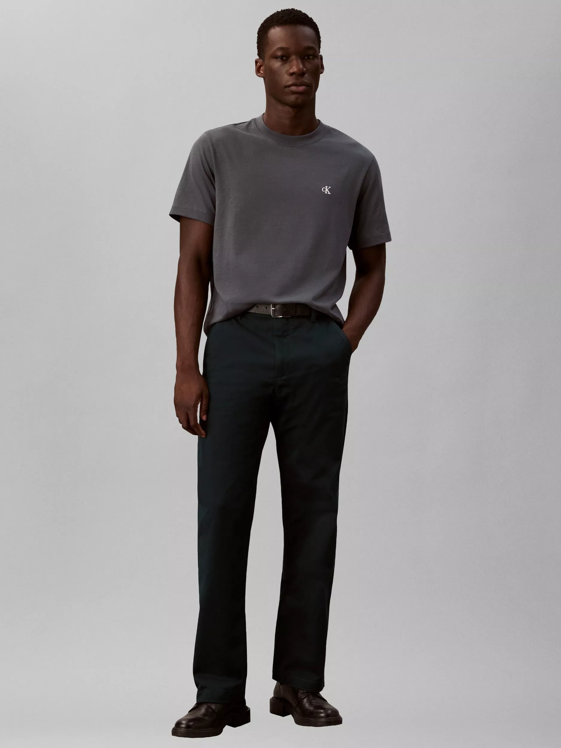 These 90s straight trousers are crafted from extra soft stretch cotton for a flexible feel. They feature a mid-rise and 90s straight fit, complete with a zip fly, button closure, slant pockets, a coin pocket, and back welt pockets.