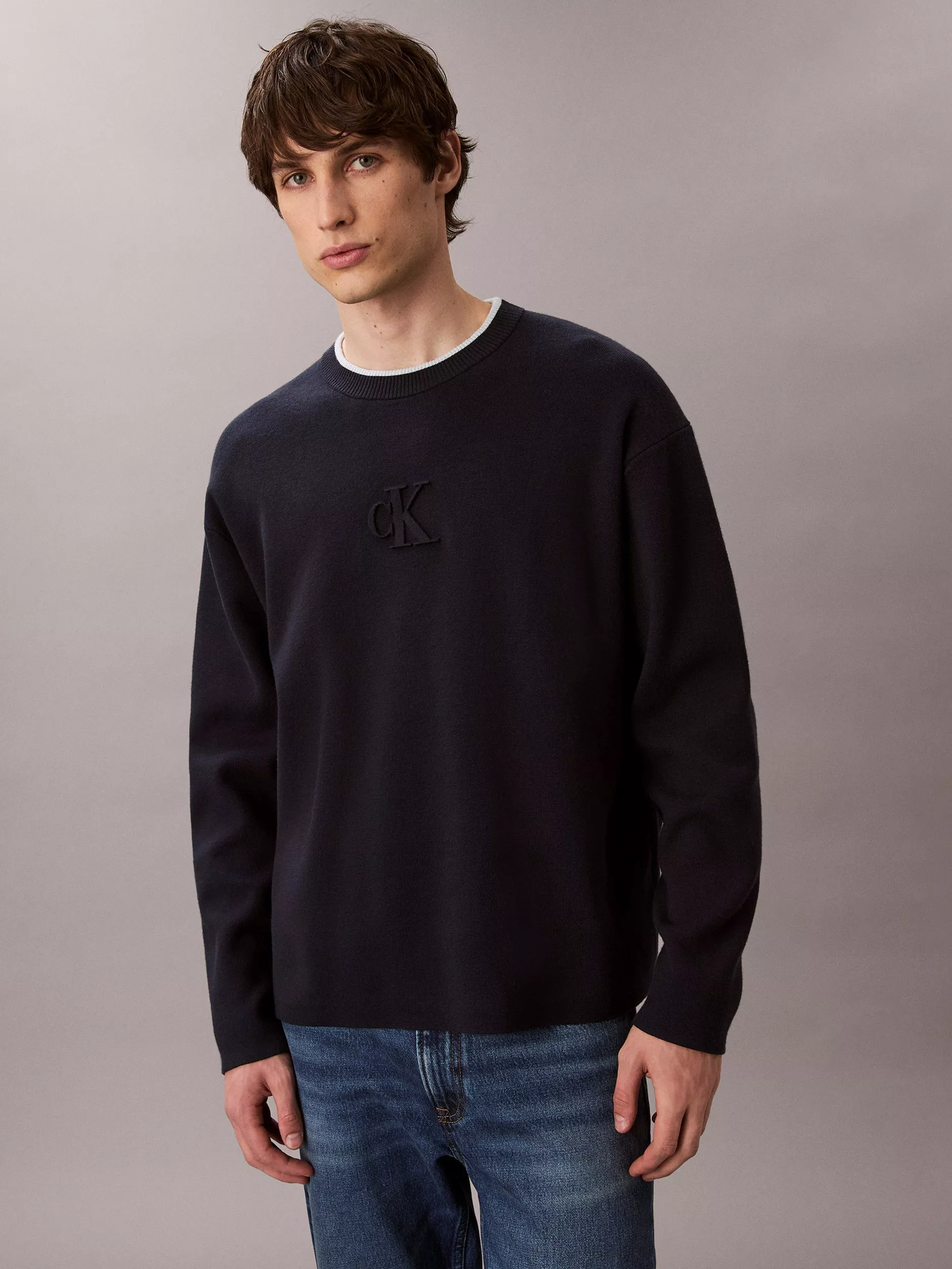 A relaxed fitting crew neck sweatshirt from Calvin Klein with an embossed monogram logo, making it a smart, reliable pick for varied plans.