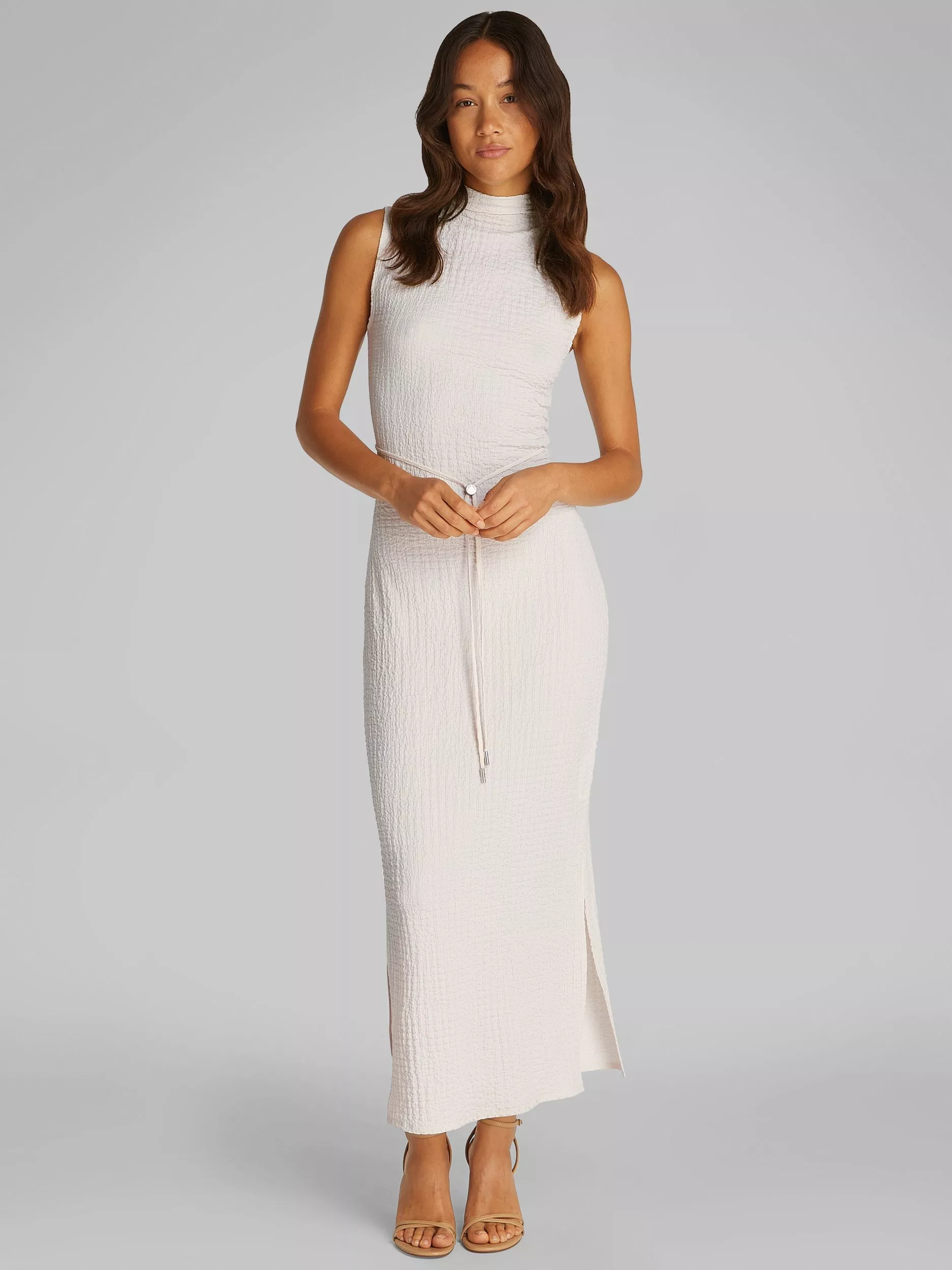 In a fuss-free, straight shape, this maxi dress from Calvin Klein is made using a crinkle effect jersey blend. Structured with a high neck, this style is bound to become a key addition to your line-up.