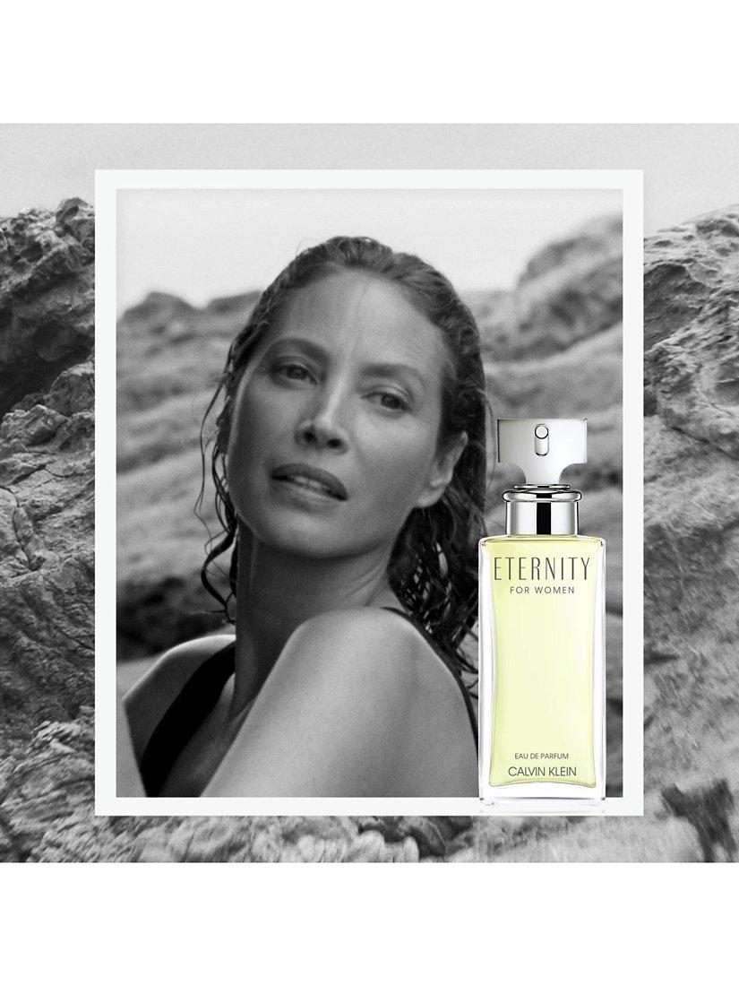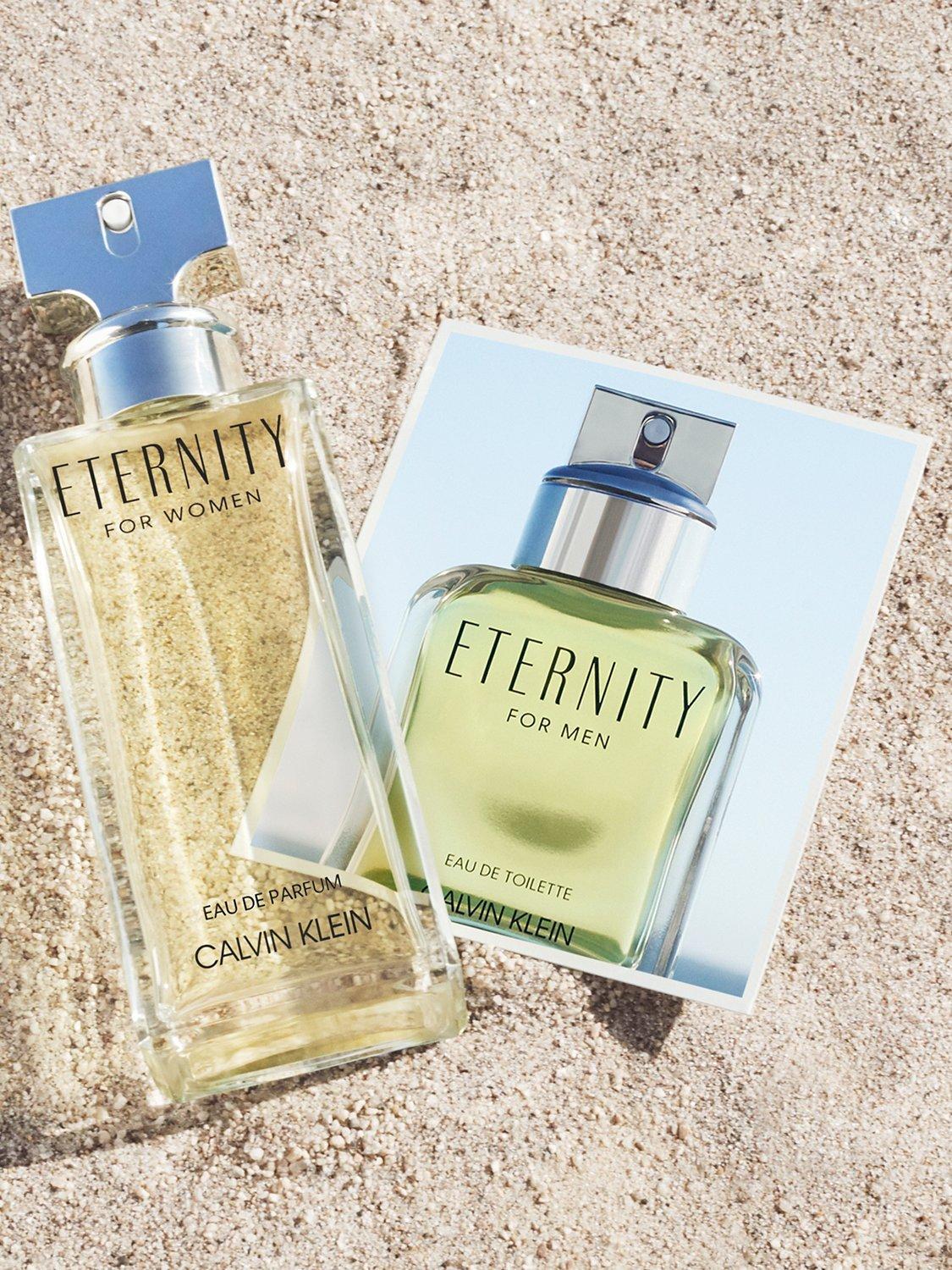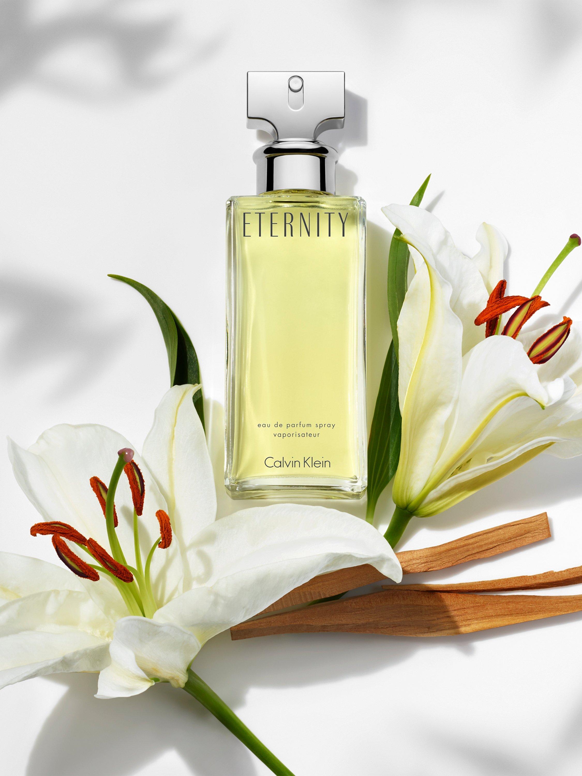 Inspired by modern romance, Eternity for Women Eau de Toilette perfume has floral top notes of white lily and bergamot. It transitions to essences of white rose and violet and is completed with dry and spicy notes of sandalwood and golden amber.