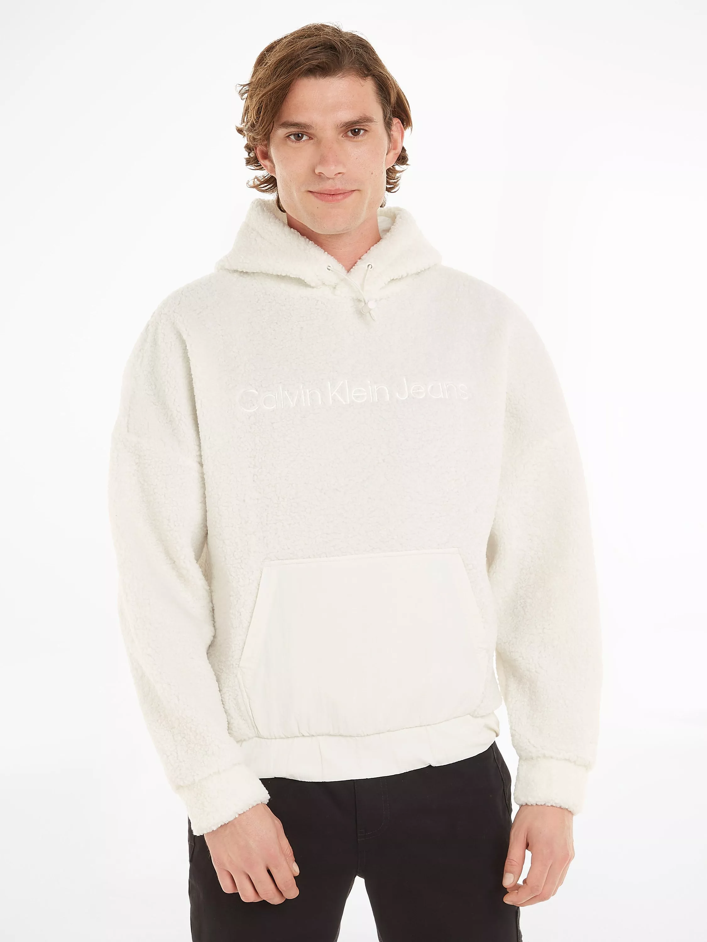 Designed with comfort in mind, this Sherpa Calvin Klein Jeans hoodie is sure to become our go-to on a lazy day. Featuring cuffed sleeves and a kangaroo pocket for added practicality and a comfortable wear.