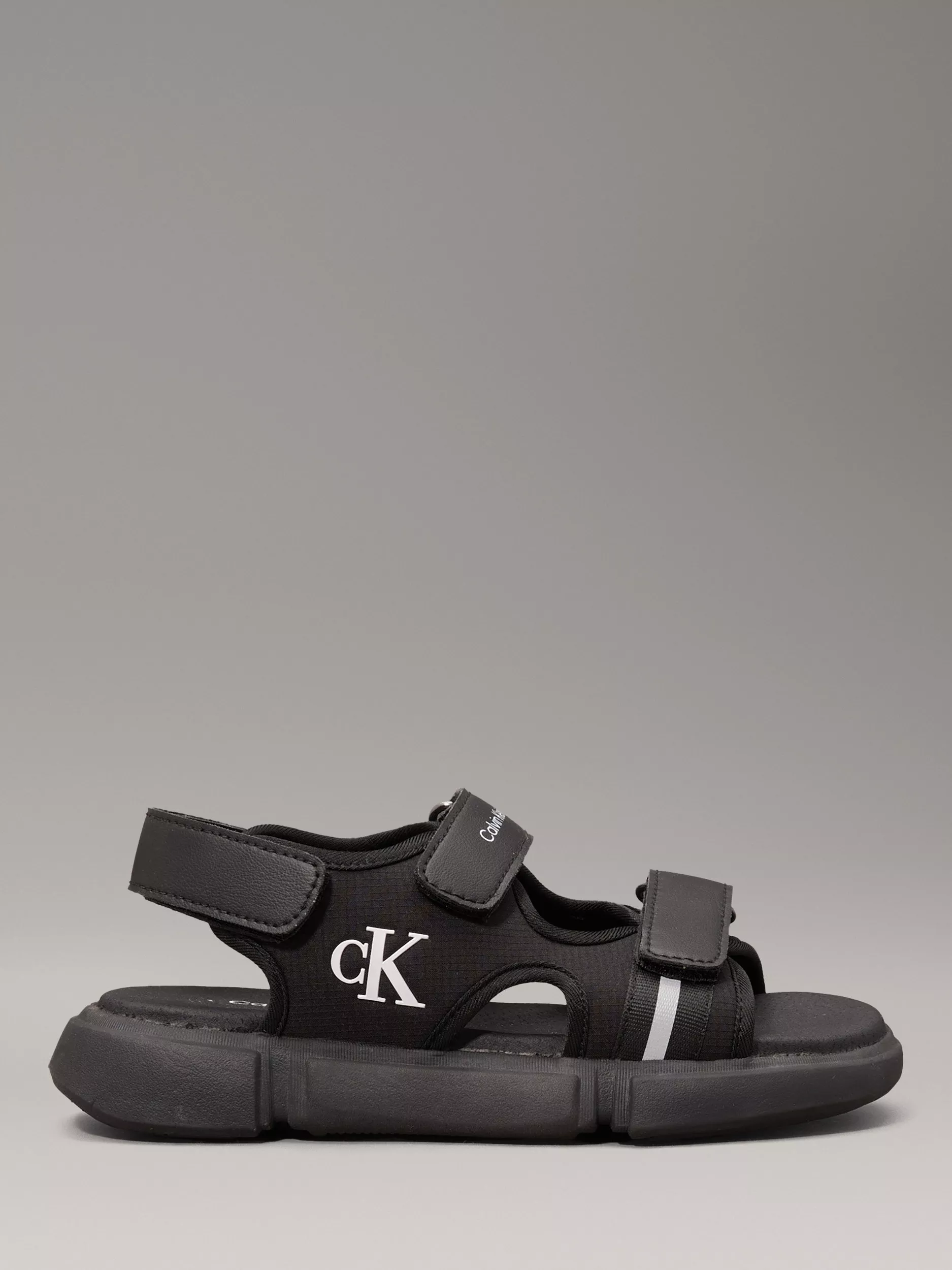 Ideal for summer getaways, these open-toe sandals keep their feet comfy with their ripstop, twill and webbing upper, and are designed with a foam footbed, EVA outsole, adjustable Velcro straps and leather trims. Finished with the brand's signature Calvin Klein logo.