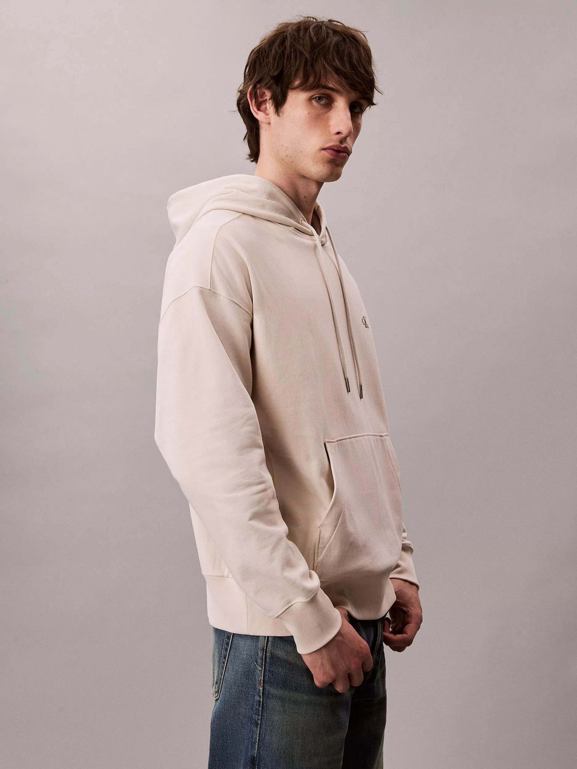 A relaxed fitting hoodie from Calvin Klein with monogram logo embroidery and a kangaroo pocket, making it a reliable pick for varied plans.