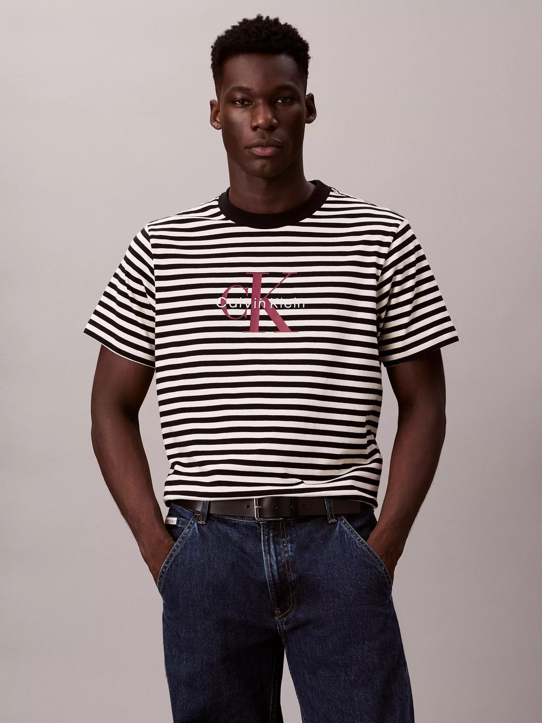 Bolster your staples with this cotton crew neck T-shirt by Calvin Klein. With horizontal stripes and a monogram logo graphic, it comes in a relaxed fit.