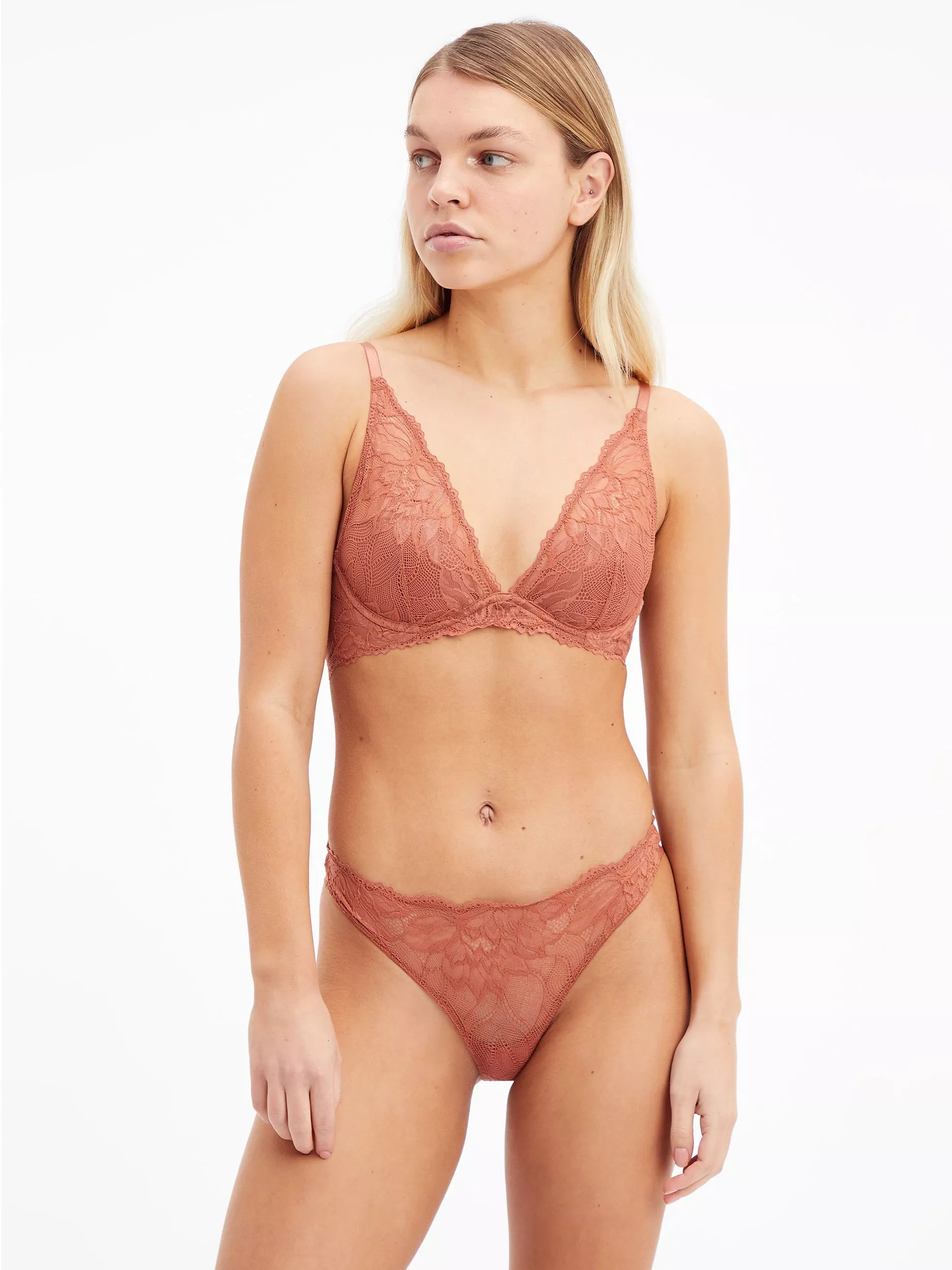 A perfect everyday essential. This seductive comfort bra from Calvin Klein has a contemporary design with padded plunge cups and delicate lace trims. Match with the coordinating bottoms for the complete look.