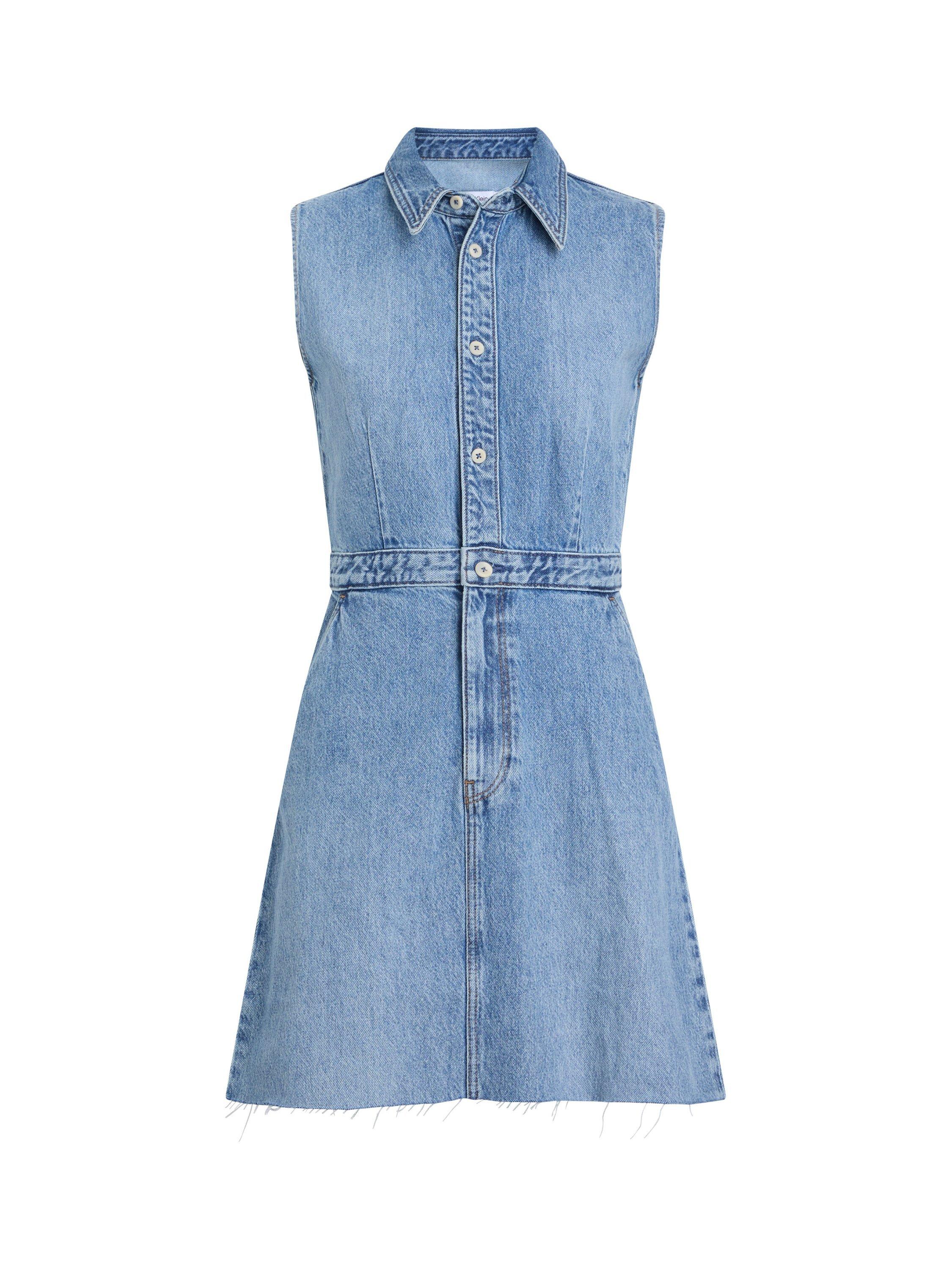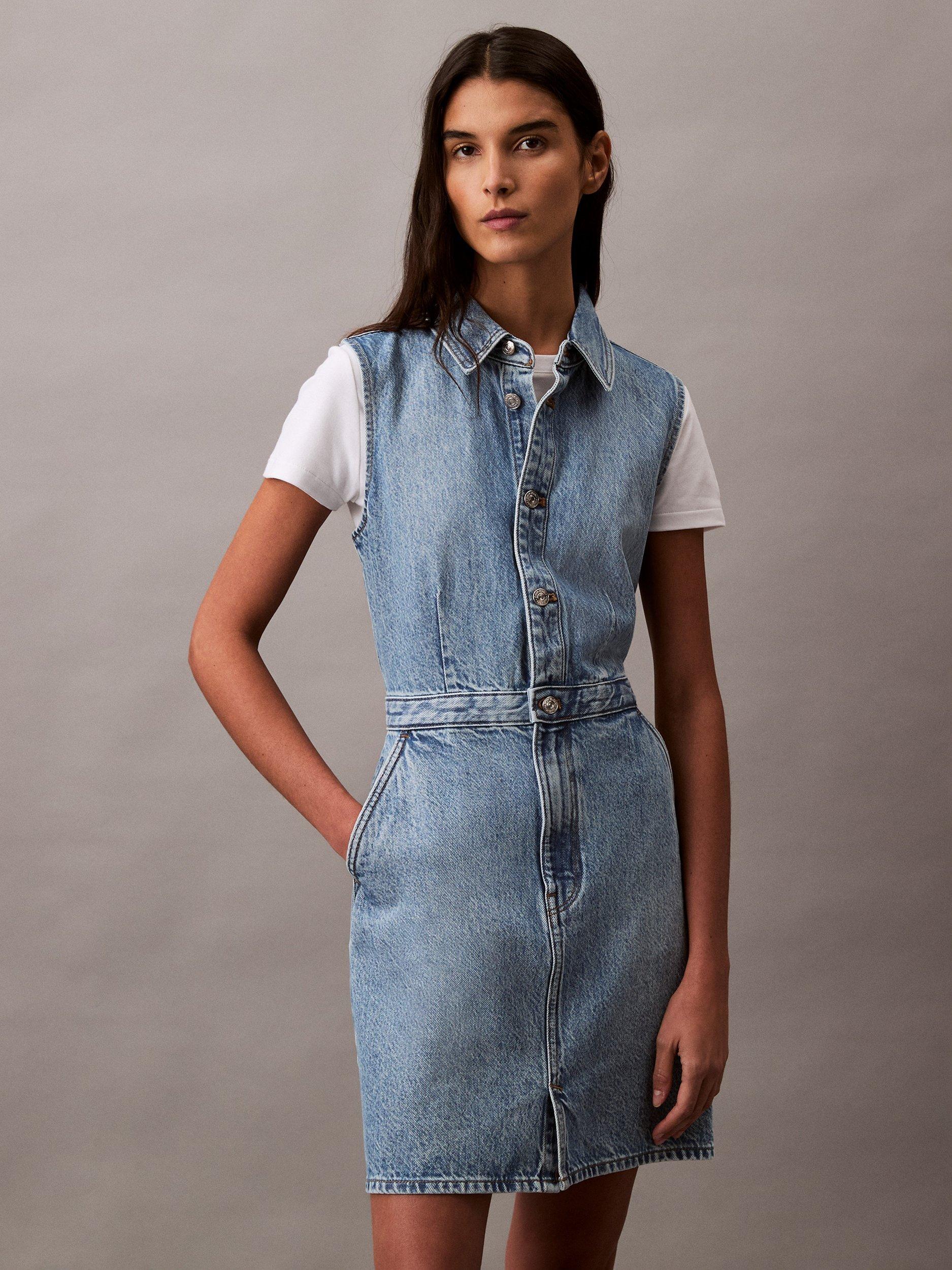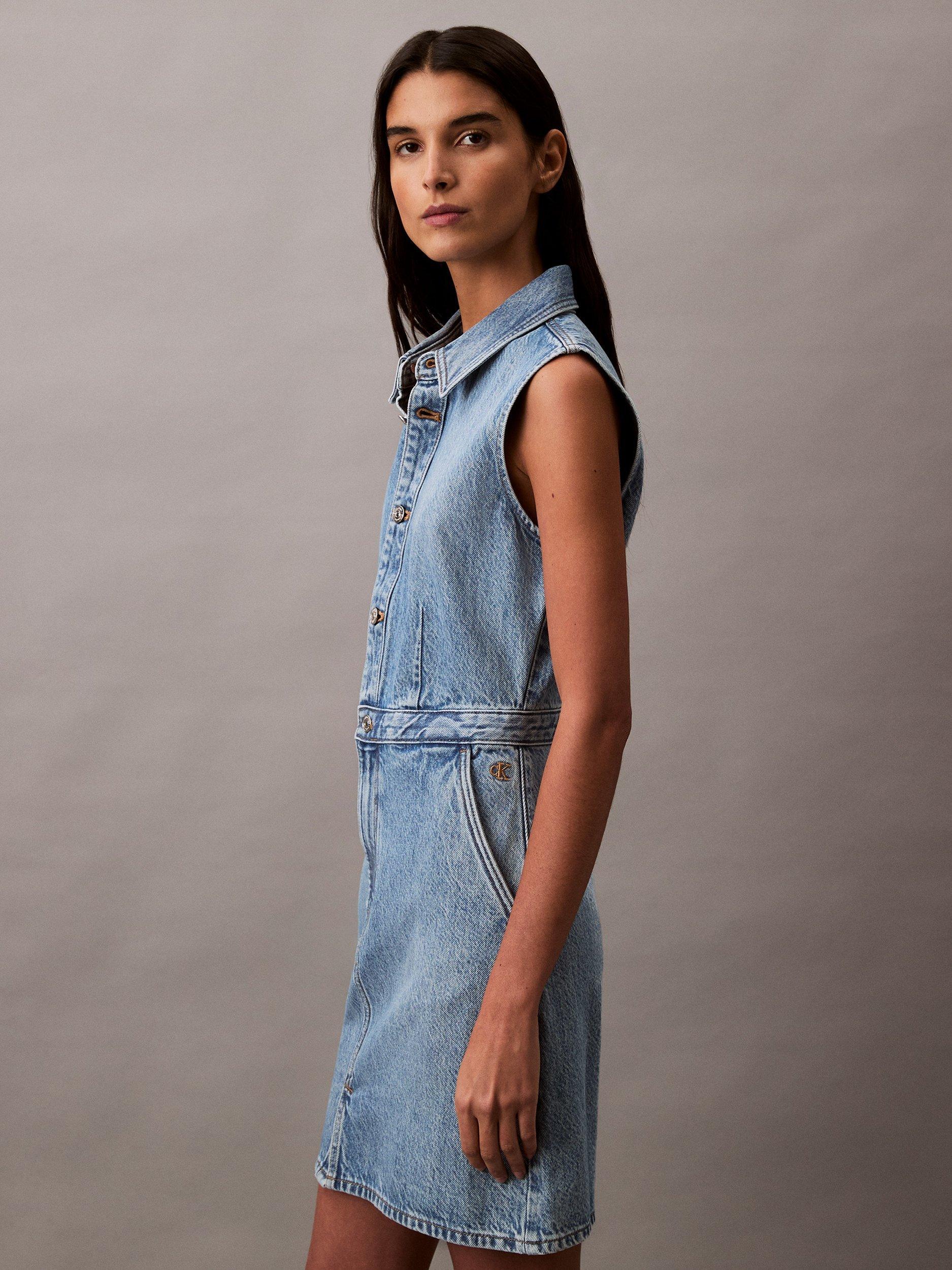 In a versatile A-line silhouette with a flared hem, this mini trucker dress from Calvin Klein is crafted from denim. Topped with a collar, this sleeveless style is kept trend-free so that it'll sit in your closet for years to come.