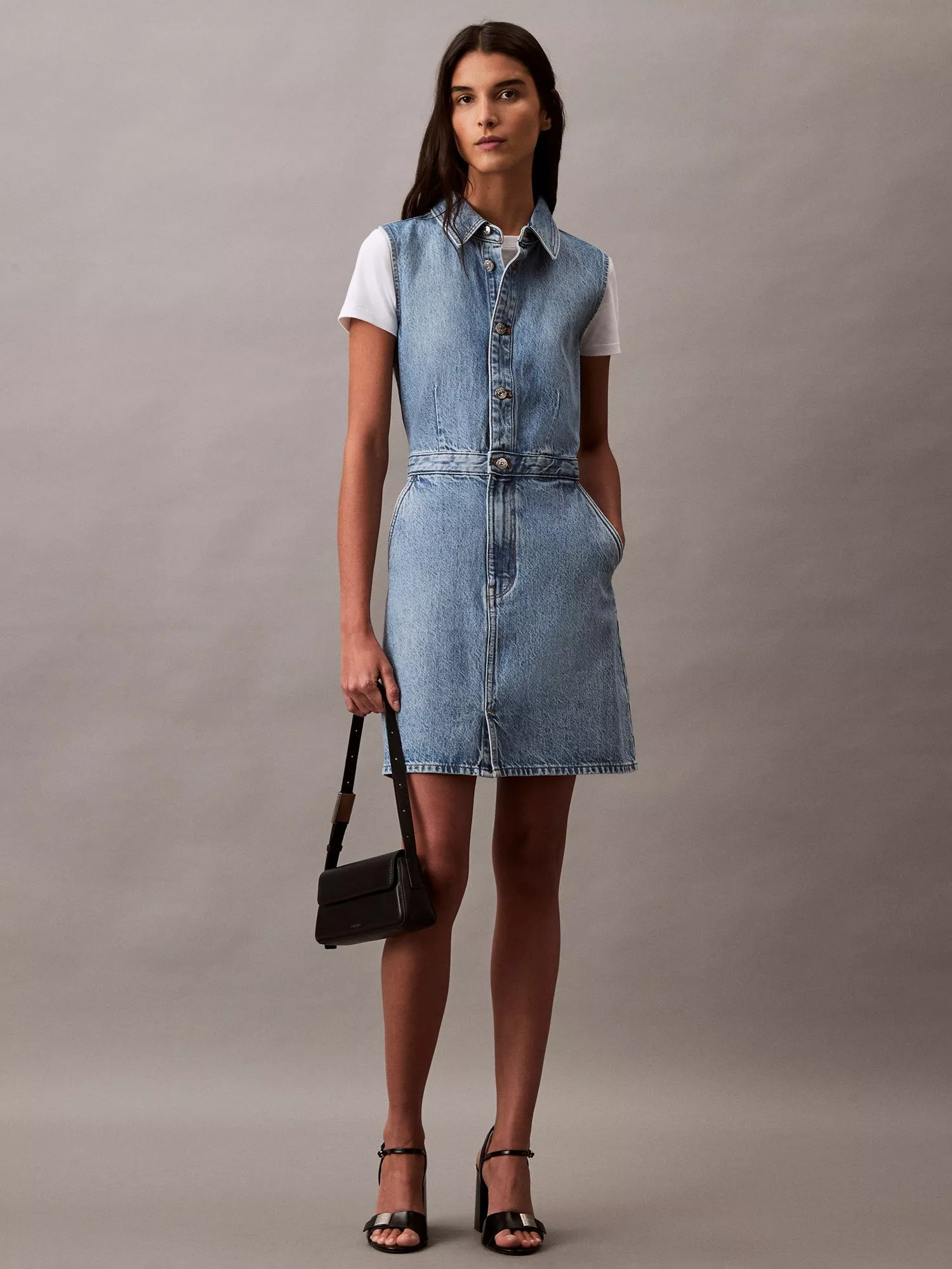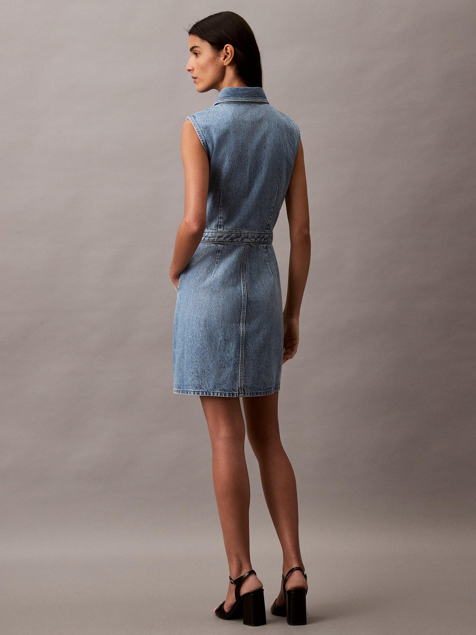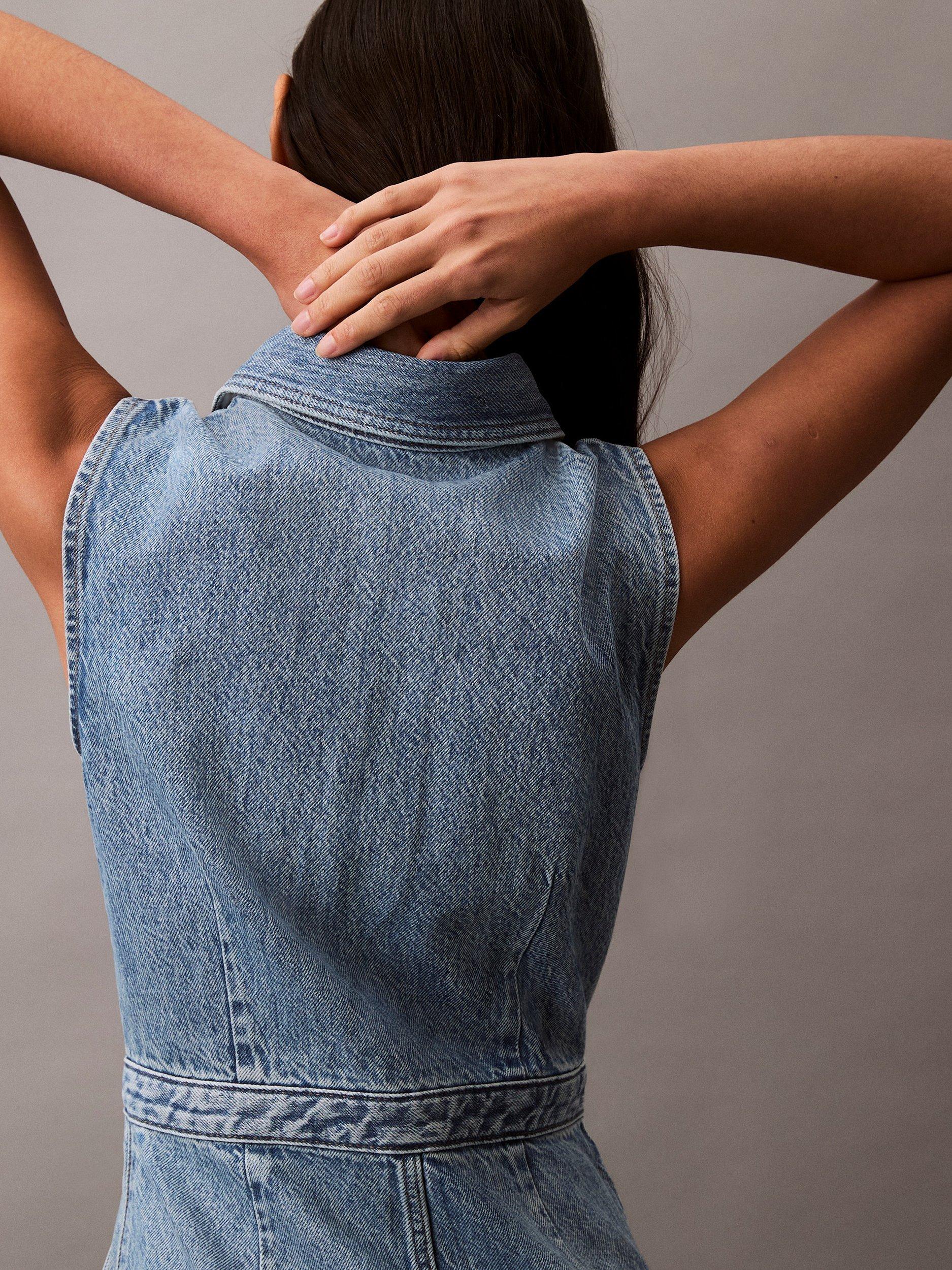 In a versatile A-line silhouette with a flared hem, this mini trucker dress from Calvin Klein is crafted from denim. Topped with a collar, this sleeveless style is kept trend-free so that it'll sit in your closet for years to come.