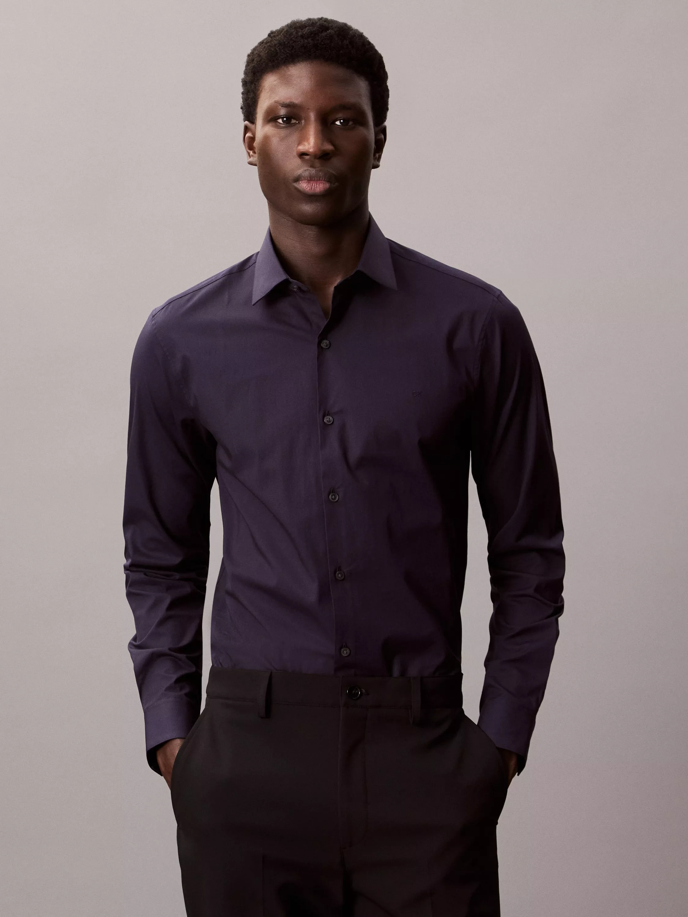 A cotton stretch poplin shirt with a pointed collar, buttoned placket and Calvin Klein monogram logo embroidered on the chest.