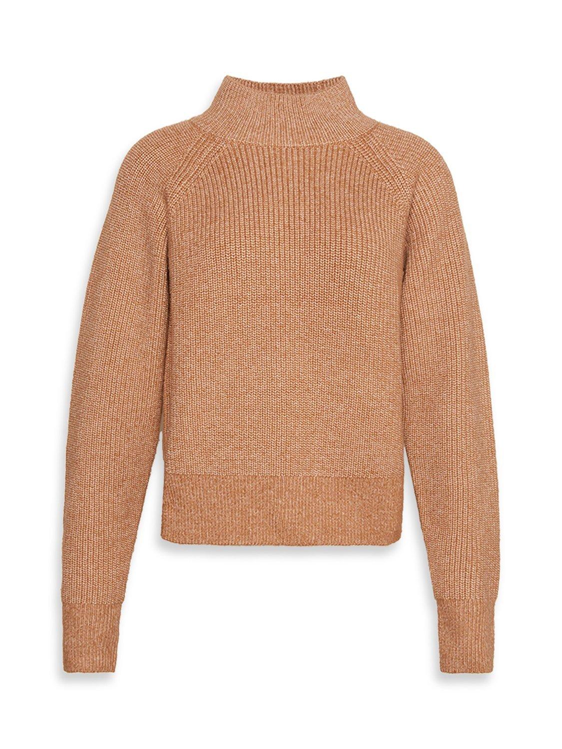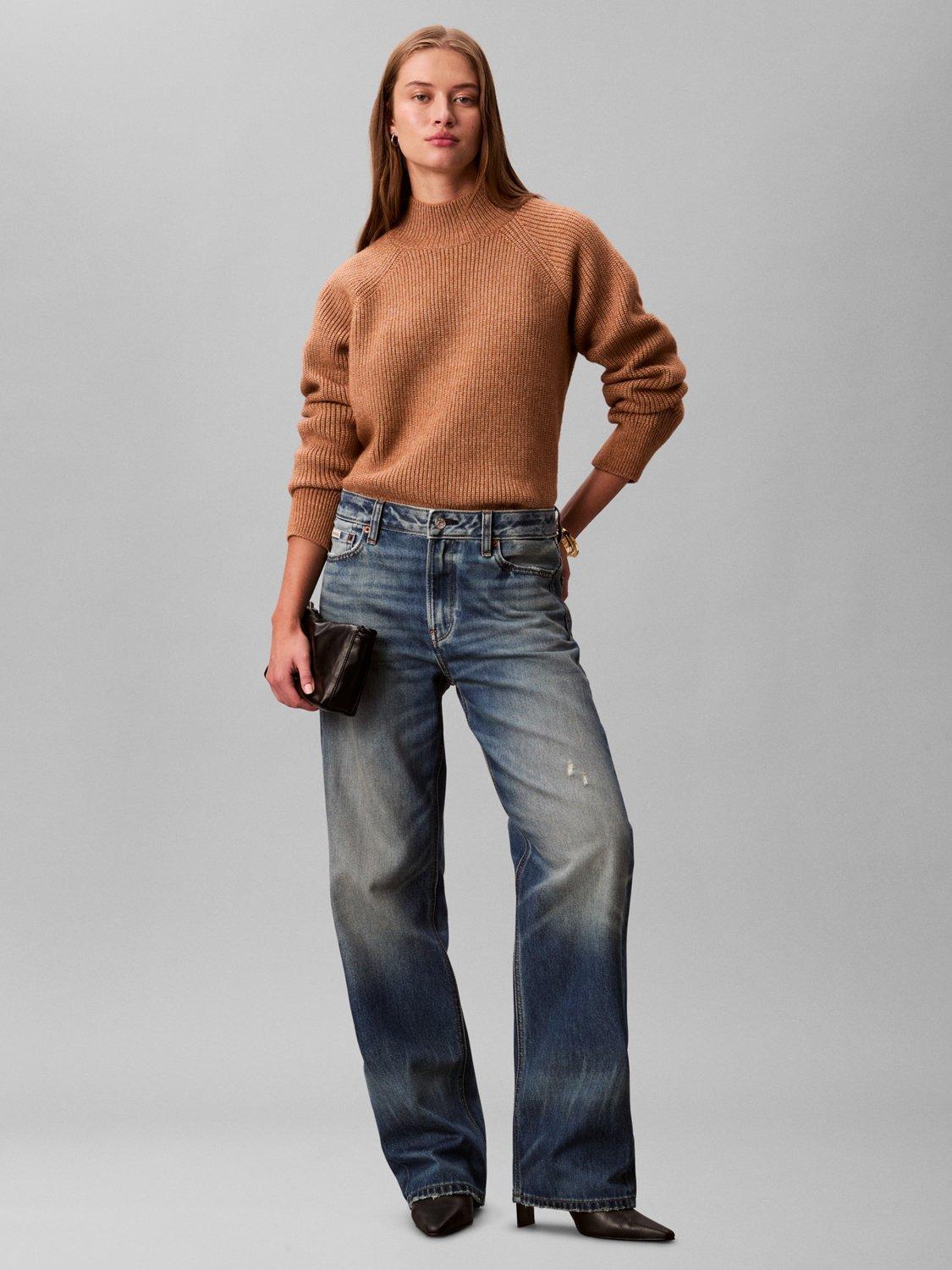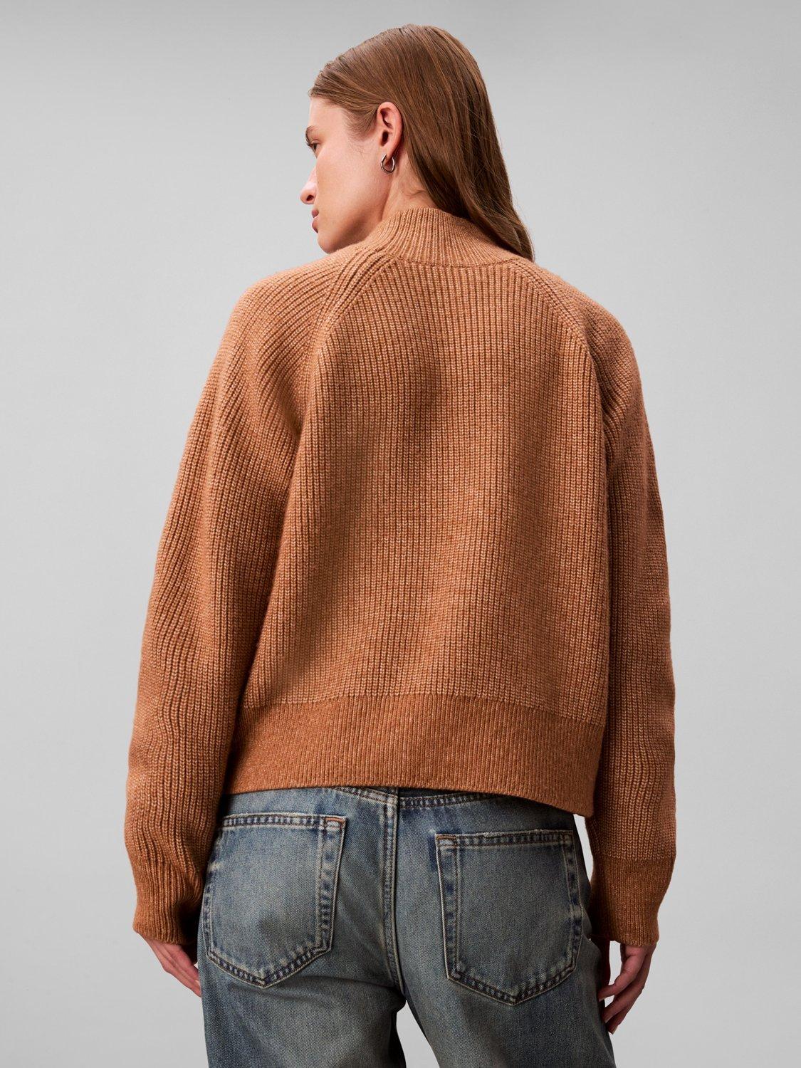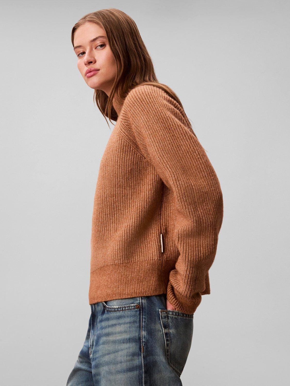 Crafted from a soft wool blend with a chunky ribbed texture, this Calvin Klein jumper has a comfortable regular fit, raglan sleeves, and a sleek mock neckline, and it's finished with a subtle logo tab at the hem.