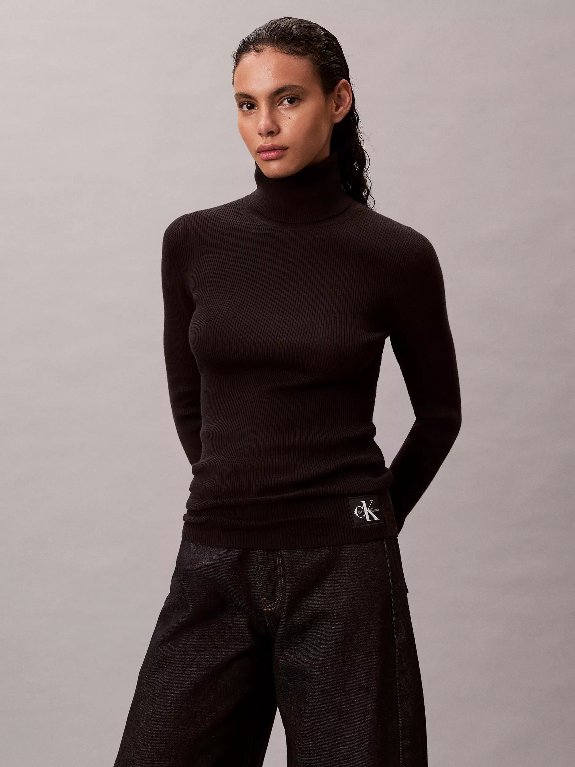 Calvin KleinWoven Label Roll Neck Top, Black