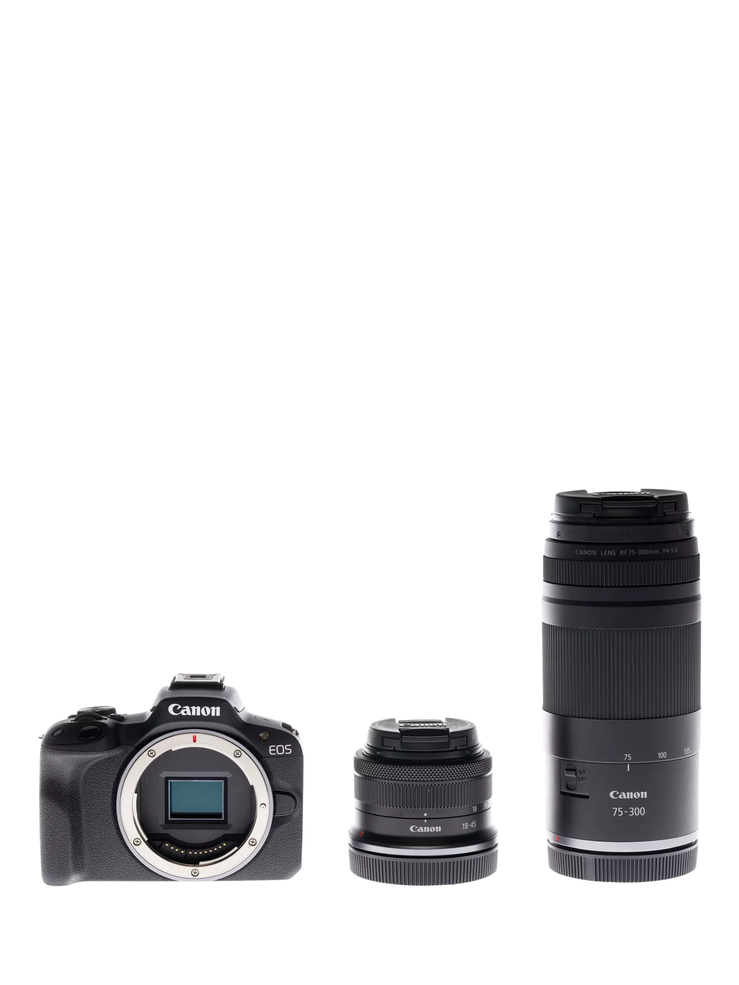 - EOS R50 Mirrorless Camera Body; RF-S 18-45mm F4.5-6.3 IS STM Lens;RF 75-300mm F4-5.6 Lens;Camera Cover R-F-5; Neck Strap EM-200DB; Battery Charger LC-E17E; Battery Pack LP-E17; Battery Pack Cover; AC Cable; Lens Cap E-49; Lens Cap E-55; Lens Dust Cap RF; Shoe Cover; User Manual Kit