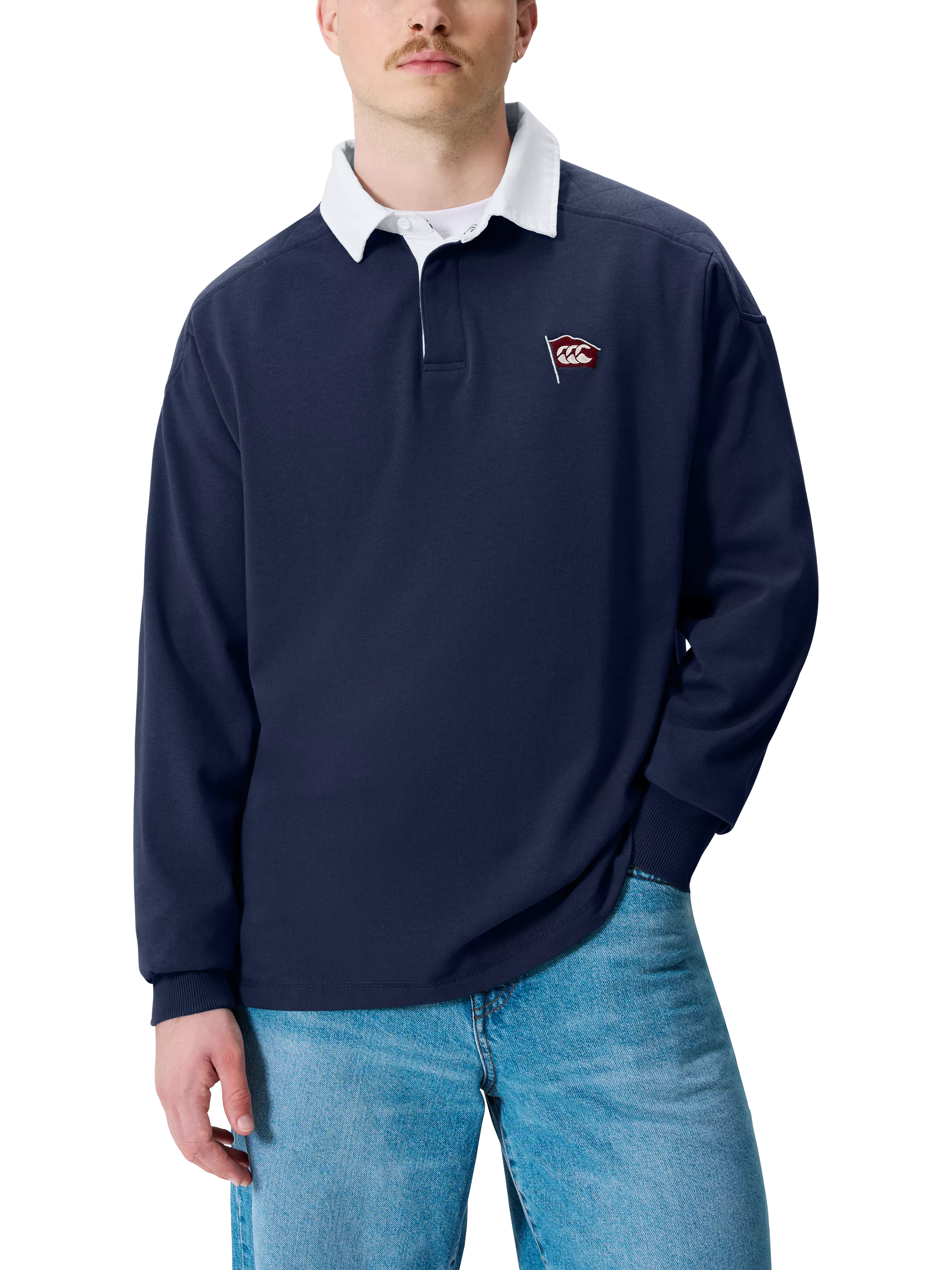 Quilted shoulder pads, a cotton drill collar with concealed placket, rib-knit cuffs, and a cover seam hem bring authentic rugby detailing, while embroidered chest branding and centre-back detailing honour the game’s legacy.