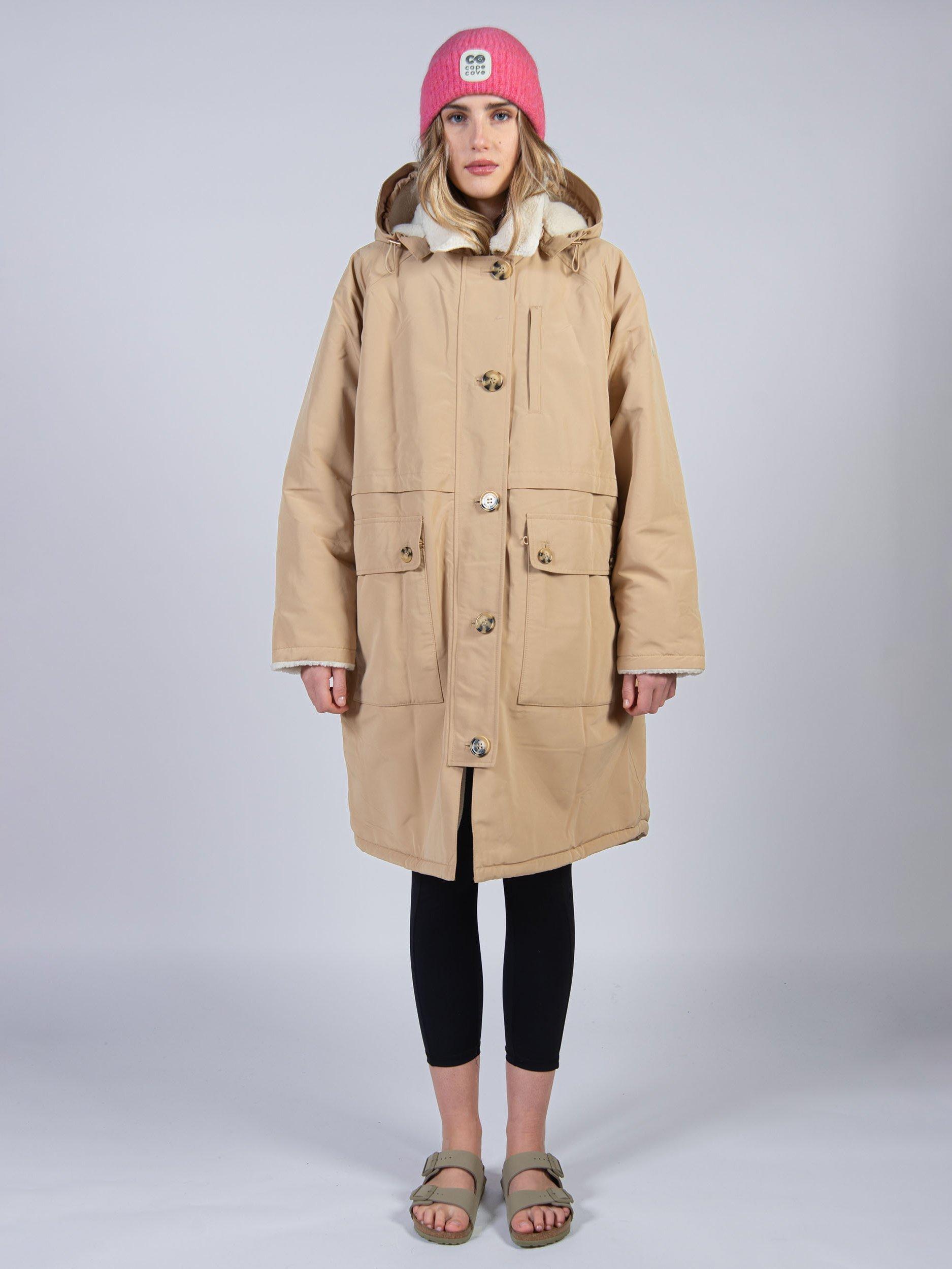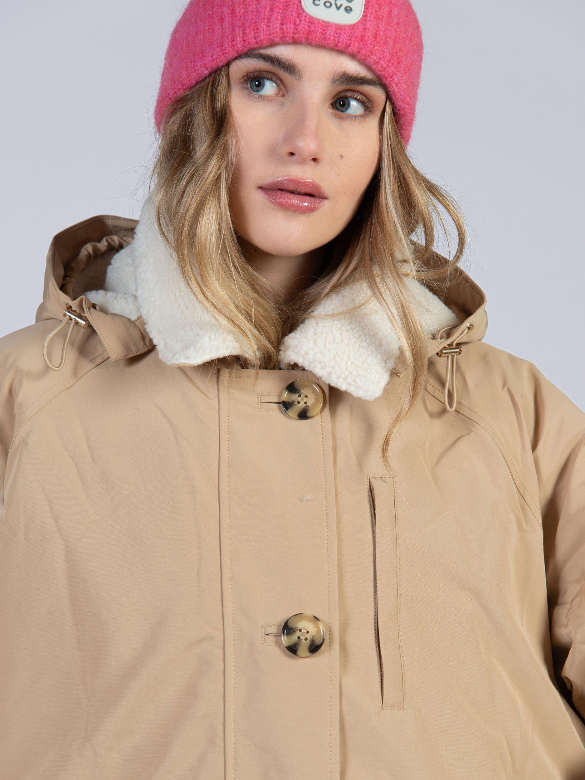 The coat includes an internal adjustable drawcord for waisted styling and large branded buttons that are ideal for cold hands. Finished with the Cape Cove logo badge on the left sleeve and a back split for easy wear. The sleeves are adjustable and have a hidden ribbed cuff. Just simply turn back the cuff to highlight the sherpa fleece inner. Additional features are the adjustable inside straps for easy carrying.