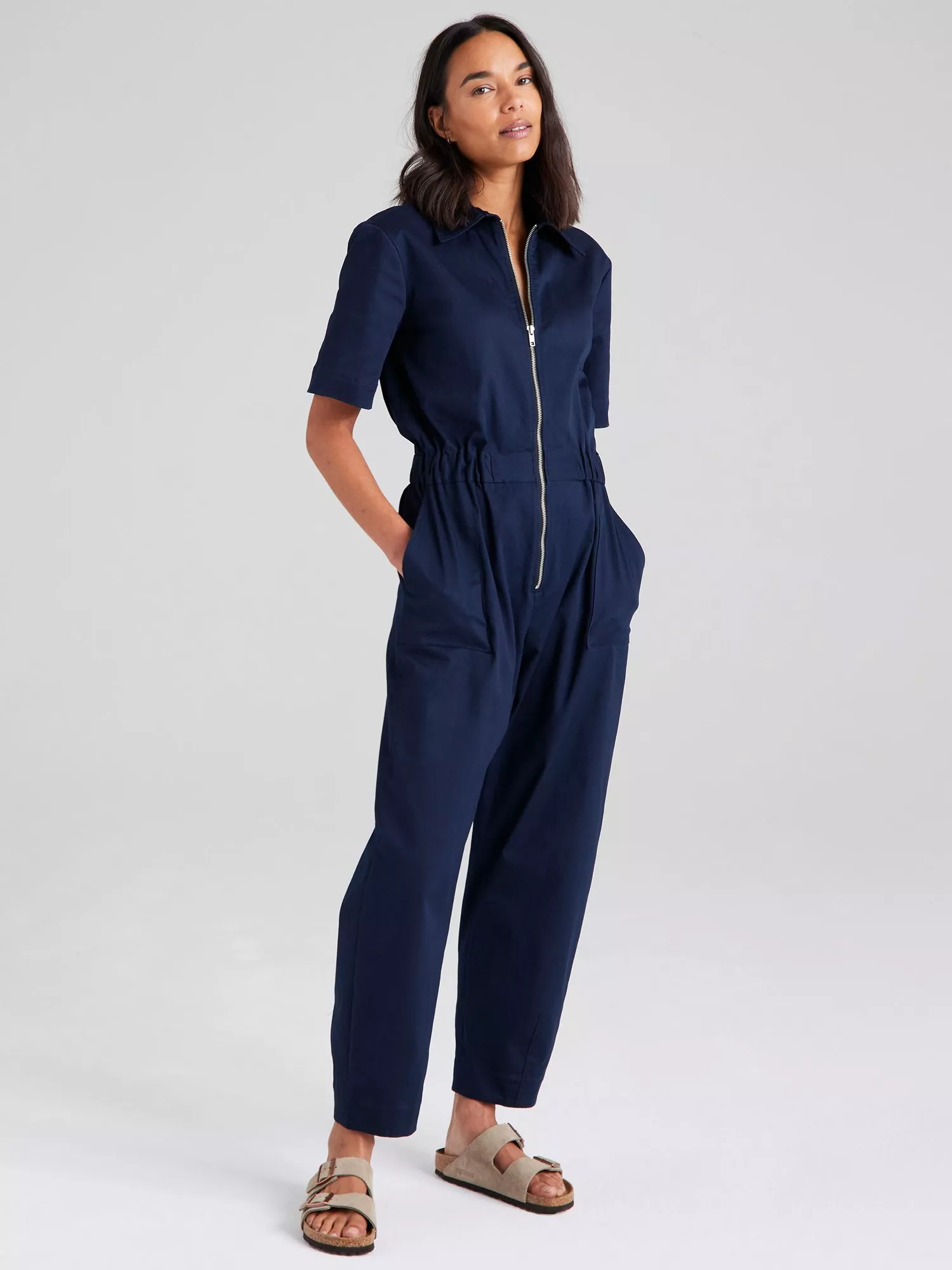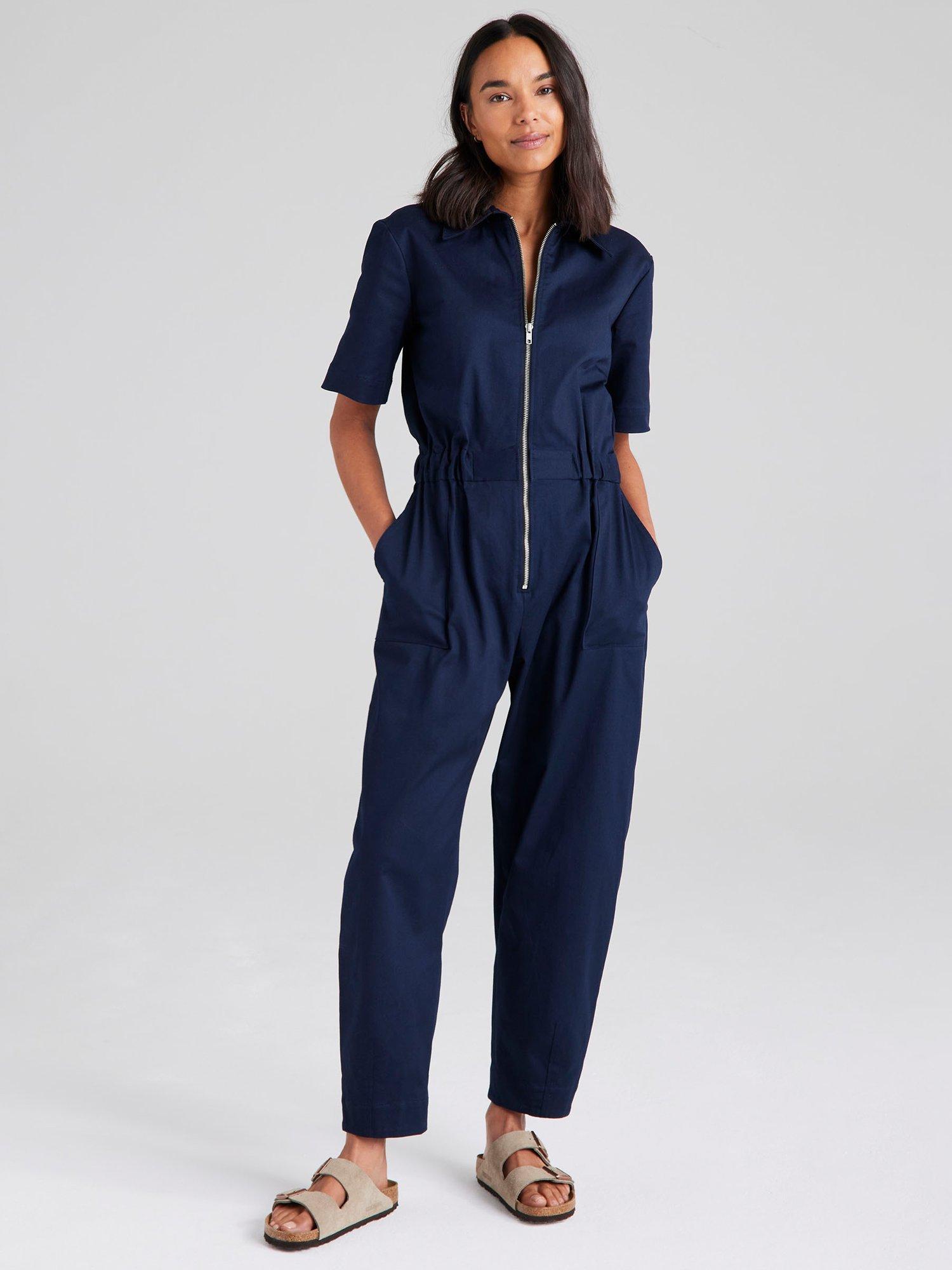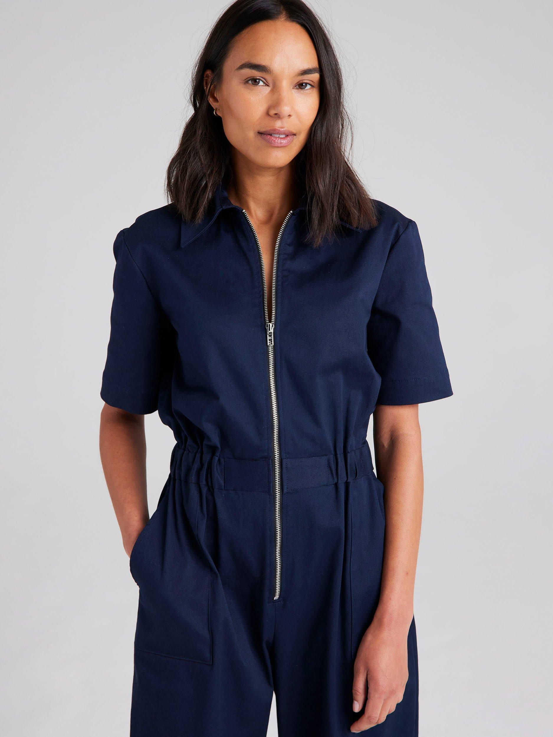 Crafted from cotton, this is an incredible throw-on jumpsuit. This jumpsuit has a collar, zip front, subtle barrel leg and elastic waist, creating an understated modern silhouette. This is our everyday go-to piece. It's easy to style with a generous short sleeve. Relaxed fit - if between sizes, we recommend sizing down.