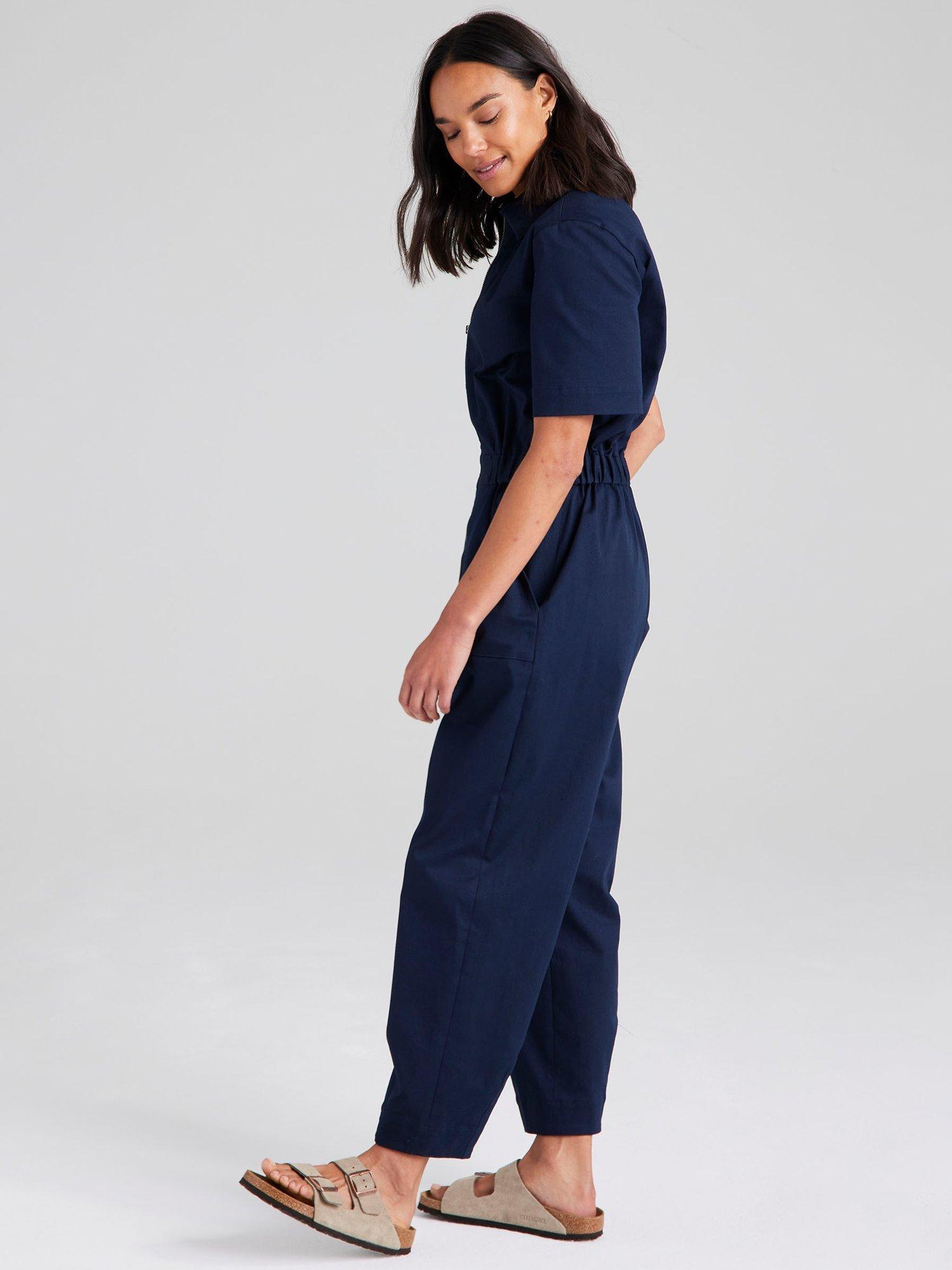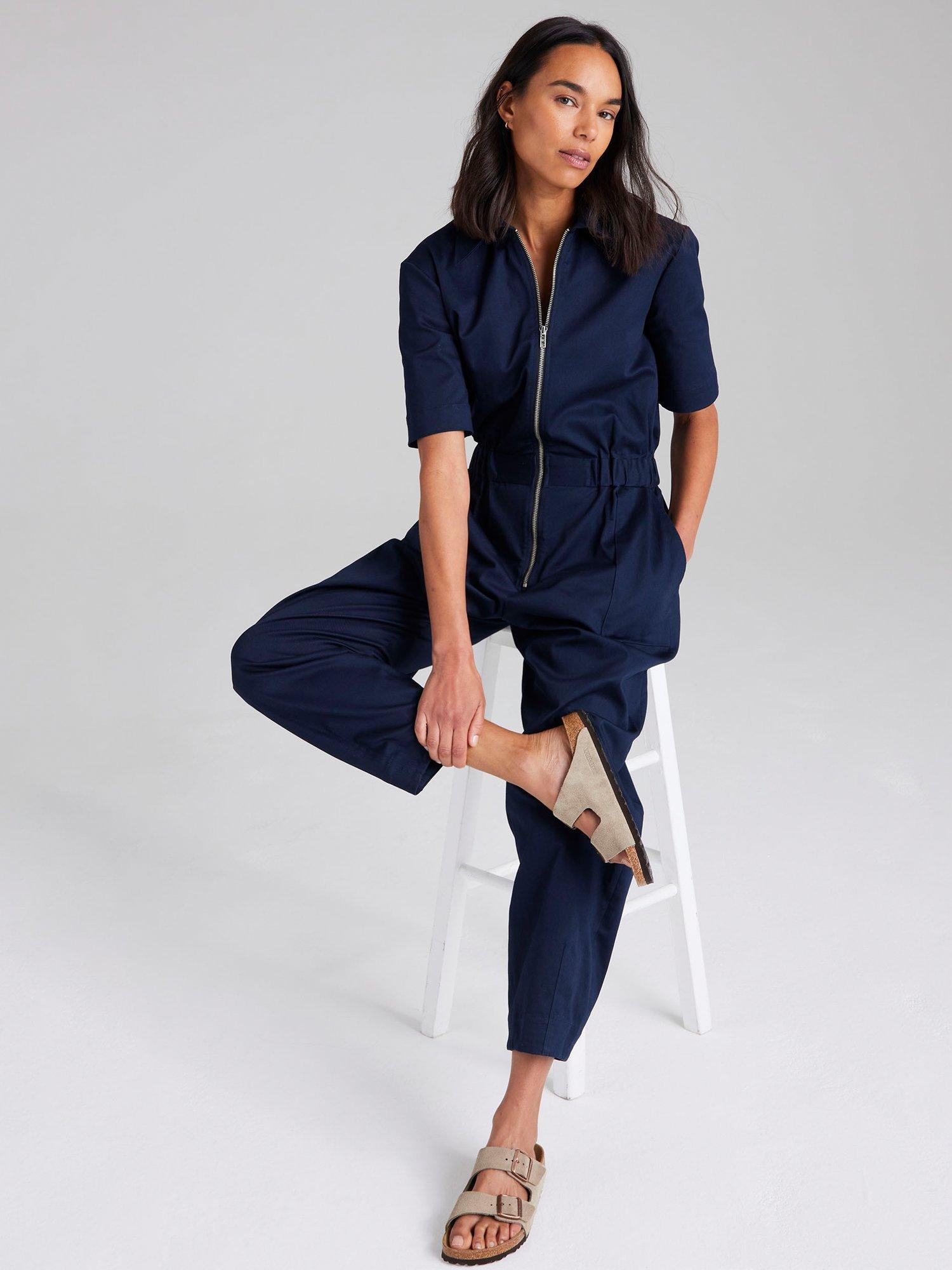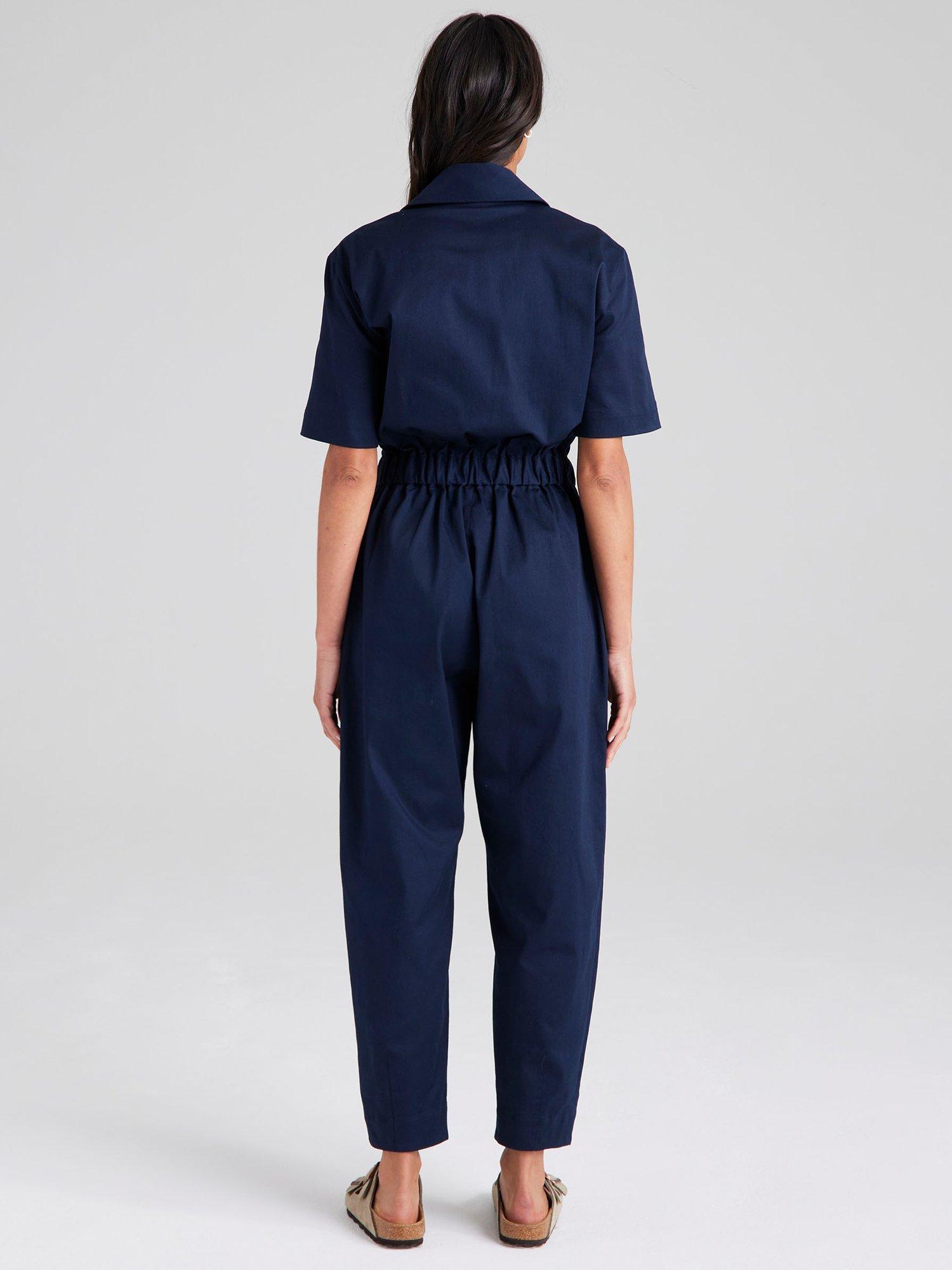 Crafted from cotton, this is an incredible throw-on jumpsuit. This jumpsuit has a collar, zip front, subtle barrel leg and elastic waist, creating an understated modern silhouette. This is our everyday go-to piece. It's easy to style with a generous short sleeve. Relaxed fit - if between sizes, we recommend sizing down.