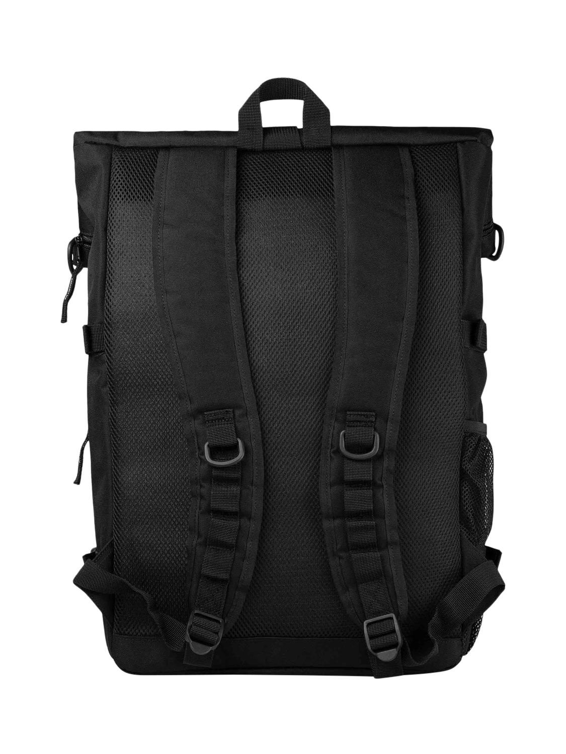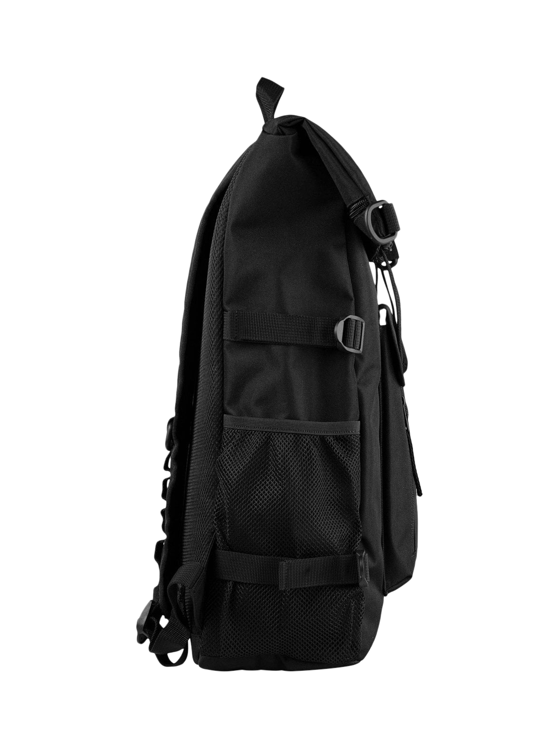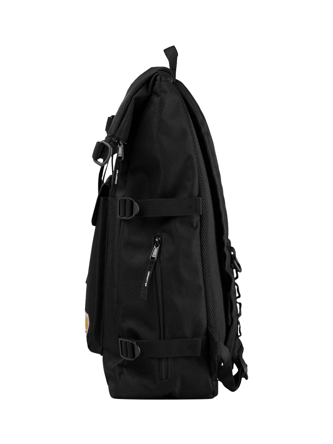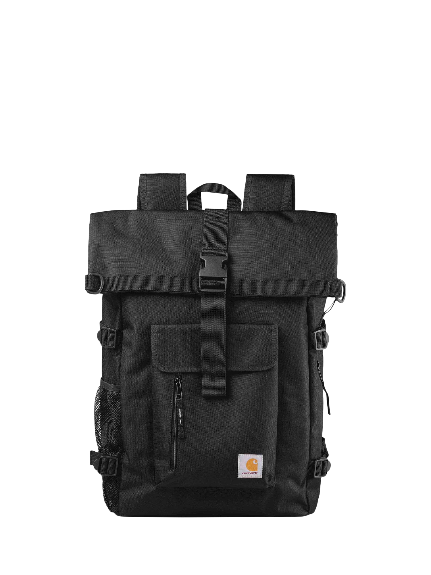The Philis Backpack is an expandable style constructed from water-repellent, recycled polyester canvas. It features an unlined main compartment with a zip and flap closure, a padded inside pocket, and adjustable shoulder straps.