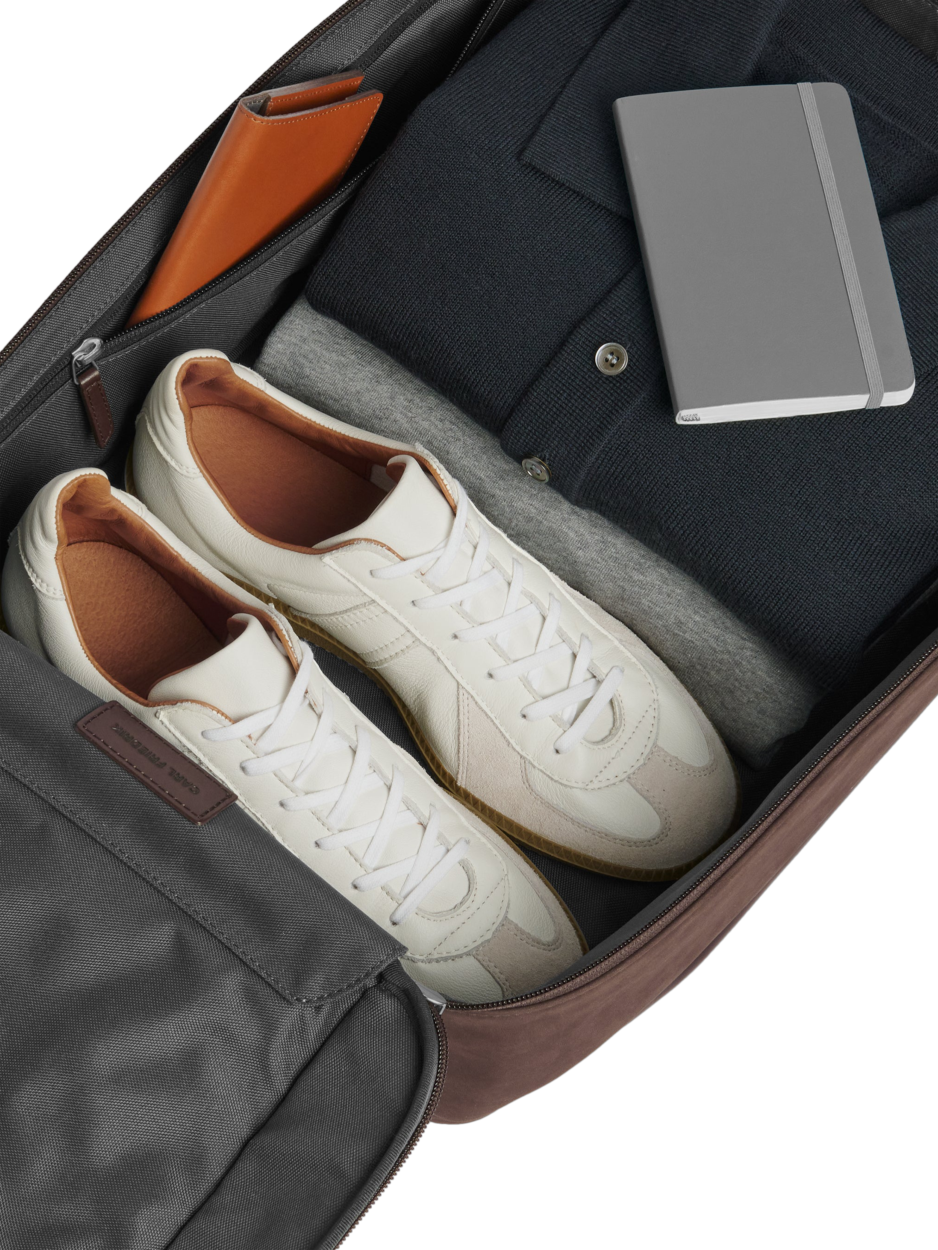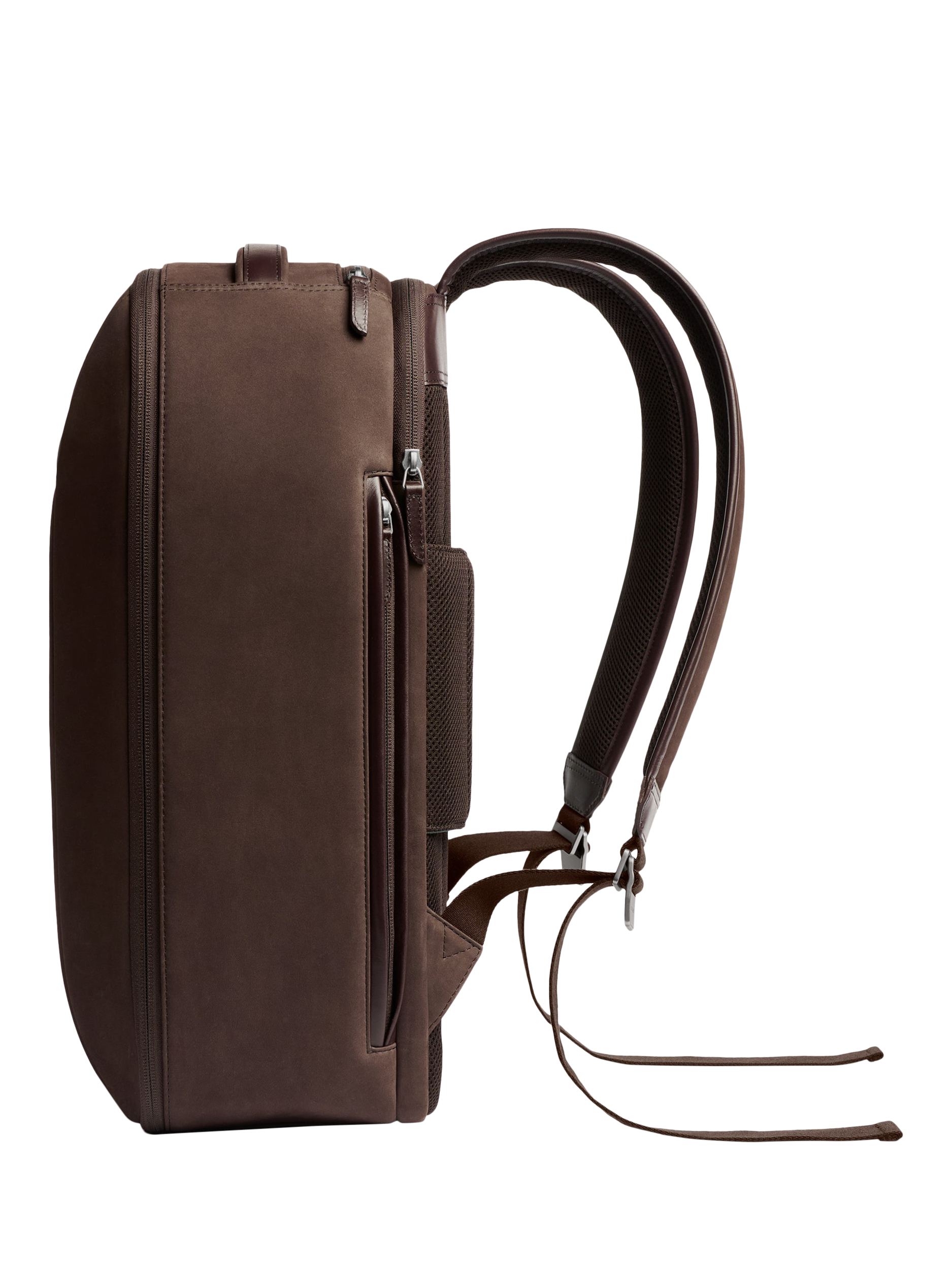 Organisational travel backpack with a front panel that fully unzips, offering an efficient suitcase-style packing experience. Designed for up to 72 hours of hands-free travel, featuring comfortable, padded, and adjustable straps. Made from premium nubuck leather.