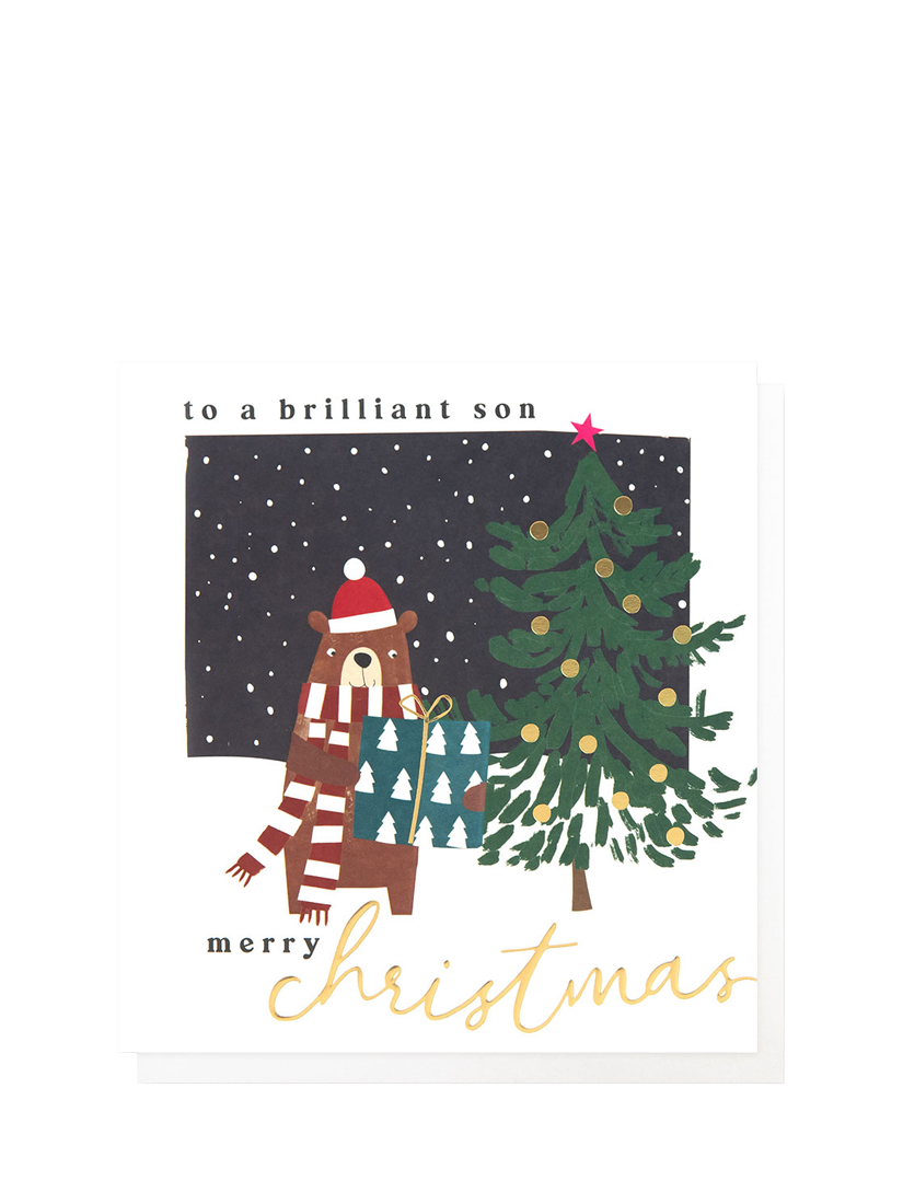 A greetings card from Caroline Gardner for your son that is perfect for celebrating Christmas. With a message inside that reads, Merry Christmas and a Happy New Year, this card comes with a white envelope.