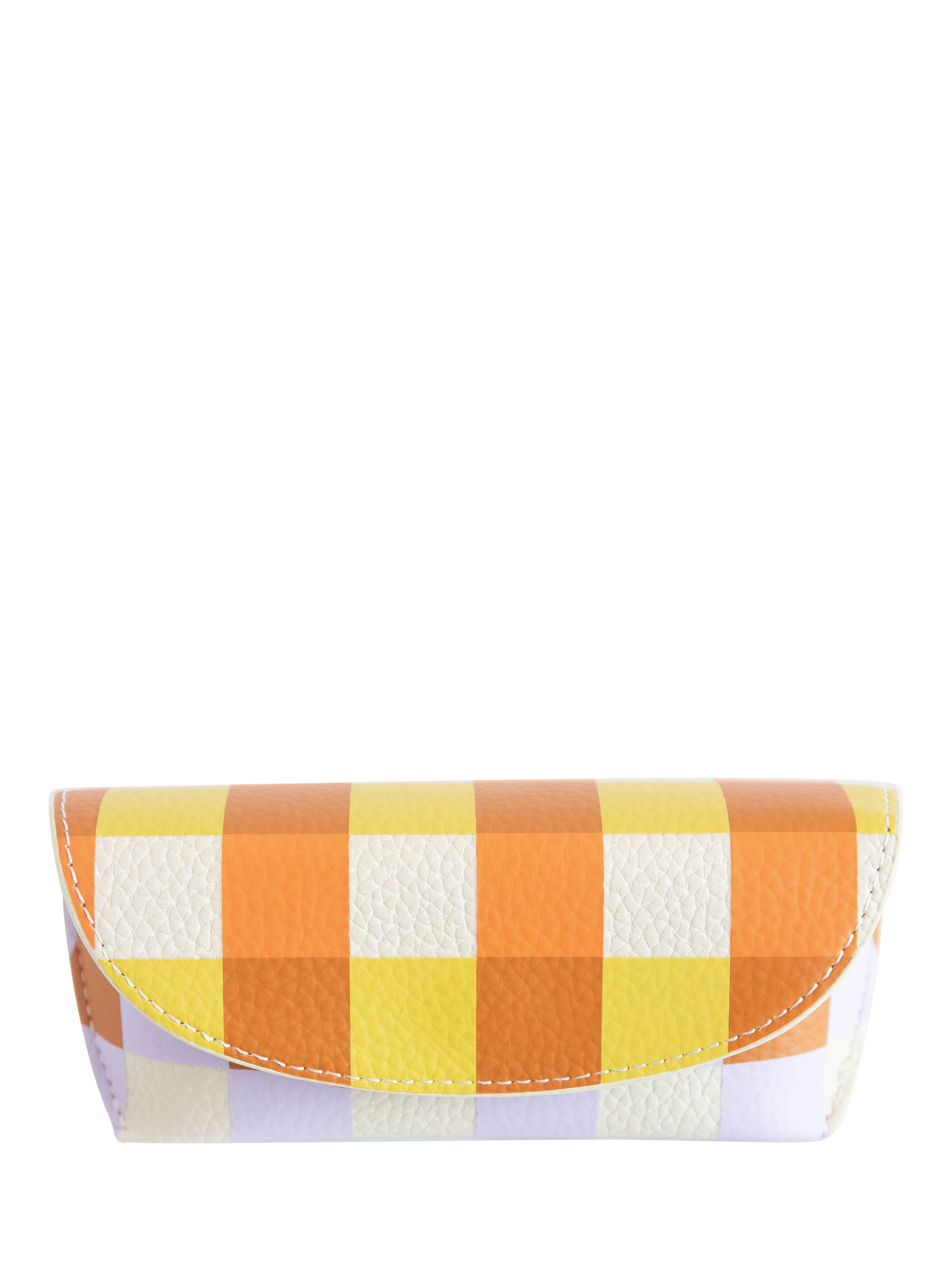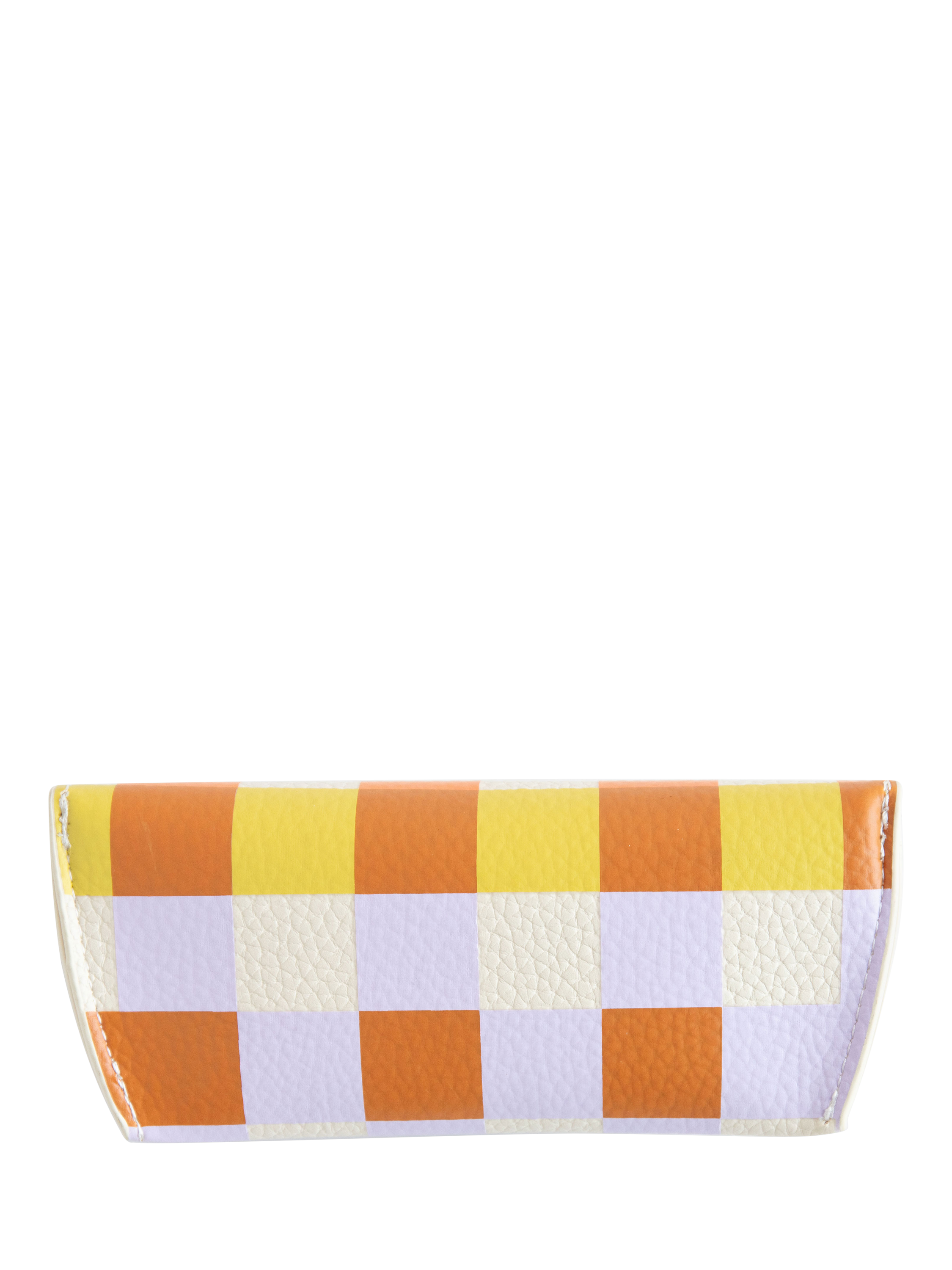 Store your glasses or sunglasses in style with this leather look colourful Multi Check flap case. This suede-lined semi-hard case with a built-in nose piece is sure to keep your specs safe.